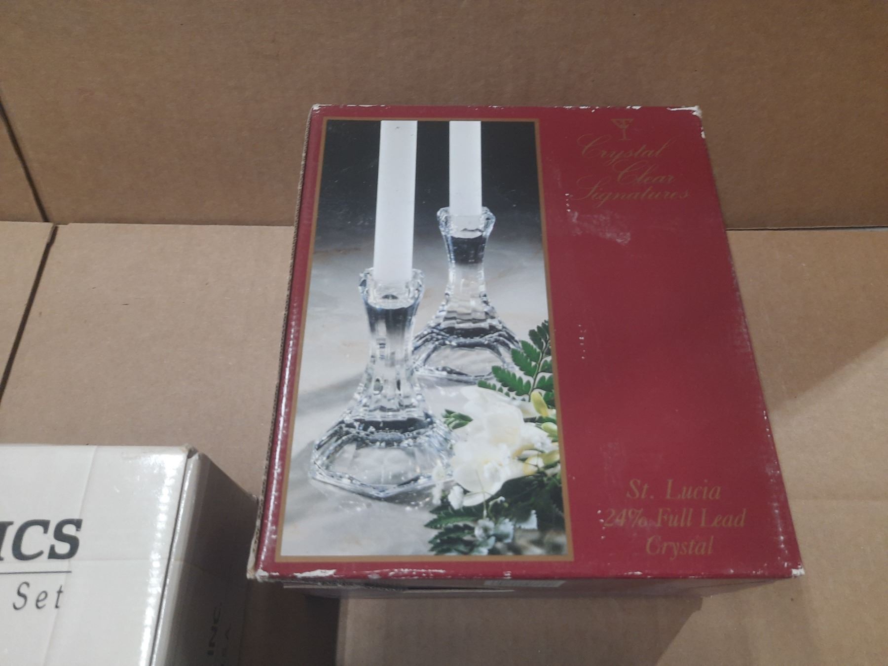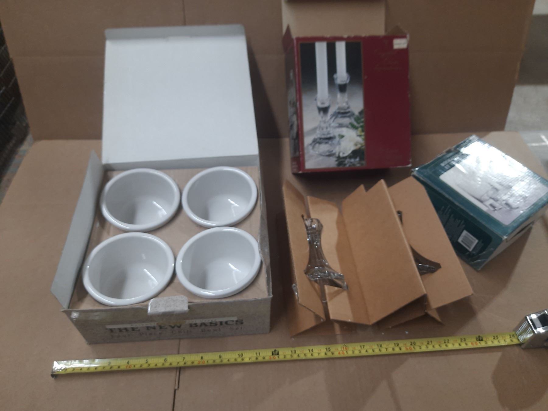 The New Basics Four Piece Chilli Bowl Set (New), Round Shape Clear Glass Holder (New) and Pair of Crystal Clear Candle Holders. (New)