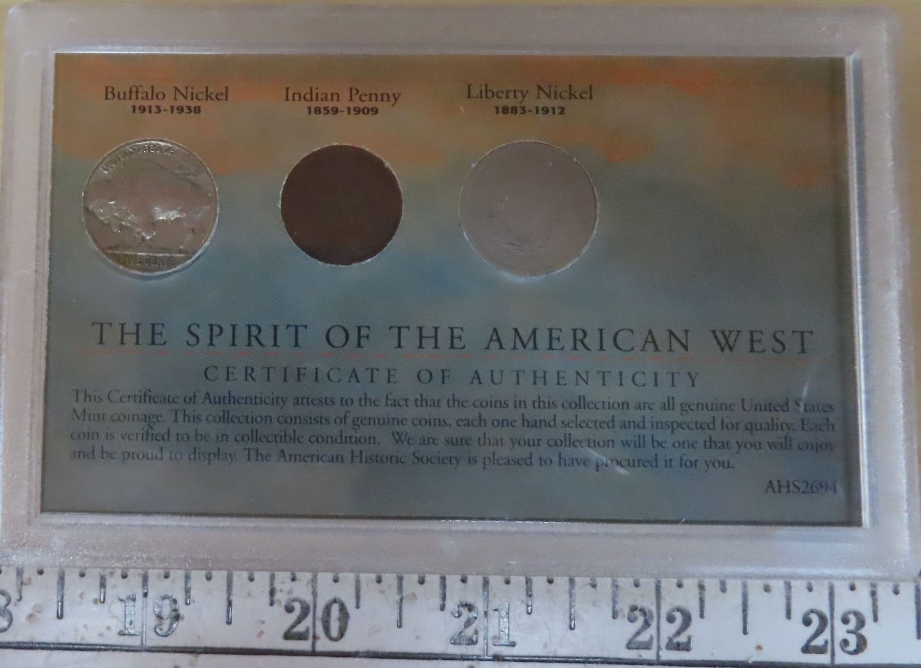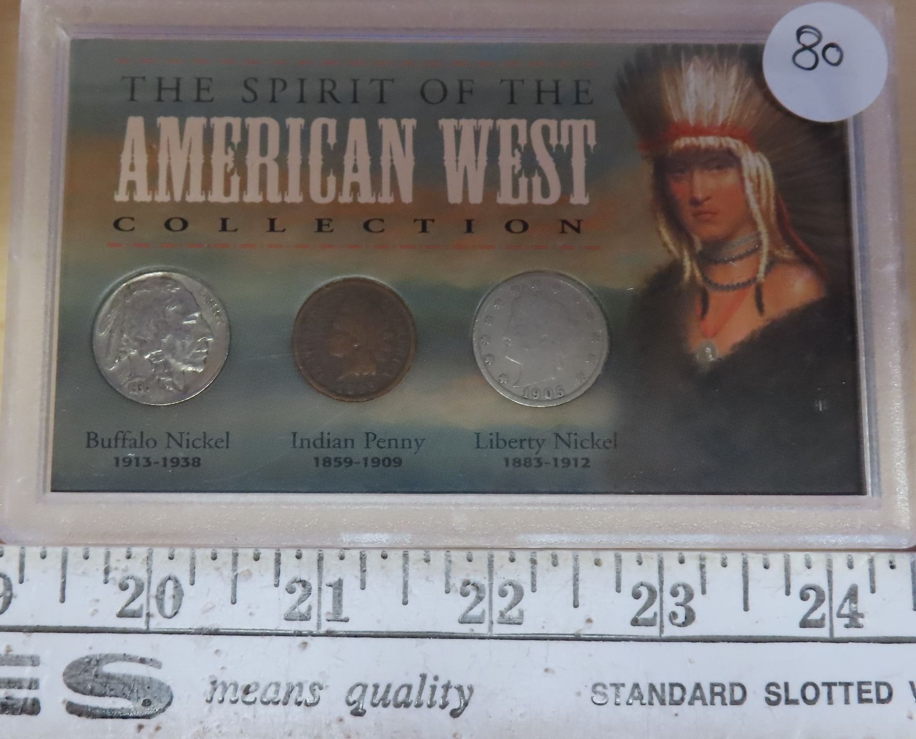 The Spirit of the American West Collection. Includes 1893 Indian Head Cent 1905 Liberty Nickel & 1936 Buffalo Nickel. Housed in a hard plastic case.
