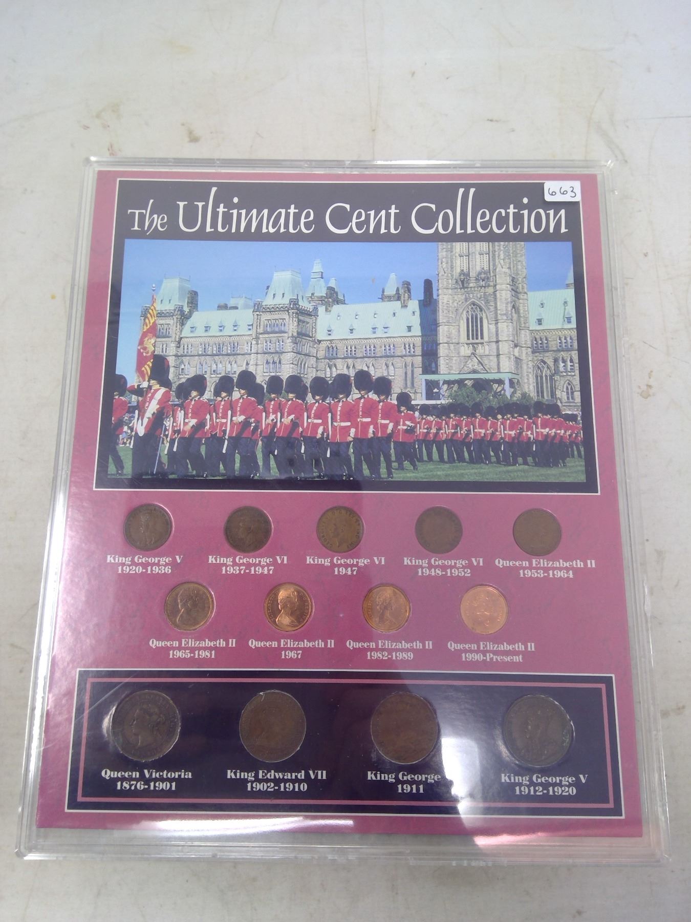 The Ultimate Cent Collection: 9 different Canadian small cents from George V, George VI & Queen Elizabeth, as well as 4 large cents from Victoria, Edward VII, George V and George VI. The 5 Monarchs are displayed in a large Morgan Mint hard plastic holder. 3 coins are BU Red.
