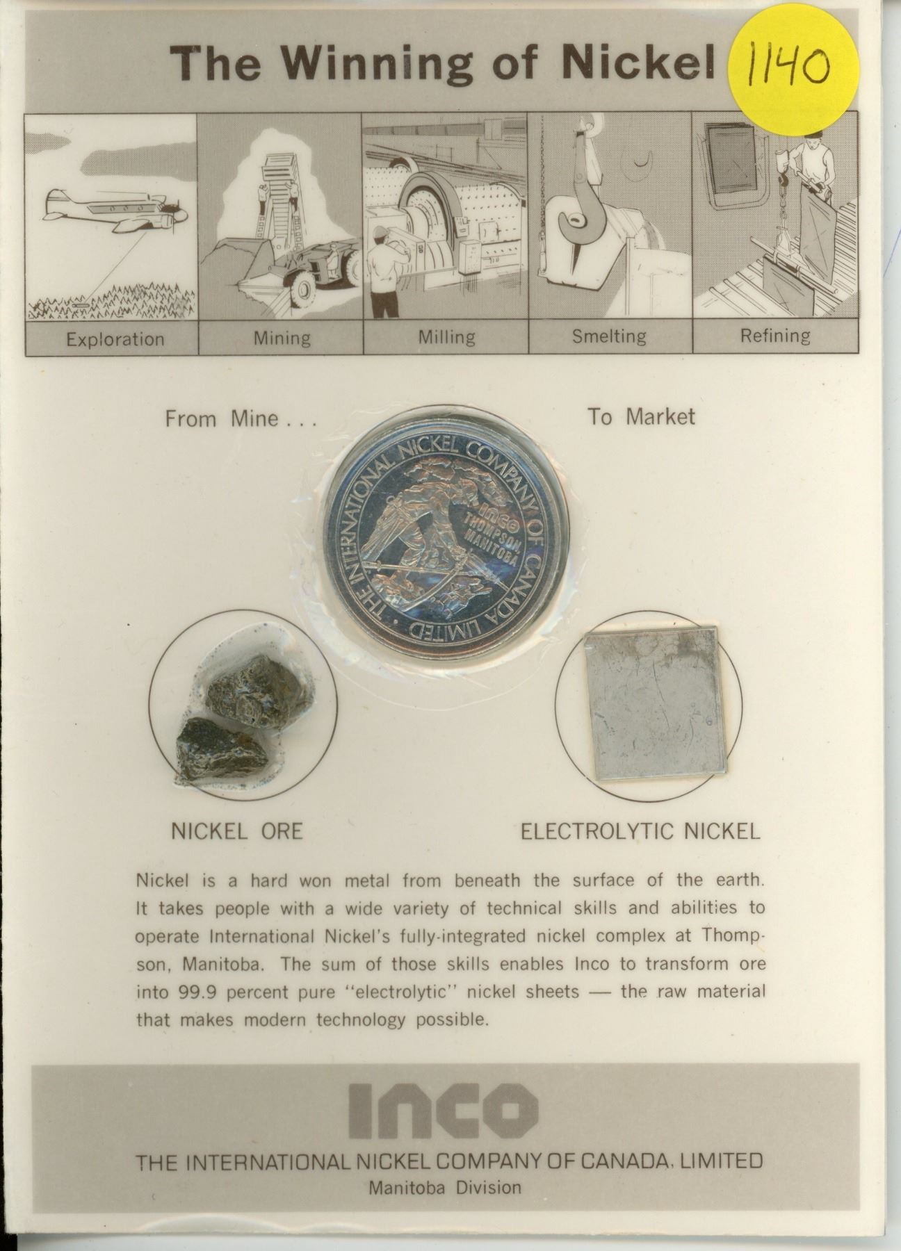 The Winning of Nickel. Consists of nickel ore, electrolytic nickel & 1974 INCO medal. Produced by INCO Manitoba.