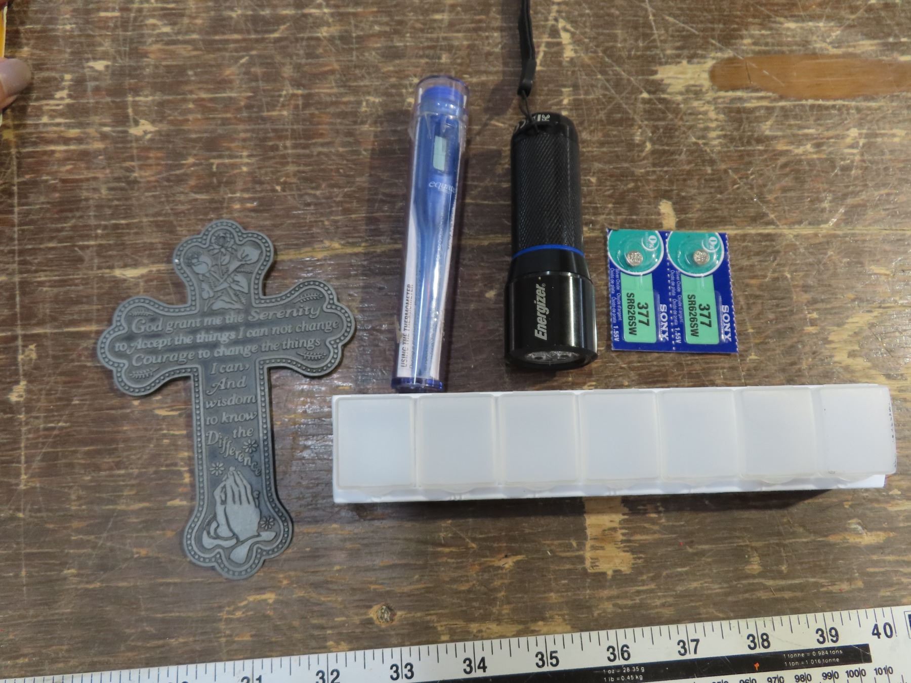 Thermometer, LED lights, watch batteries, oven lock, pill box, serenity prayer