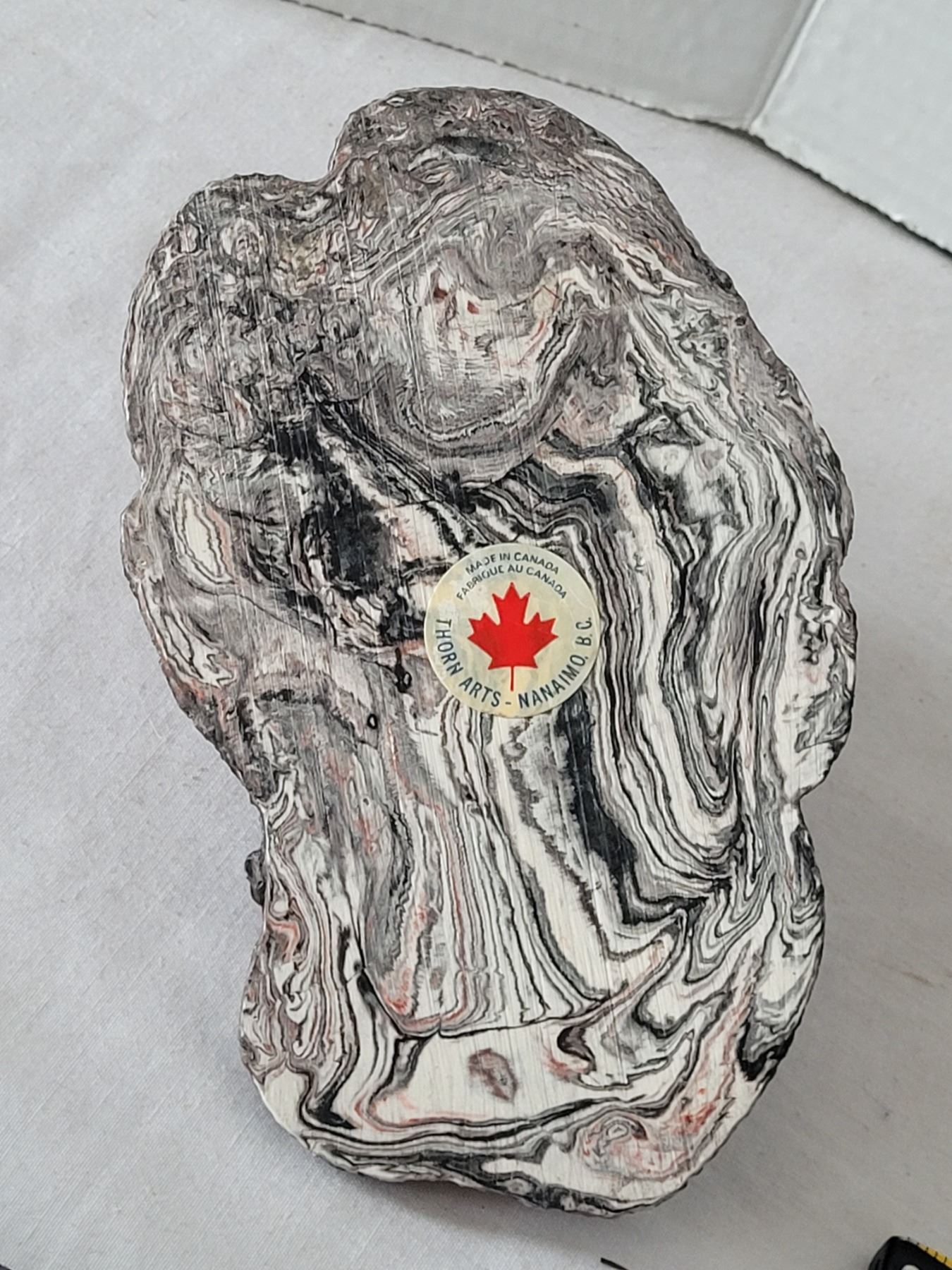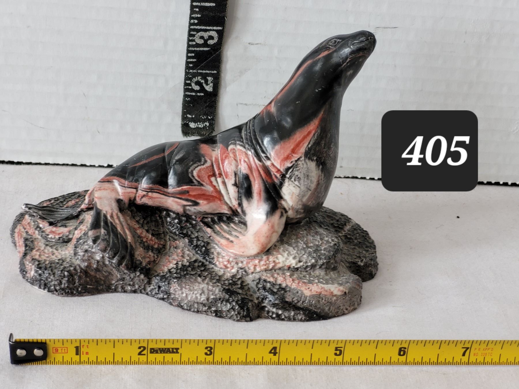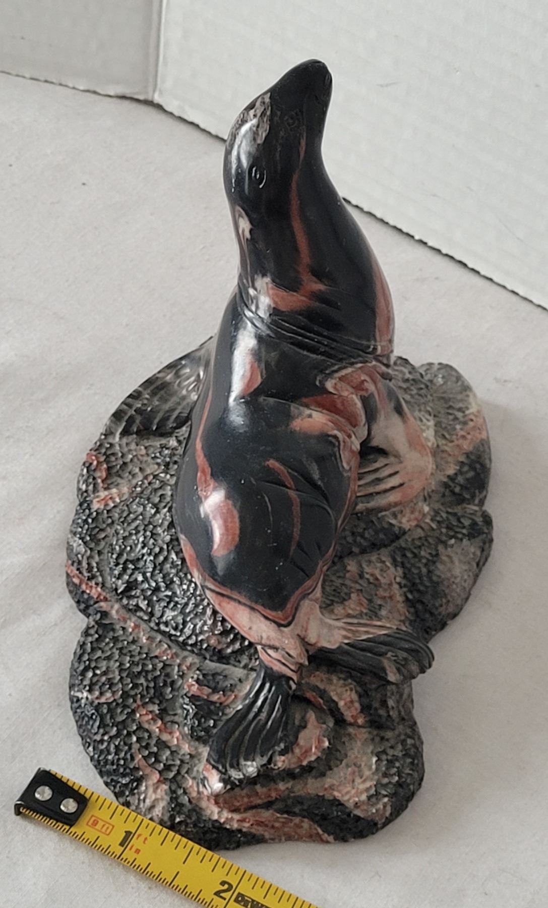 Thorn Arts sea lion sculpture made from an unusual swirled stone material. Canada.