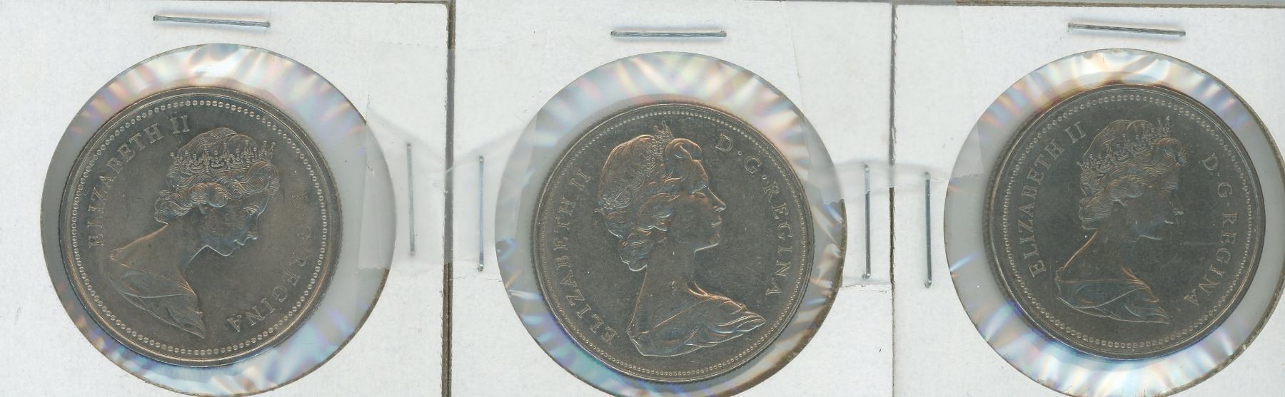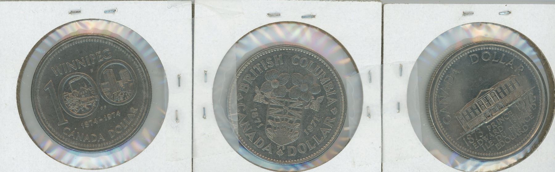 Three Canadian Dollars: British Columbia (1871-1971), Winnipeg (1874-1974), and PEI (1873-1973)