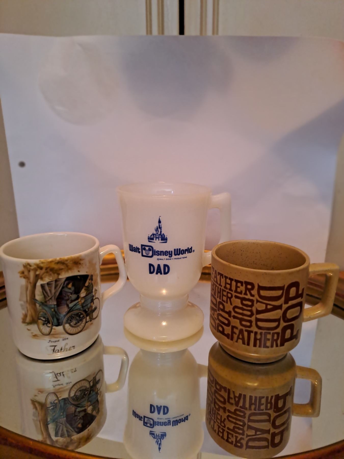 Three Vintage Father Mugs, ceramic and glass, and Walt Disney World (mirror NOT included)