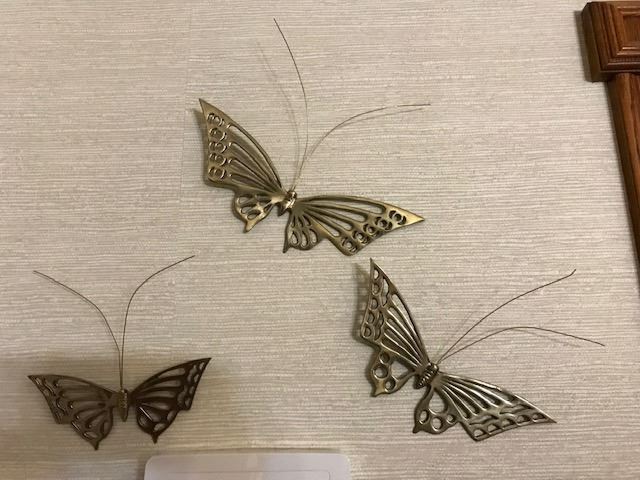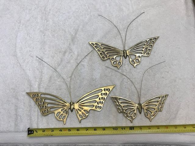 Three brass butterflies. Biggest one’s wing span 11” (28.5 cm). No polishing required. Excellent condition.
