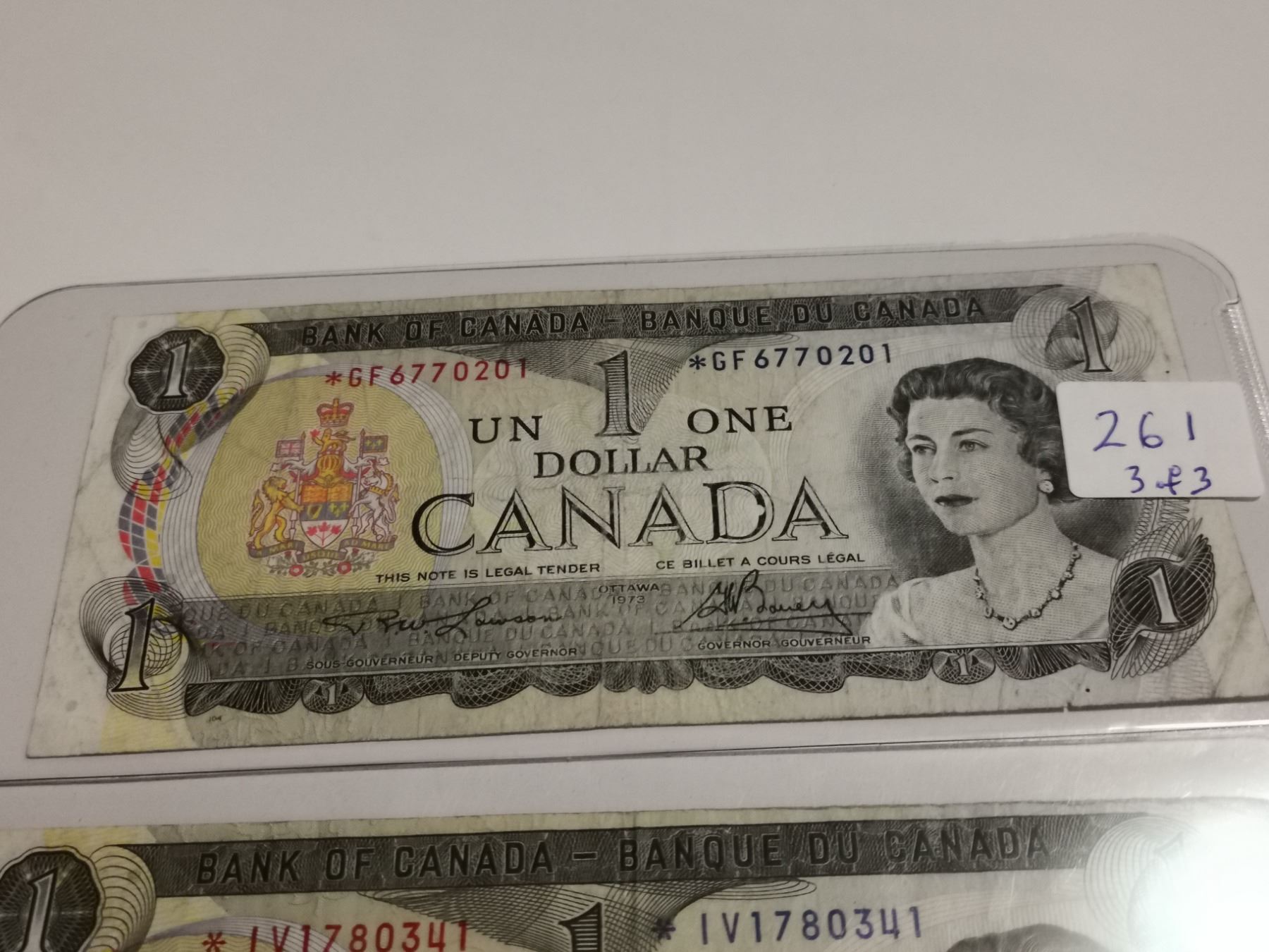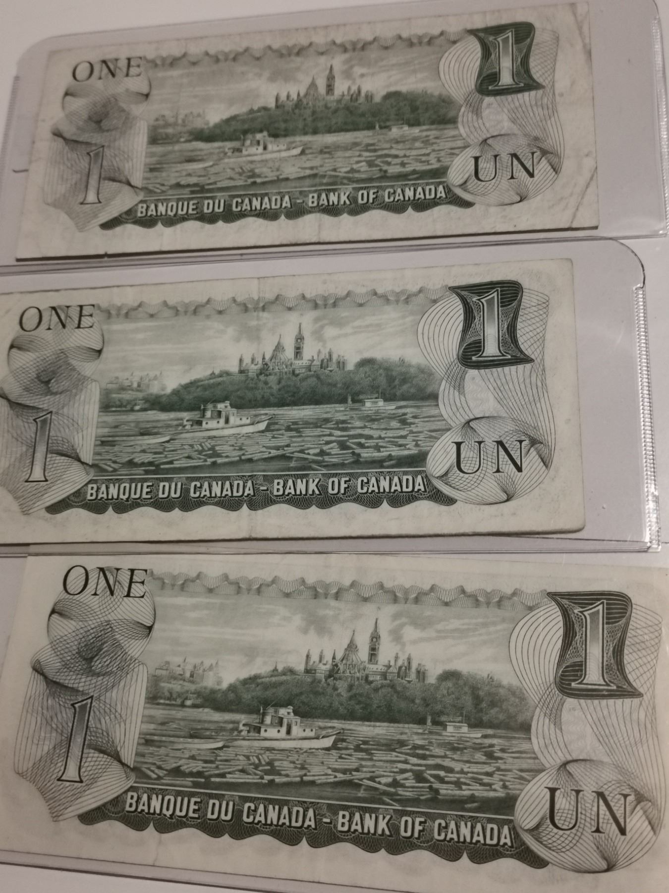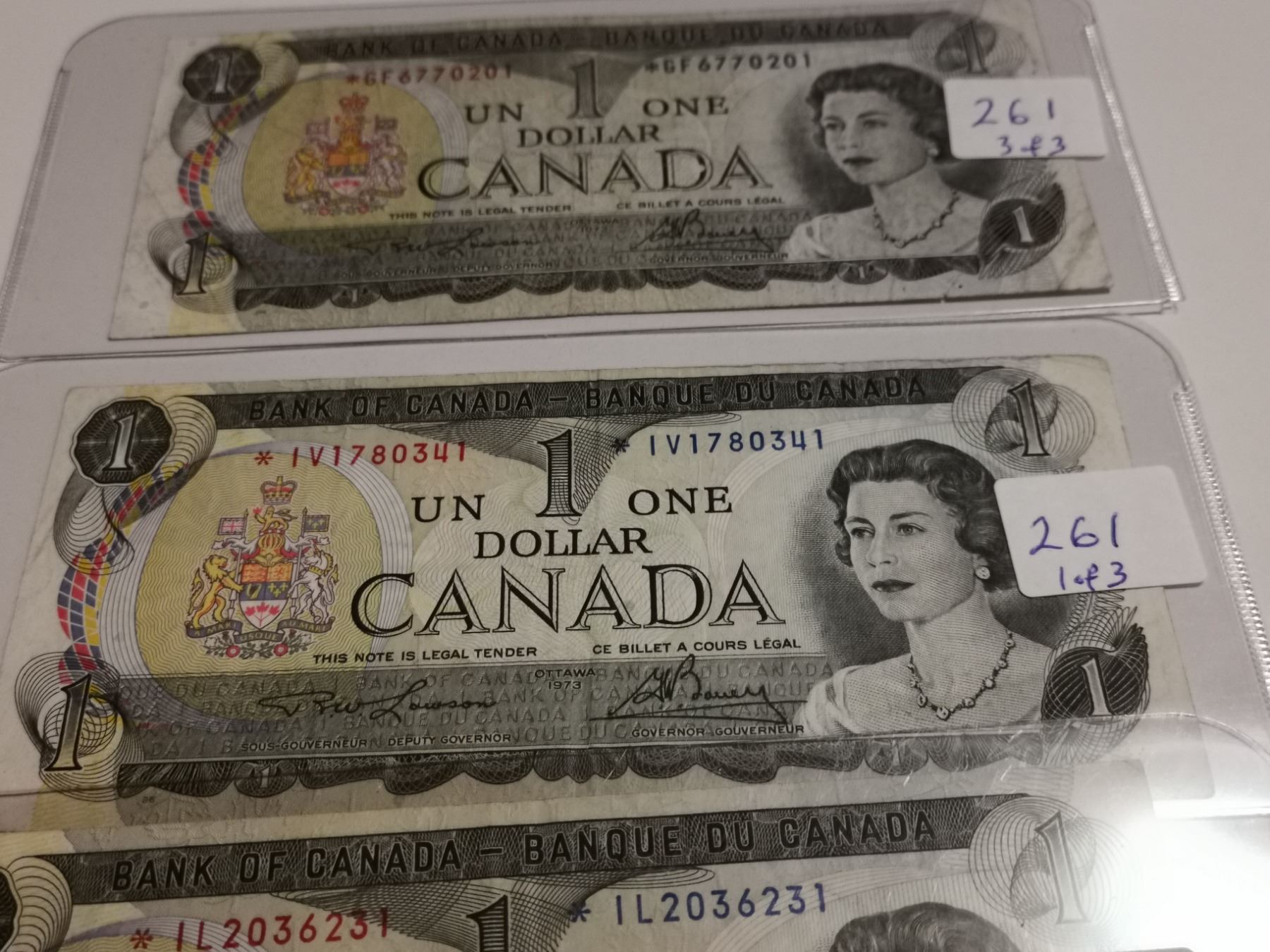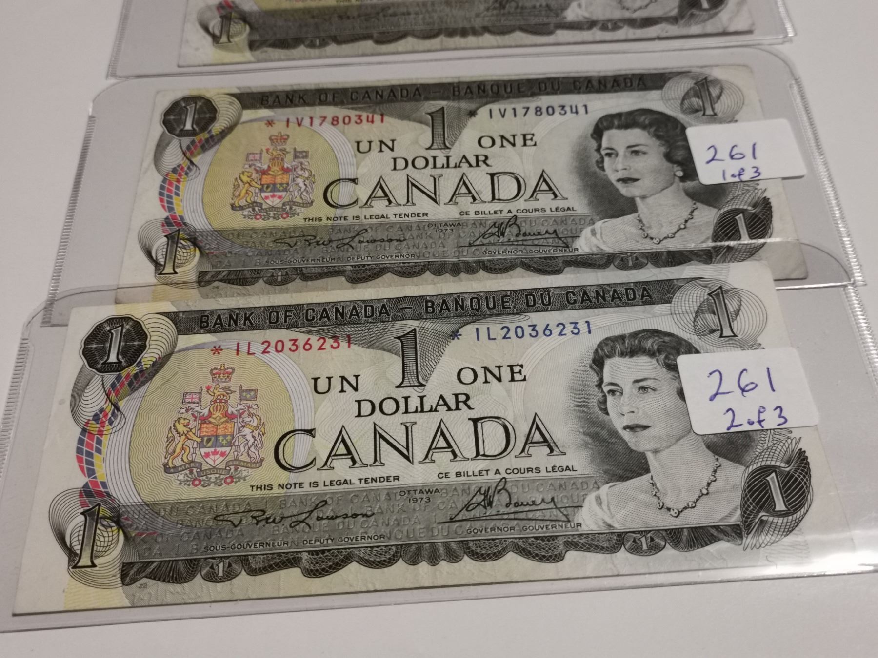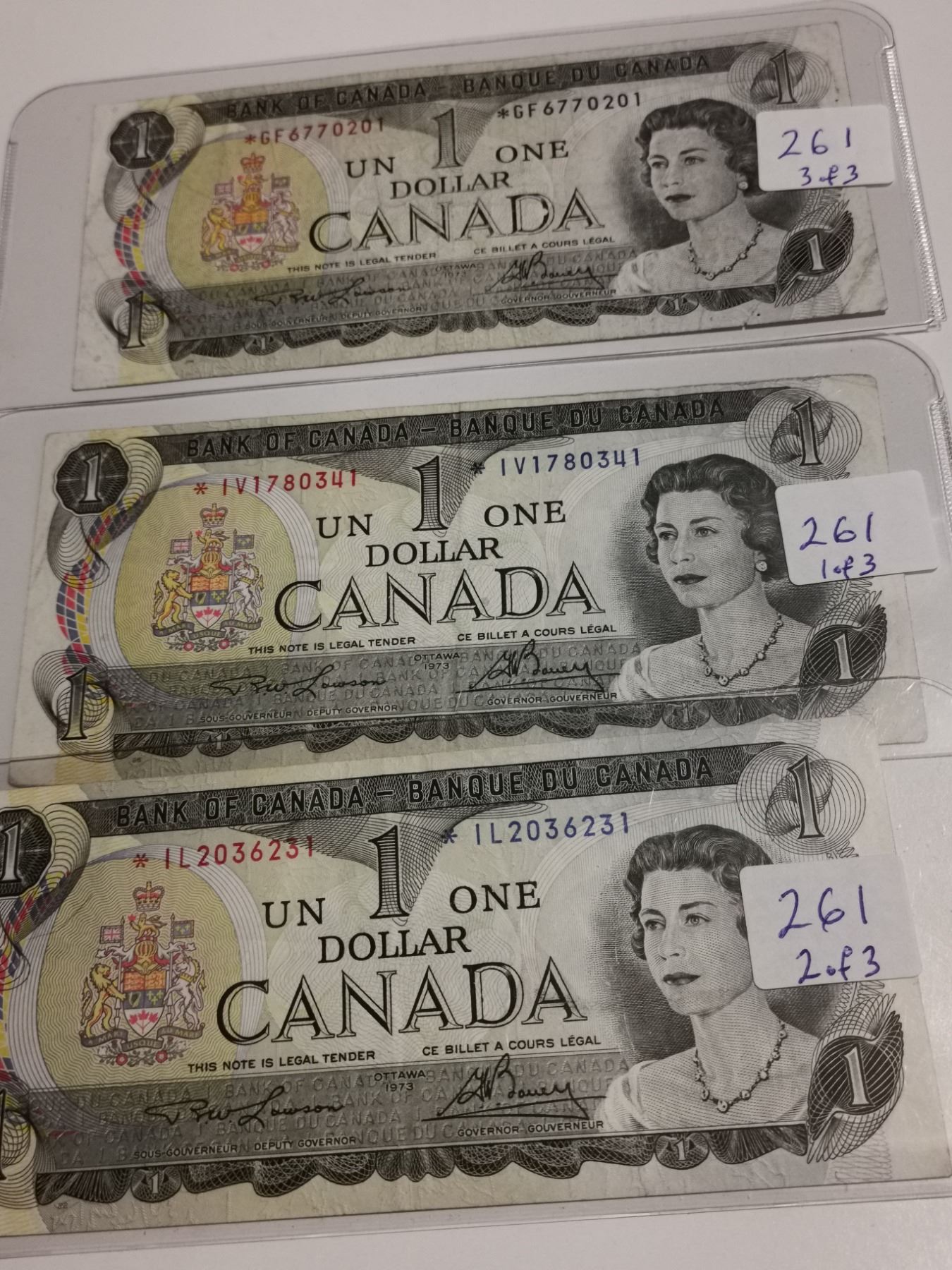 Three replacement 1973 $1 bills, different prefixes