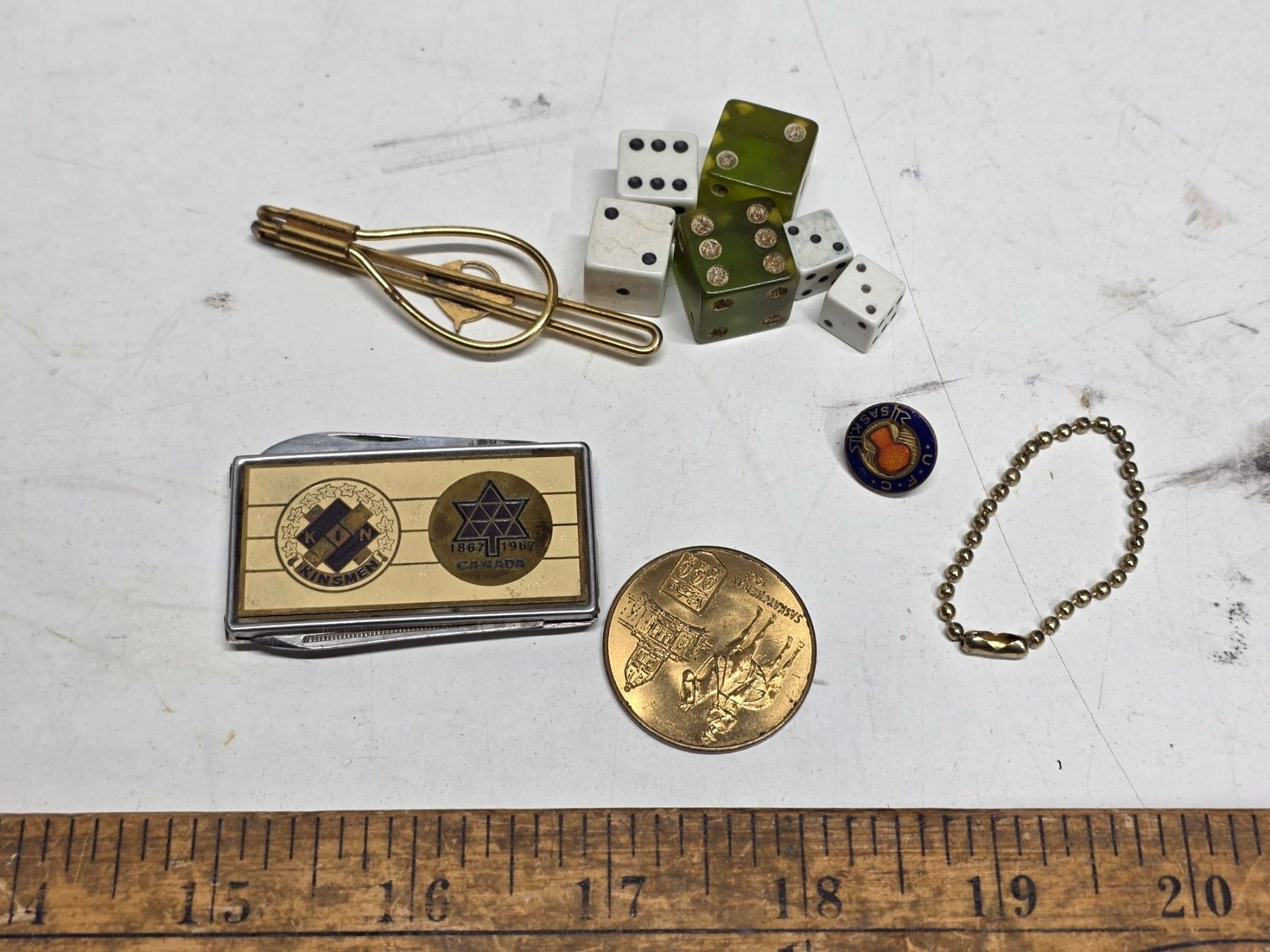 Tie clip, dice, token, pin