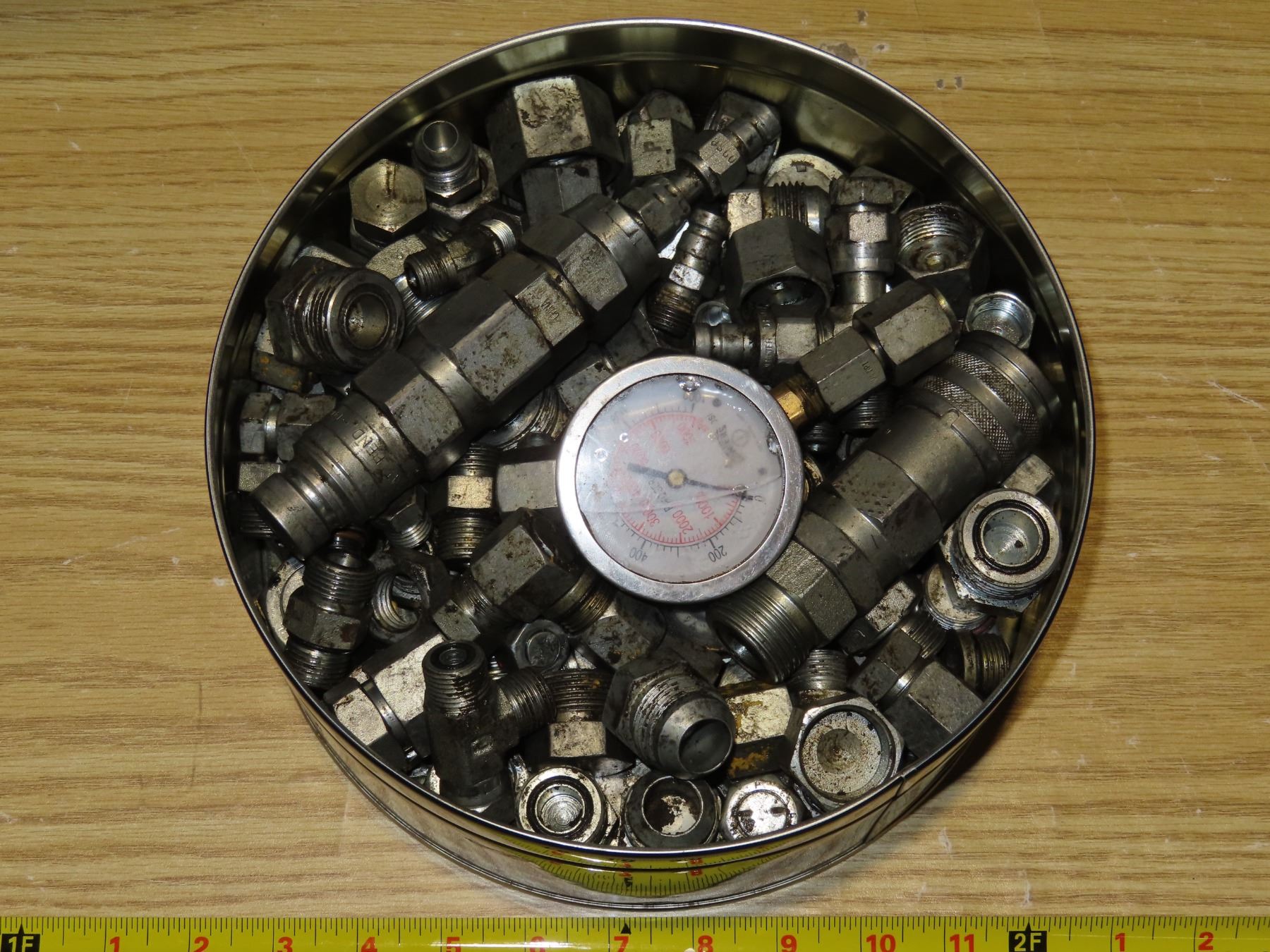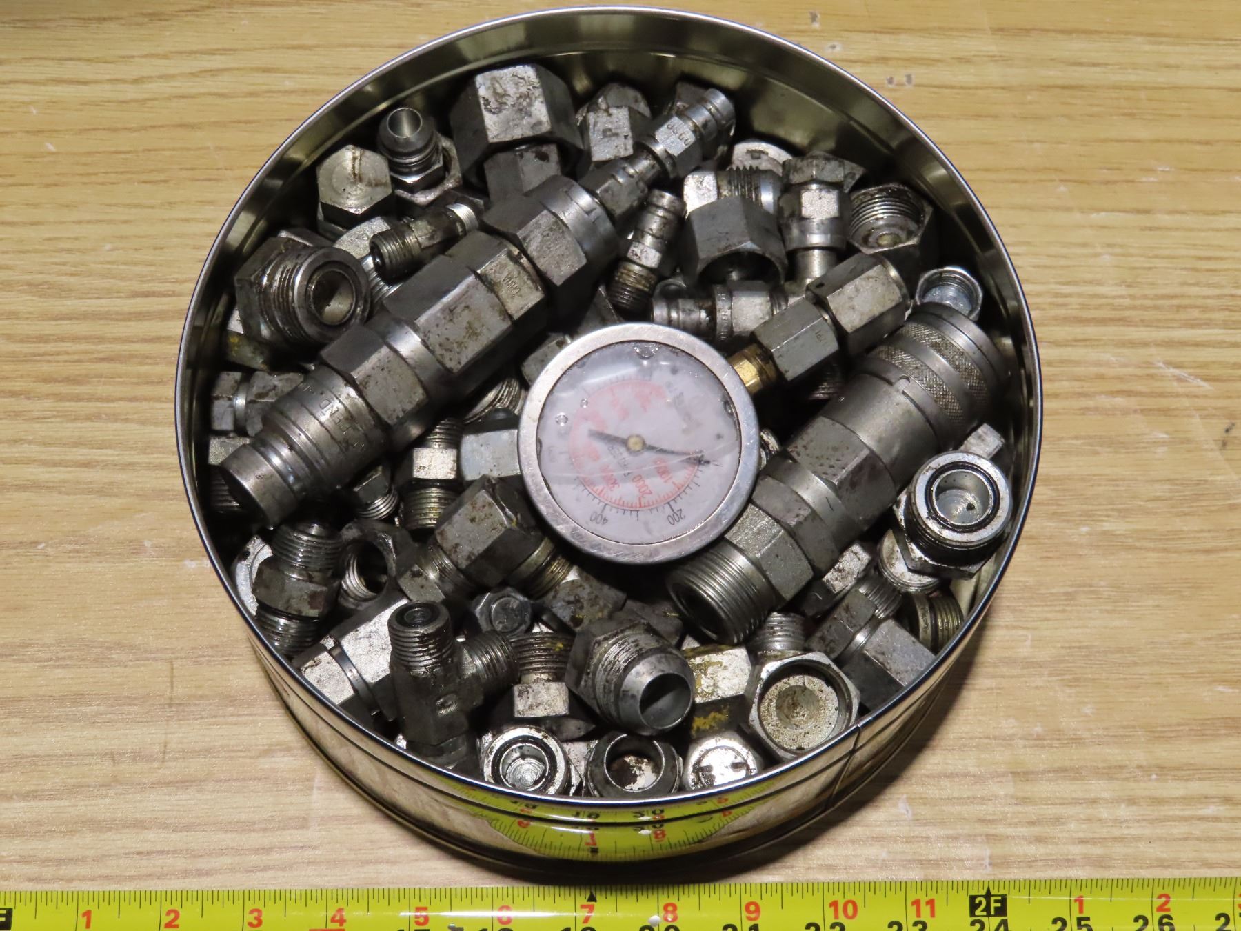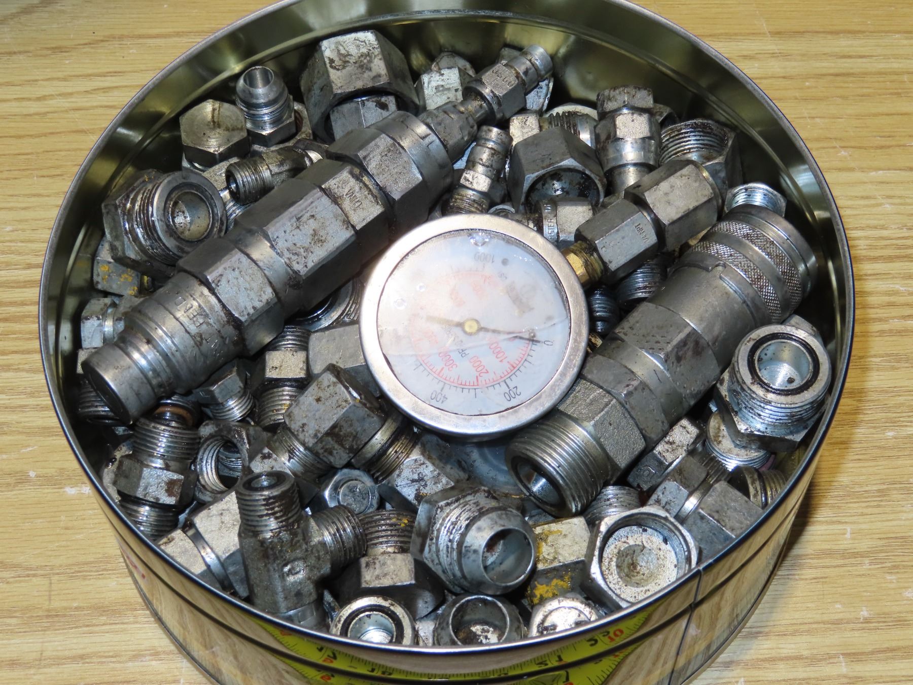 Tin full of fittings and caps - about 35lbs -includes oil pressure gauge