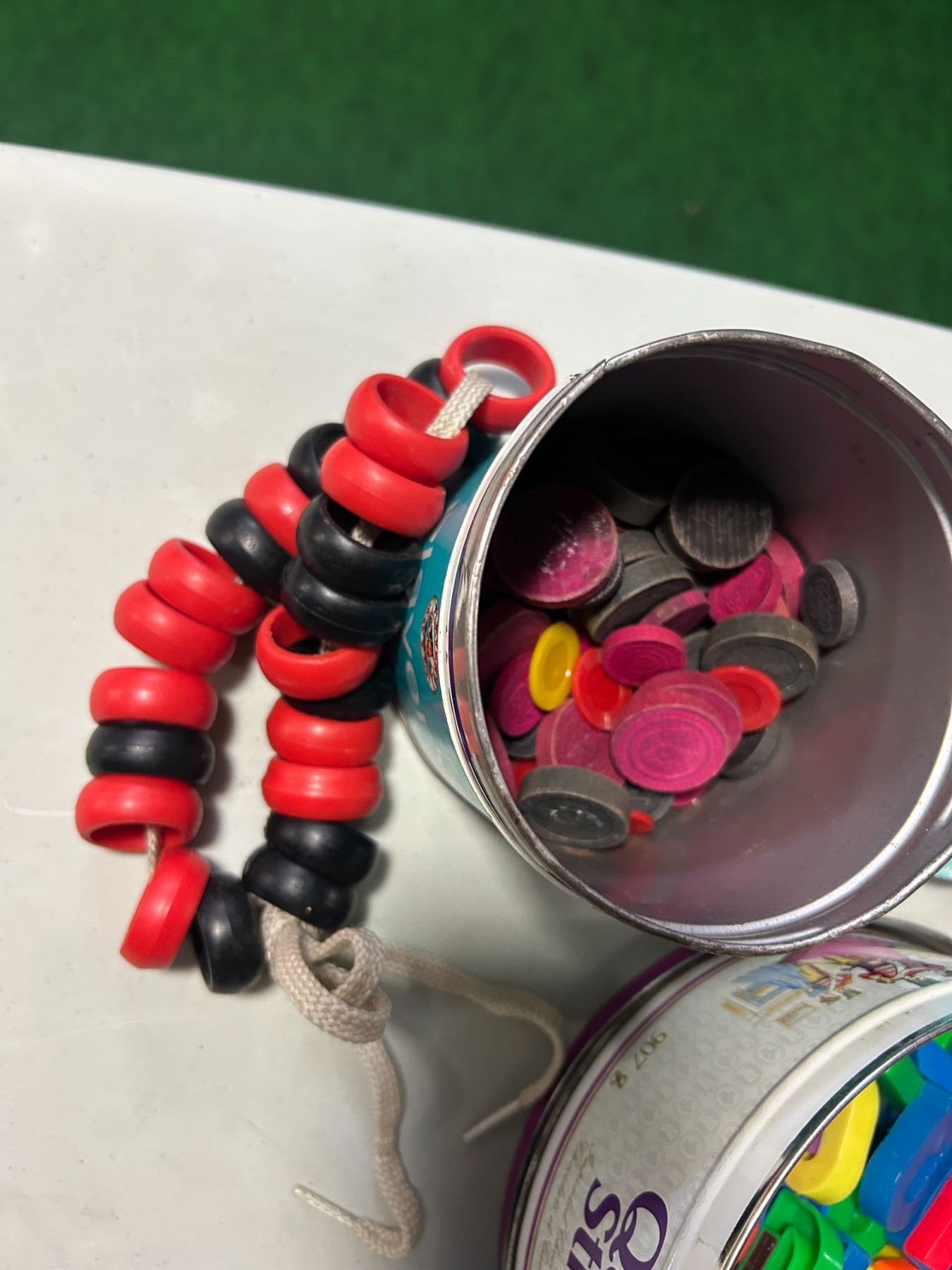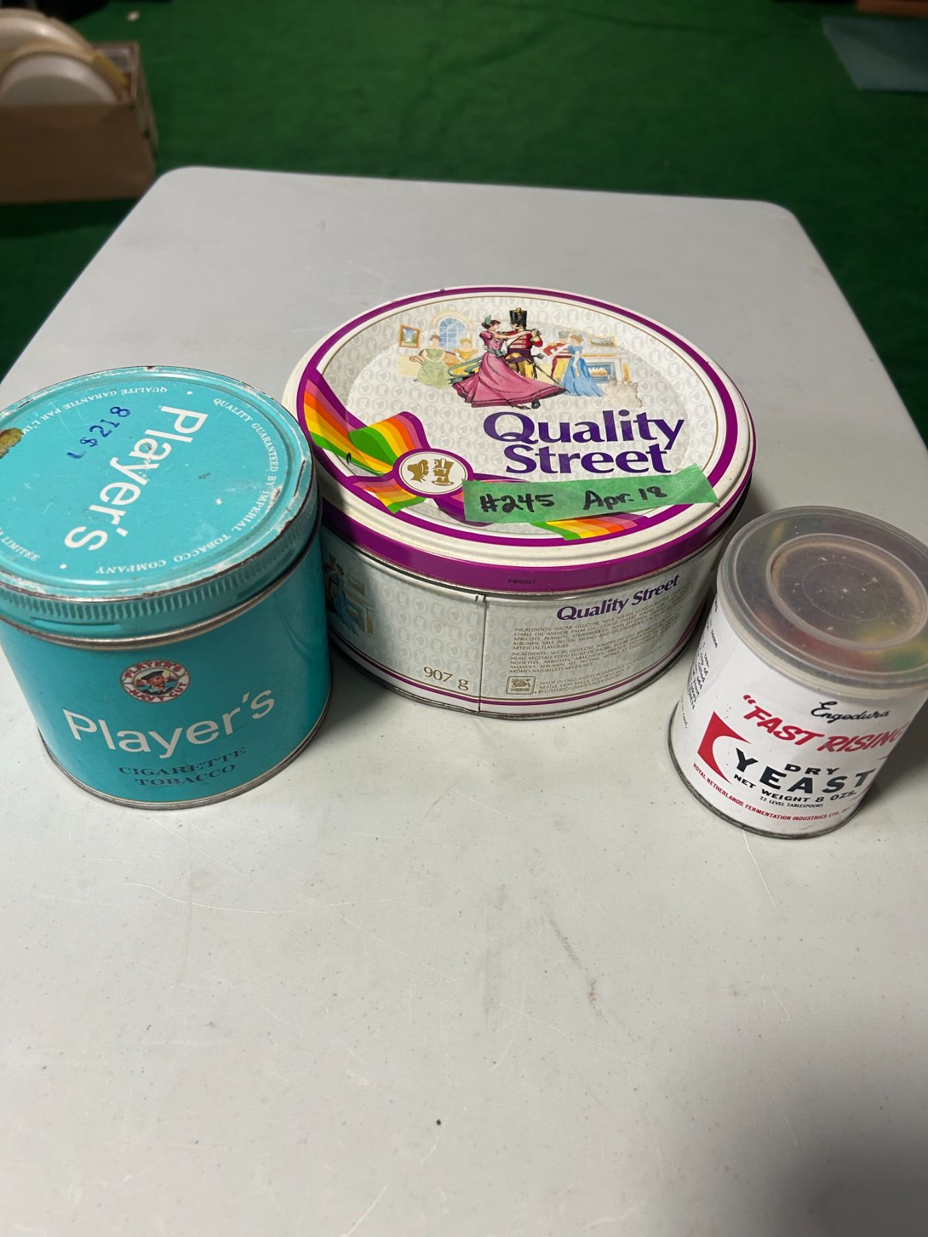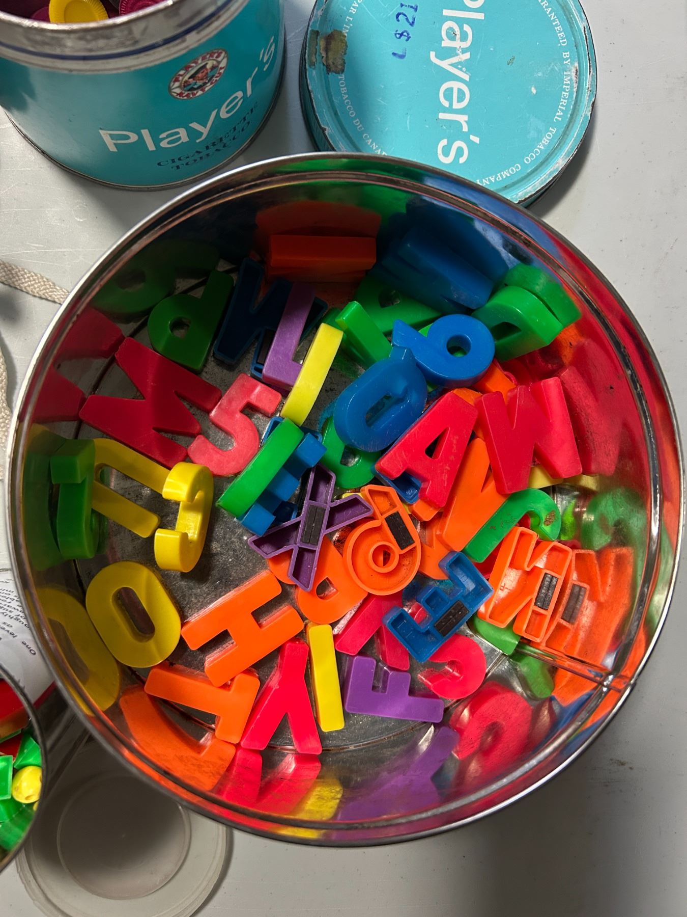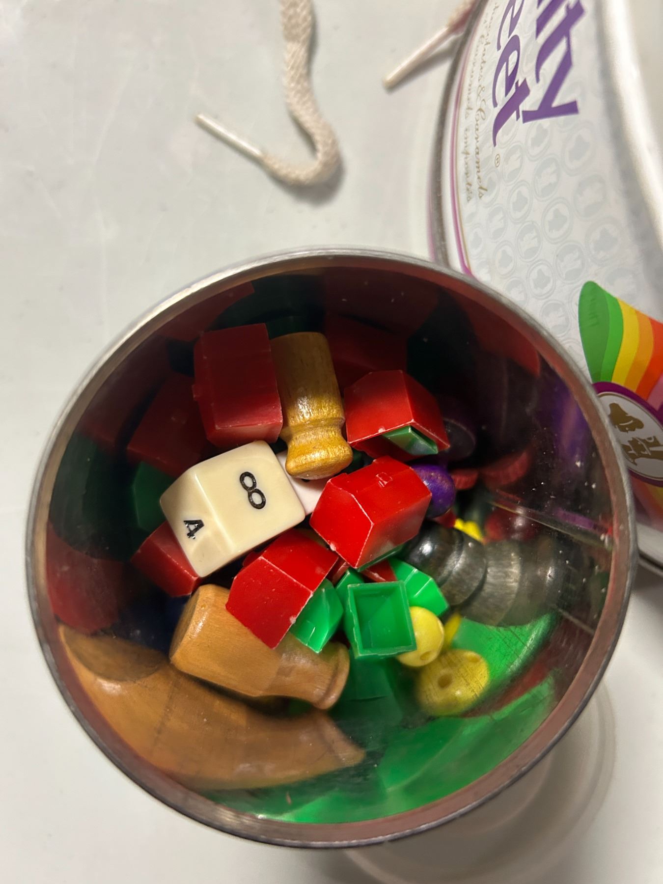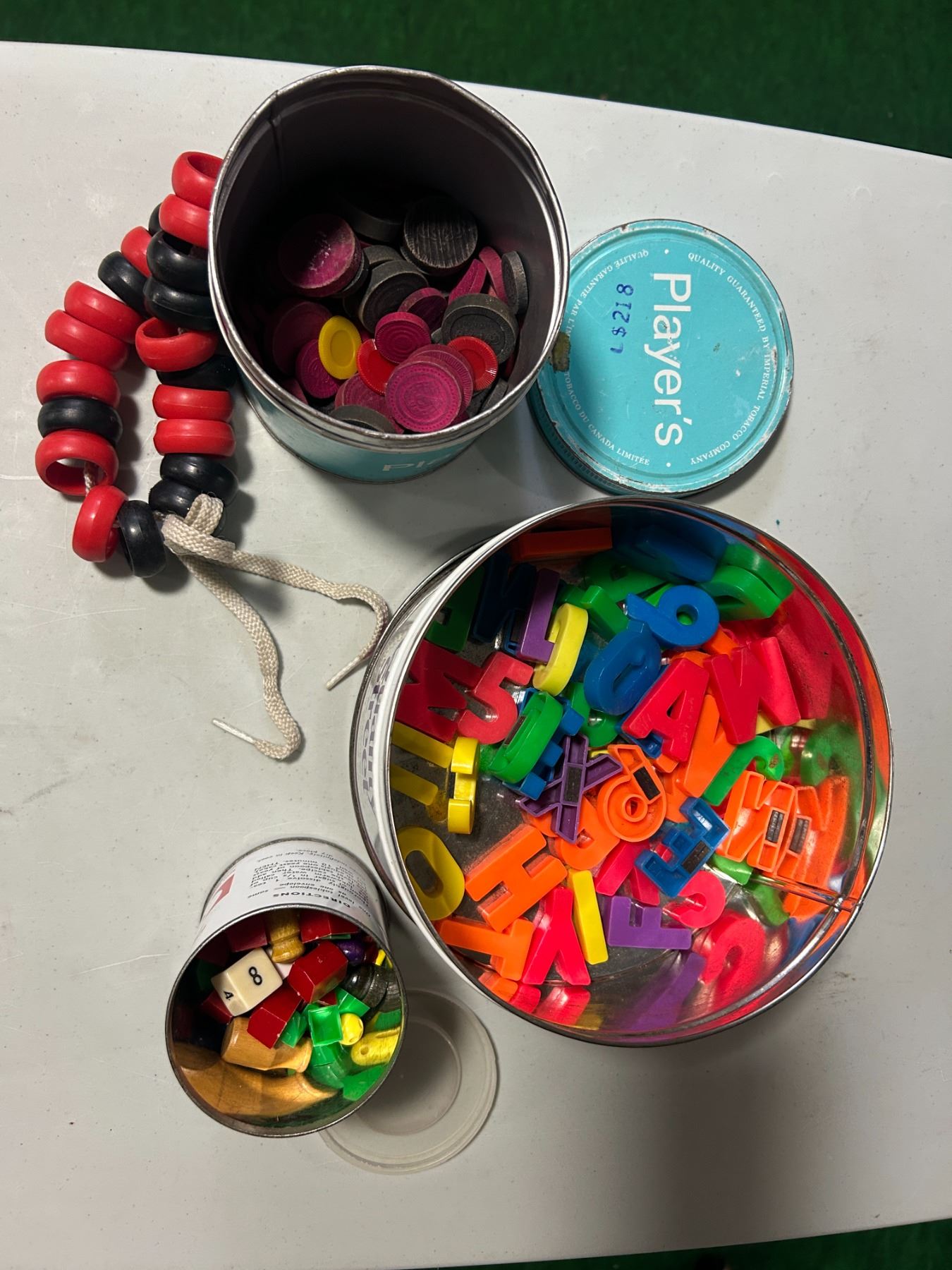 Tobacco, yeast and chocolate tins filled with game pieces and fridge magnets