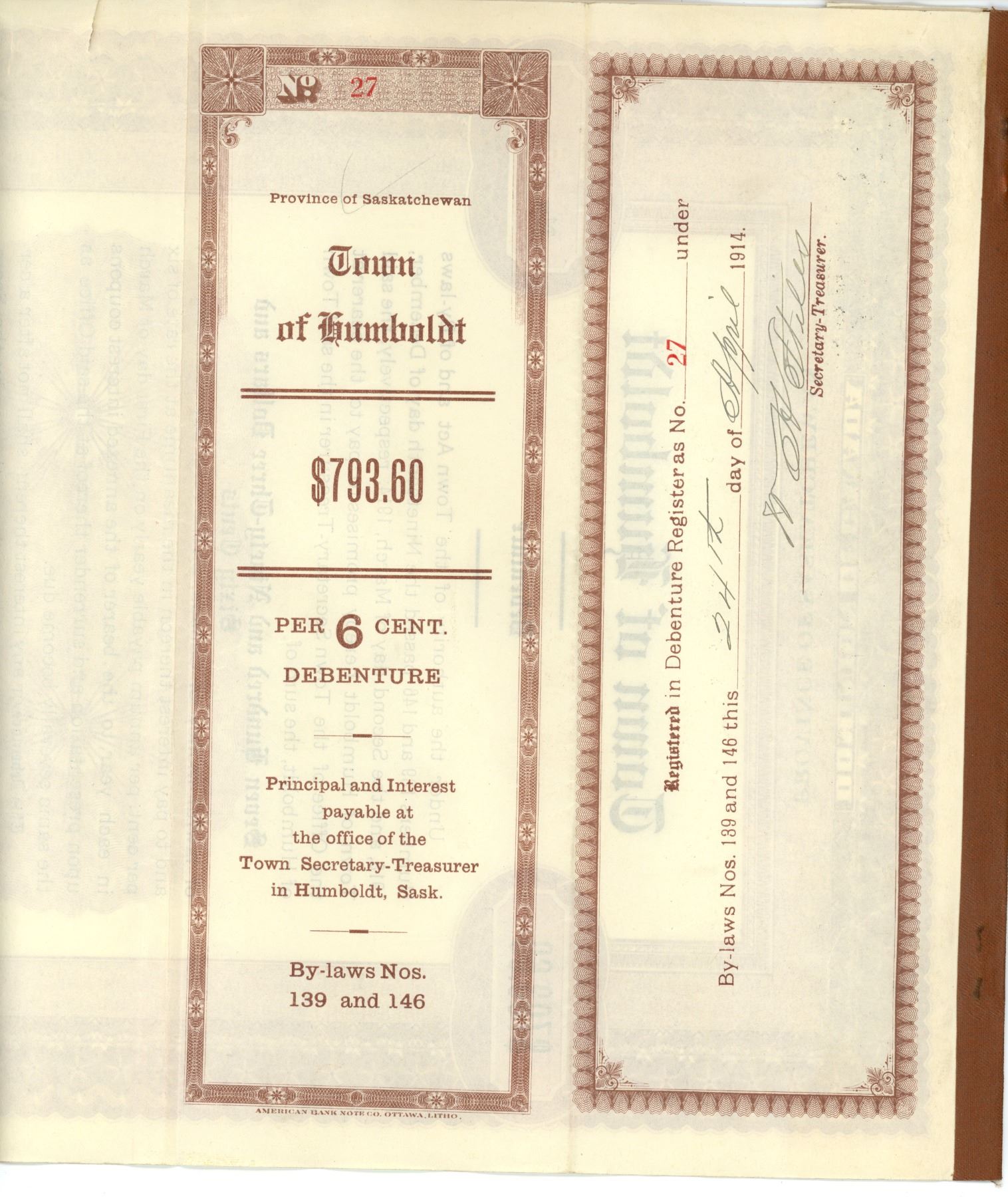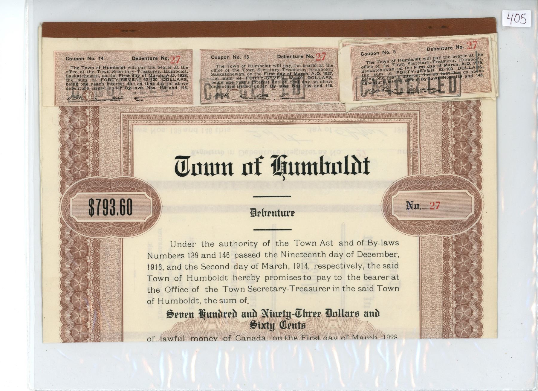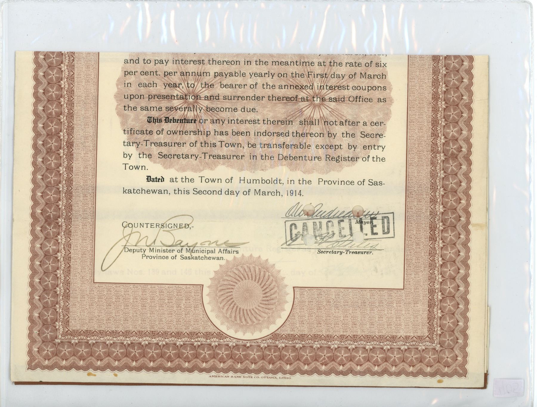 Town of Humboldt, Saskatchewan 1914 $793.60 Cancelled Debenture. Includes cancelled coupons.