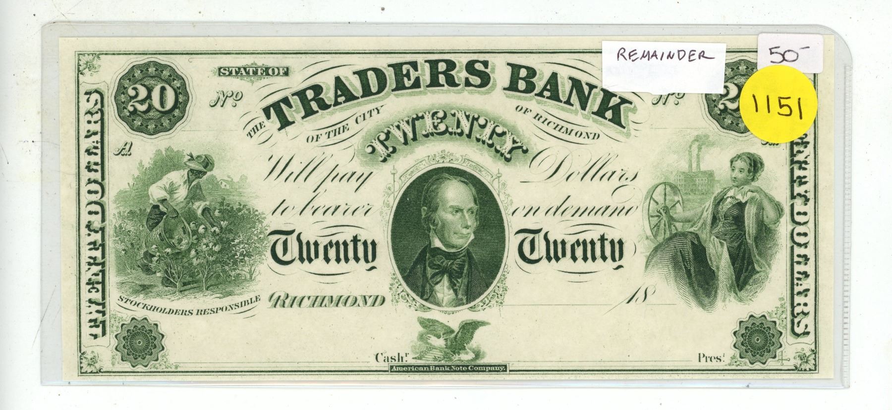 Traders Bank, Richmond Virginia 18__ $20 Remainder. This is a real note but has not been signed. Uncirculated.