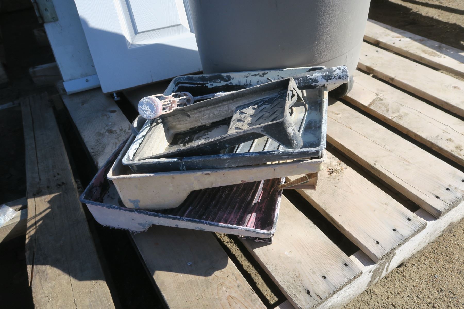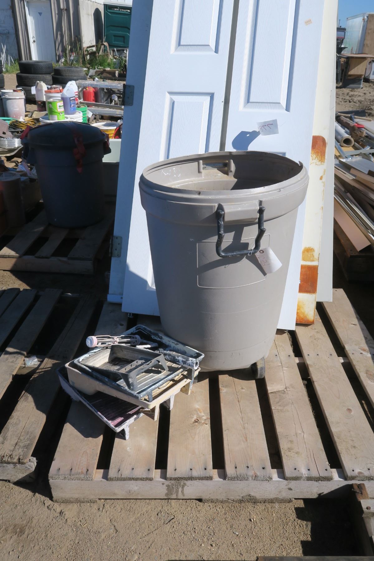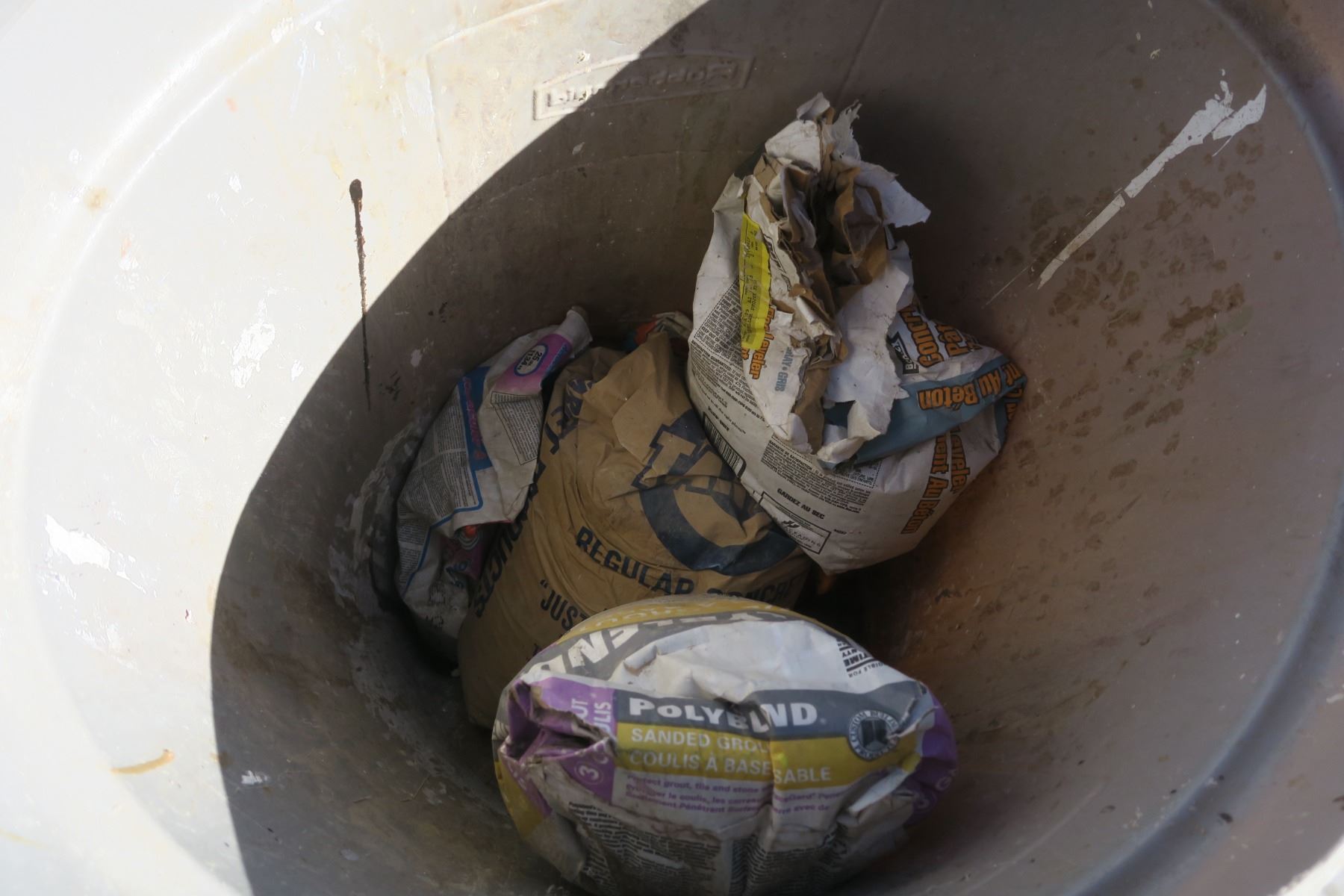 Trash Bin w/ Assorted Bags of Opened Mortar Mix & Painting Supplies