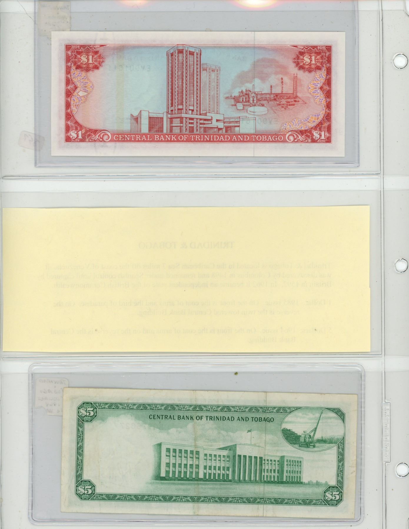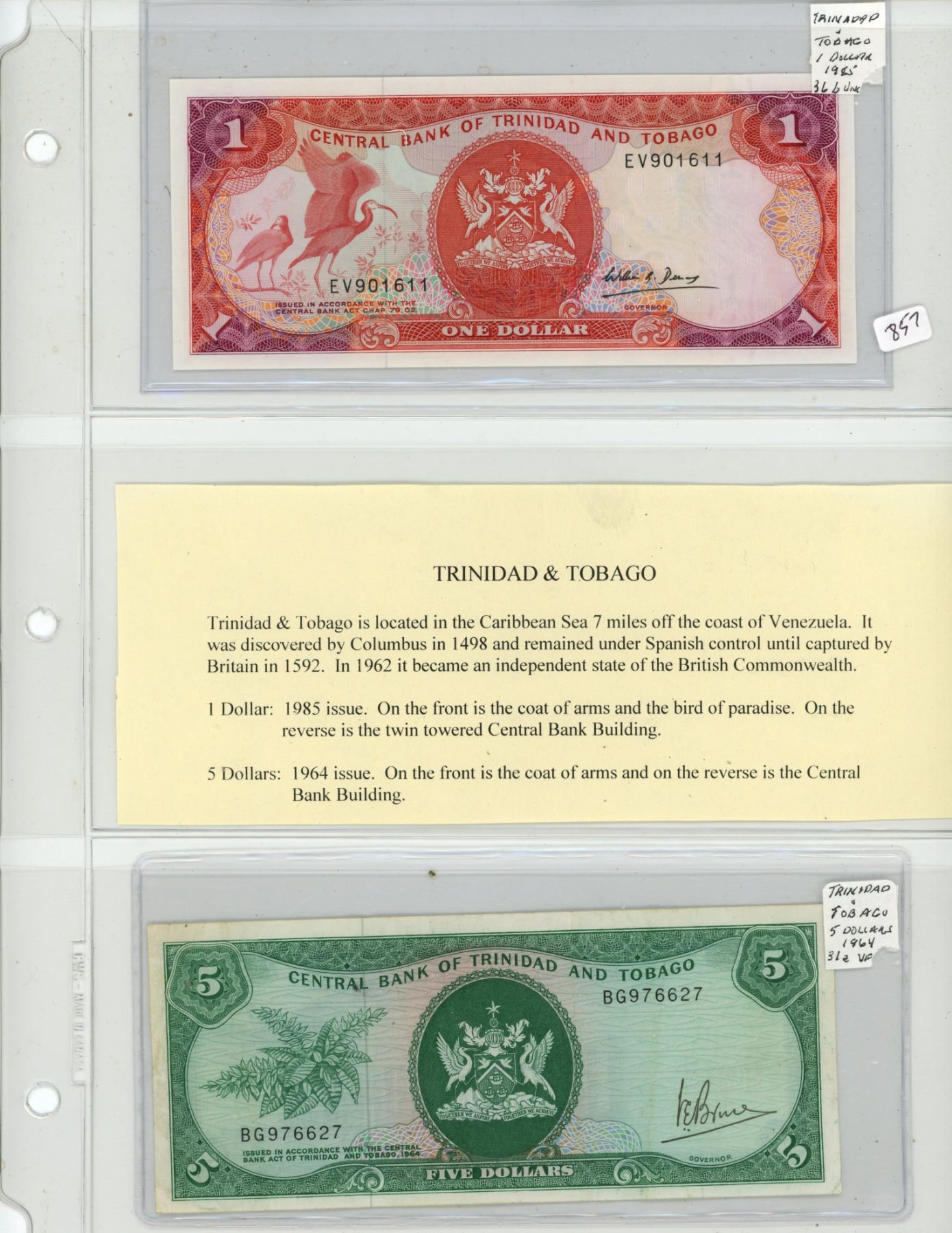 Trinidad and Tobago. Lot of 2 notes. 1985 $1 P-36b.Unc and 1964 $5 P-31a VF.