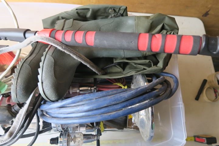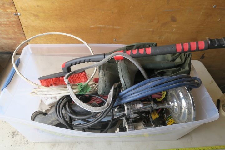 Tub of Misc. items Including Wiring, Liquor Dispenser, Rubber Boots and More!