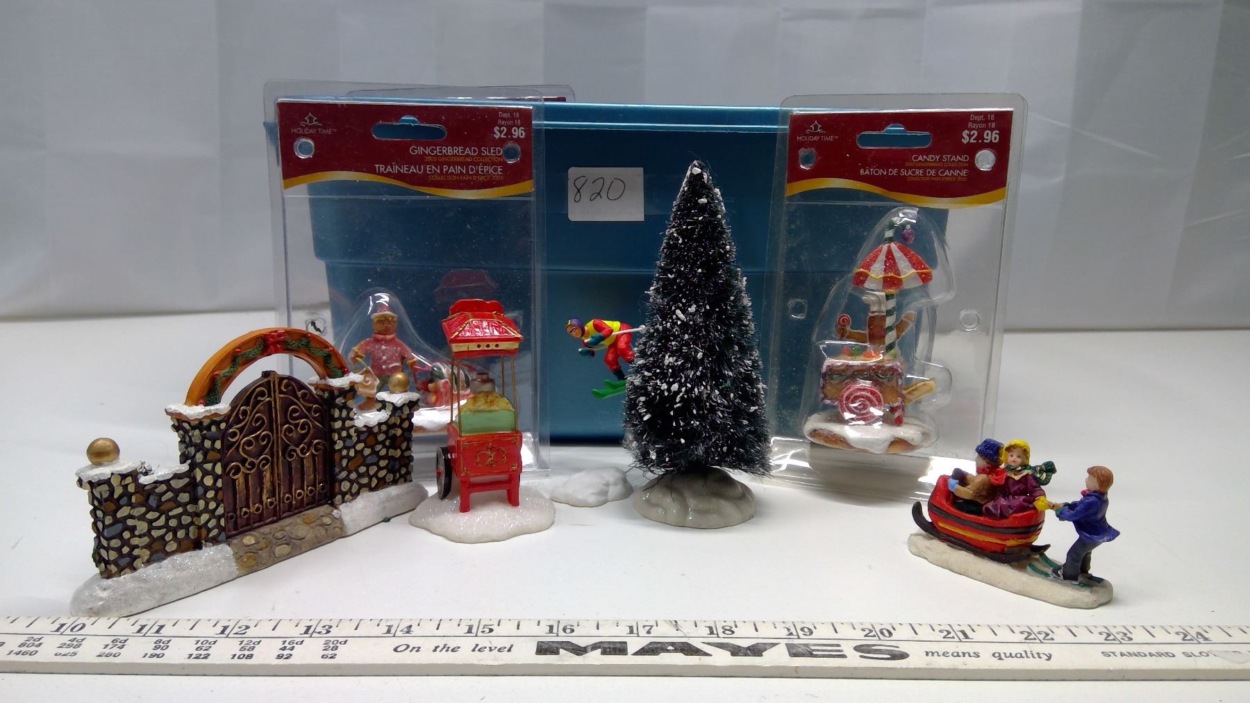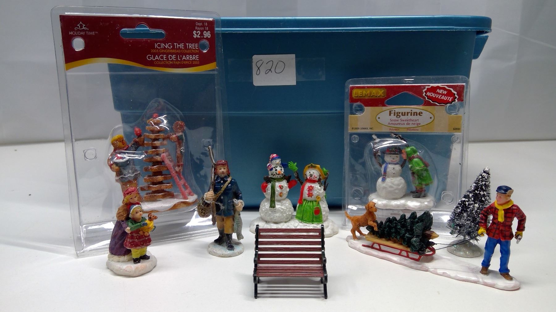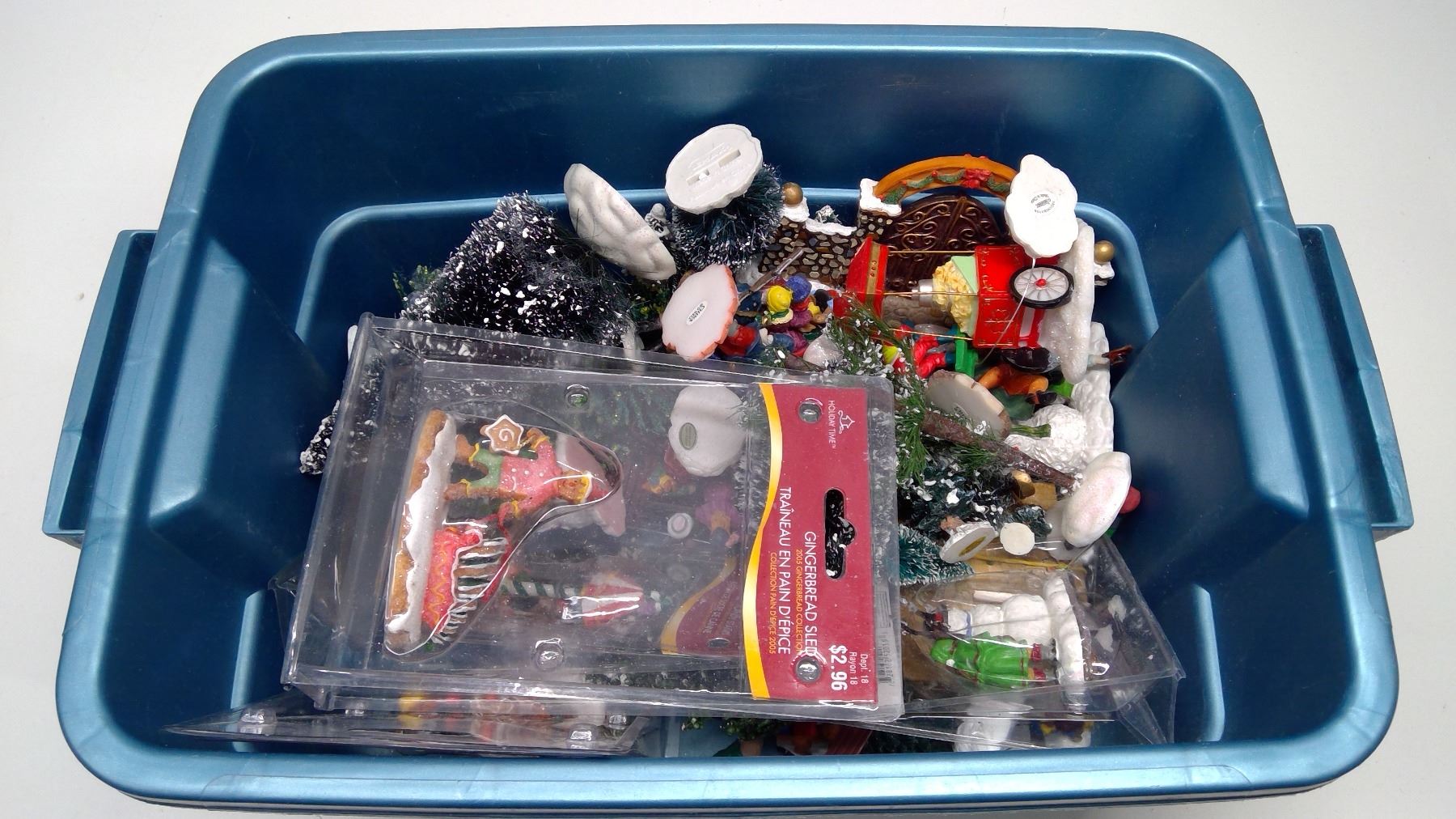 Tub of ornaments for Christmas villages