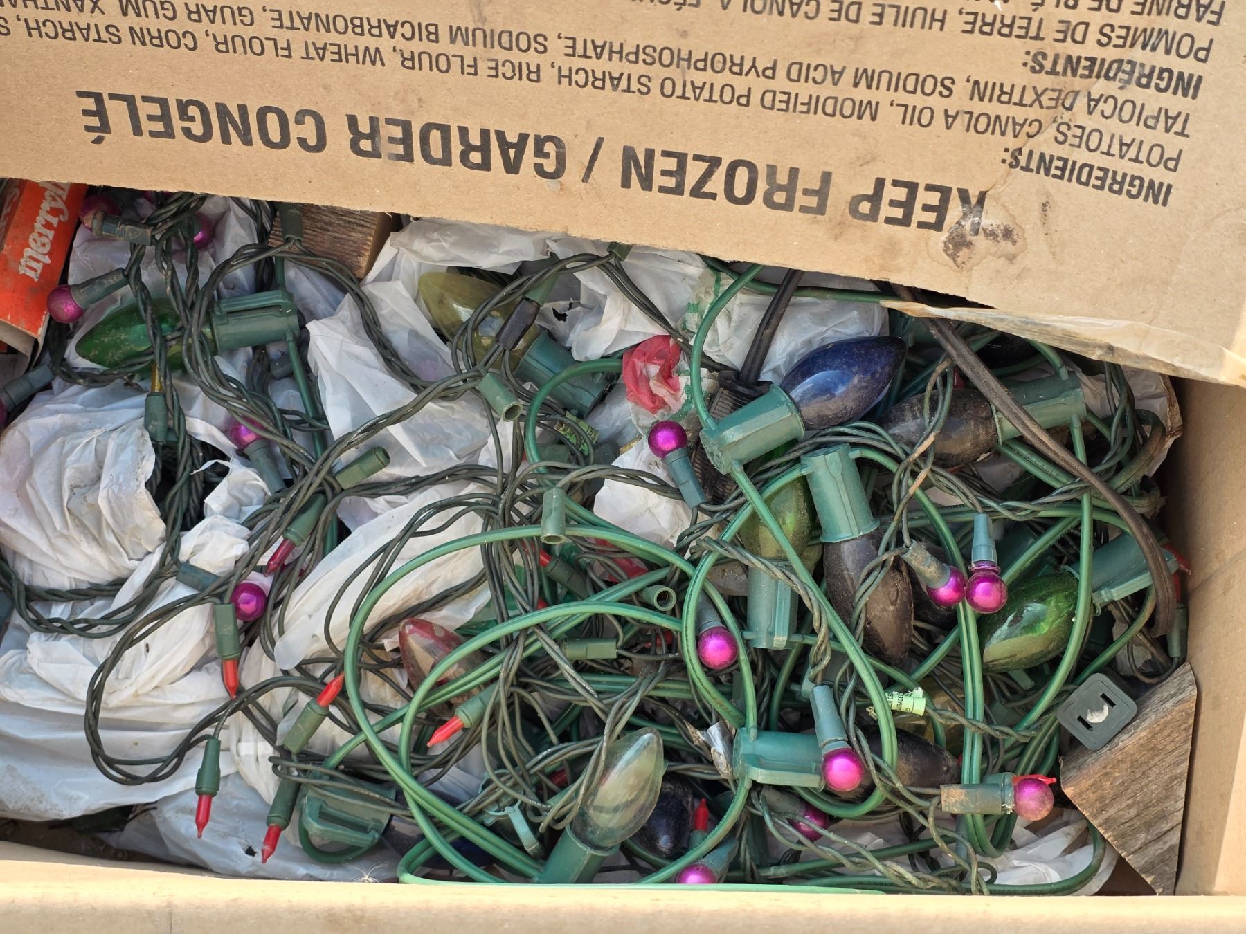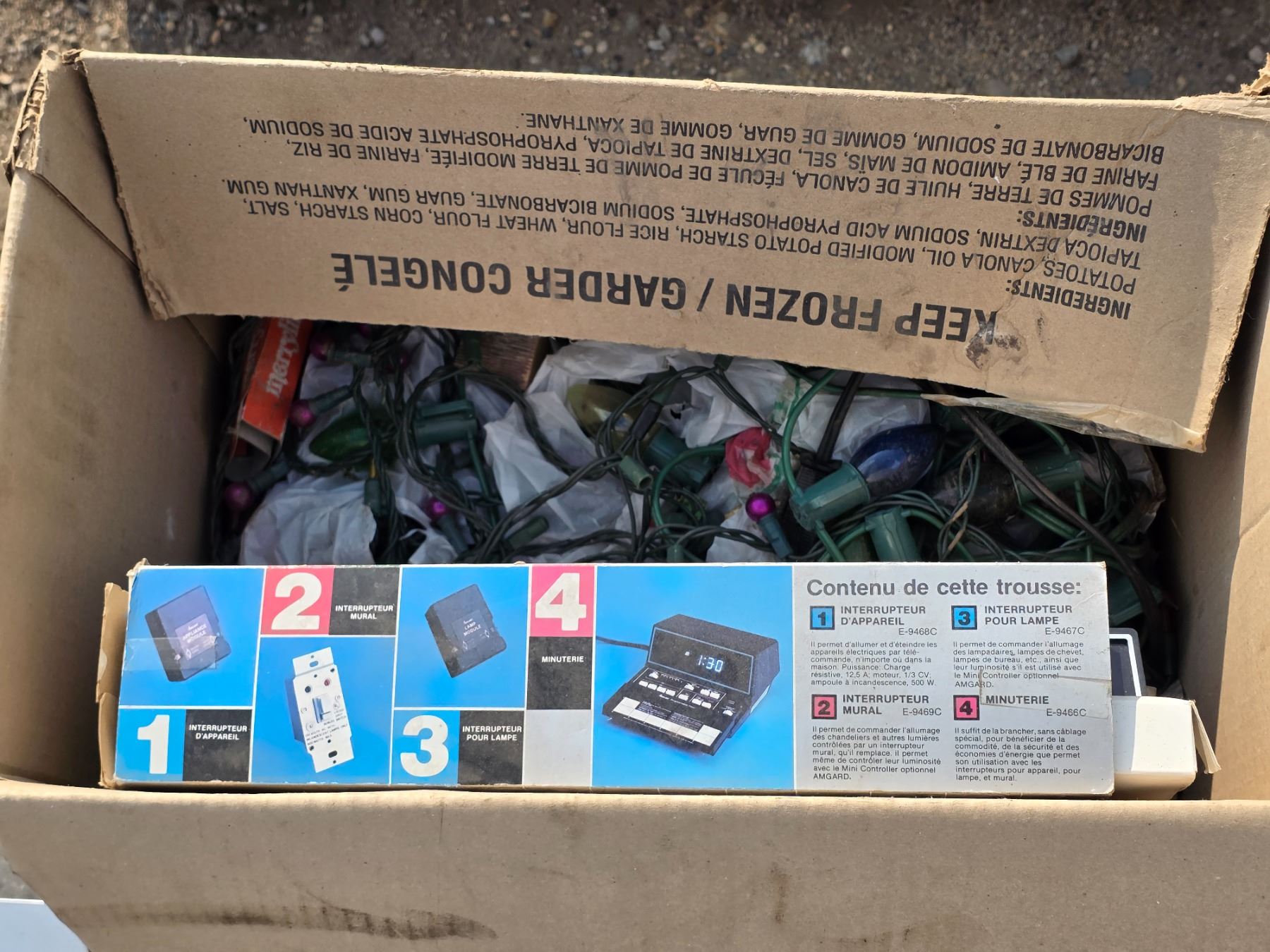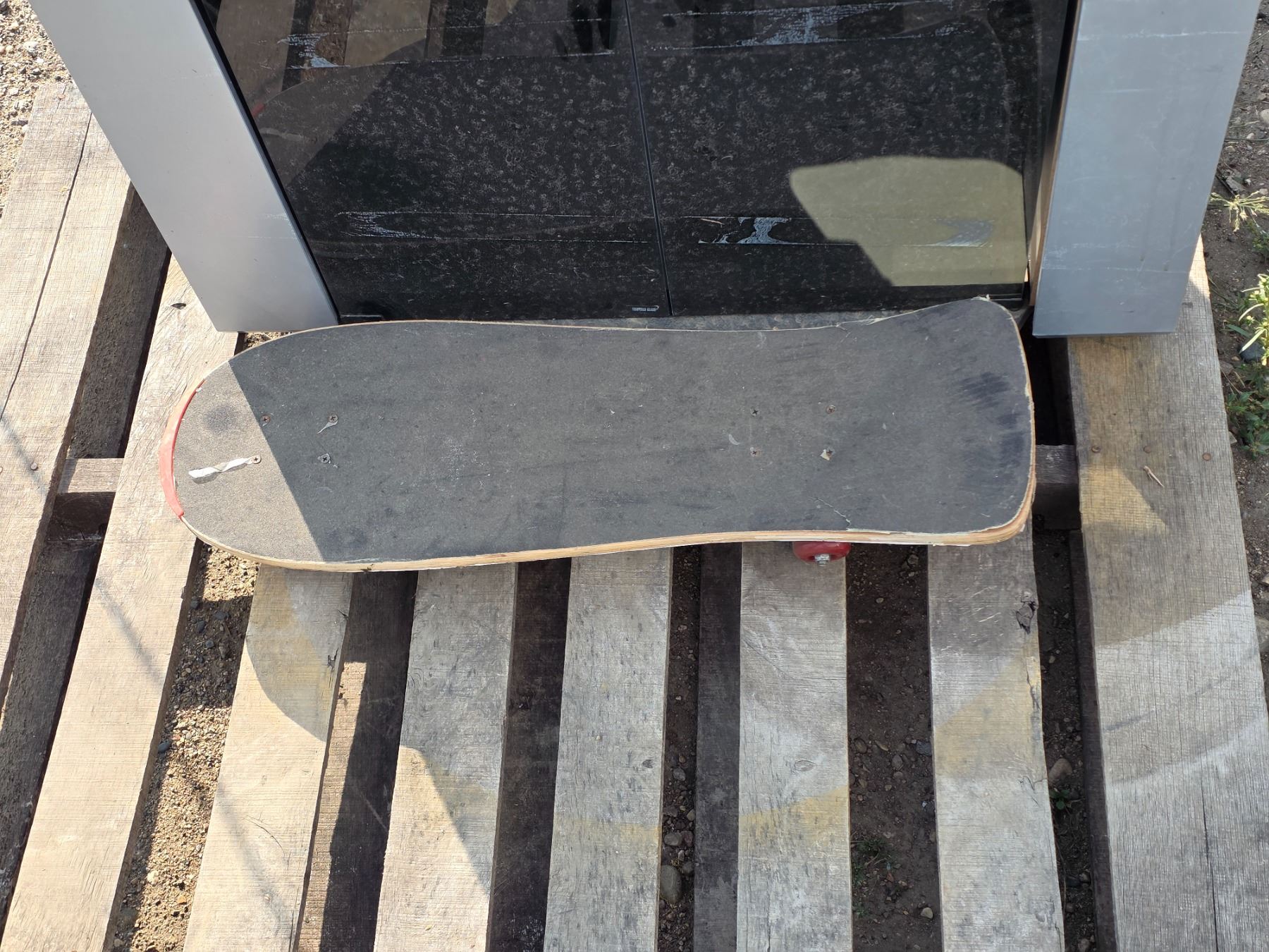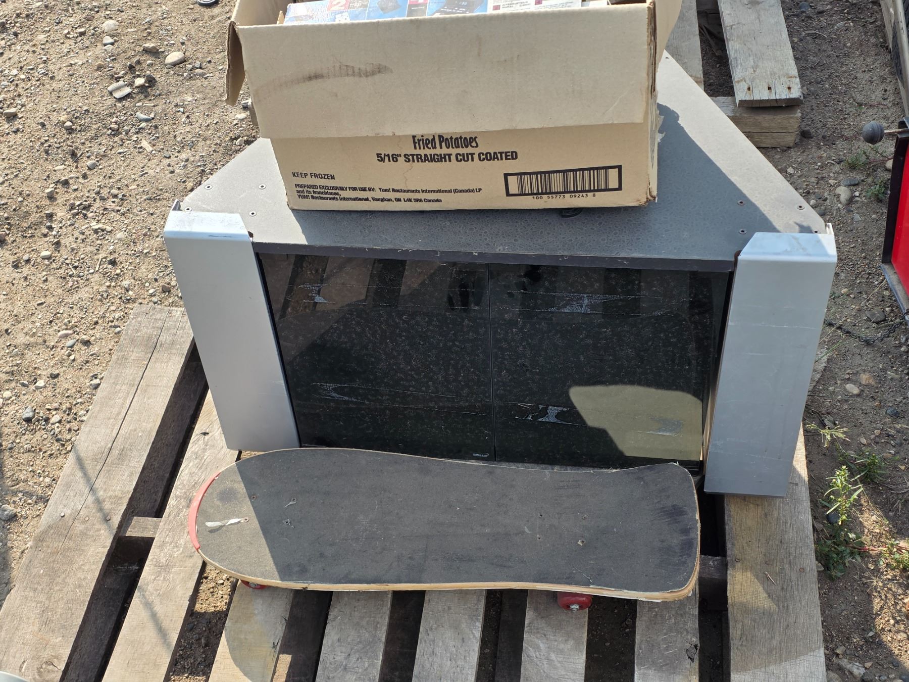 Tv stand, skate board and christmas lights
