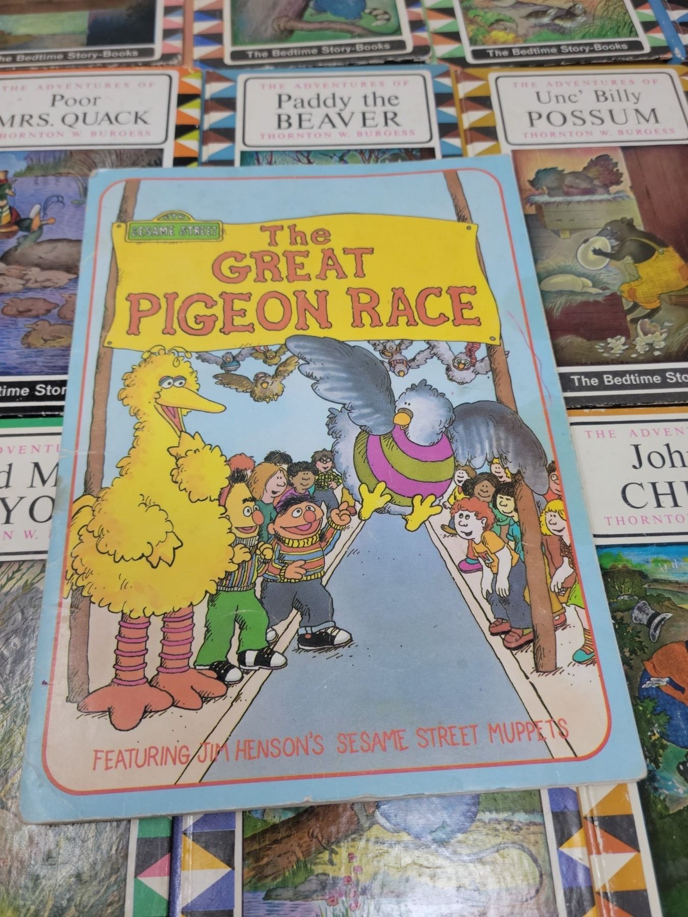 Also, one children's book "Swimming Pool Series" by Thornton W. Burgess, 1919 and great pigeon race, sesame street muppers