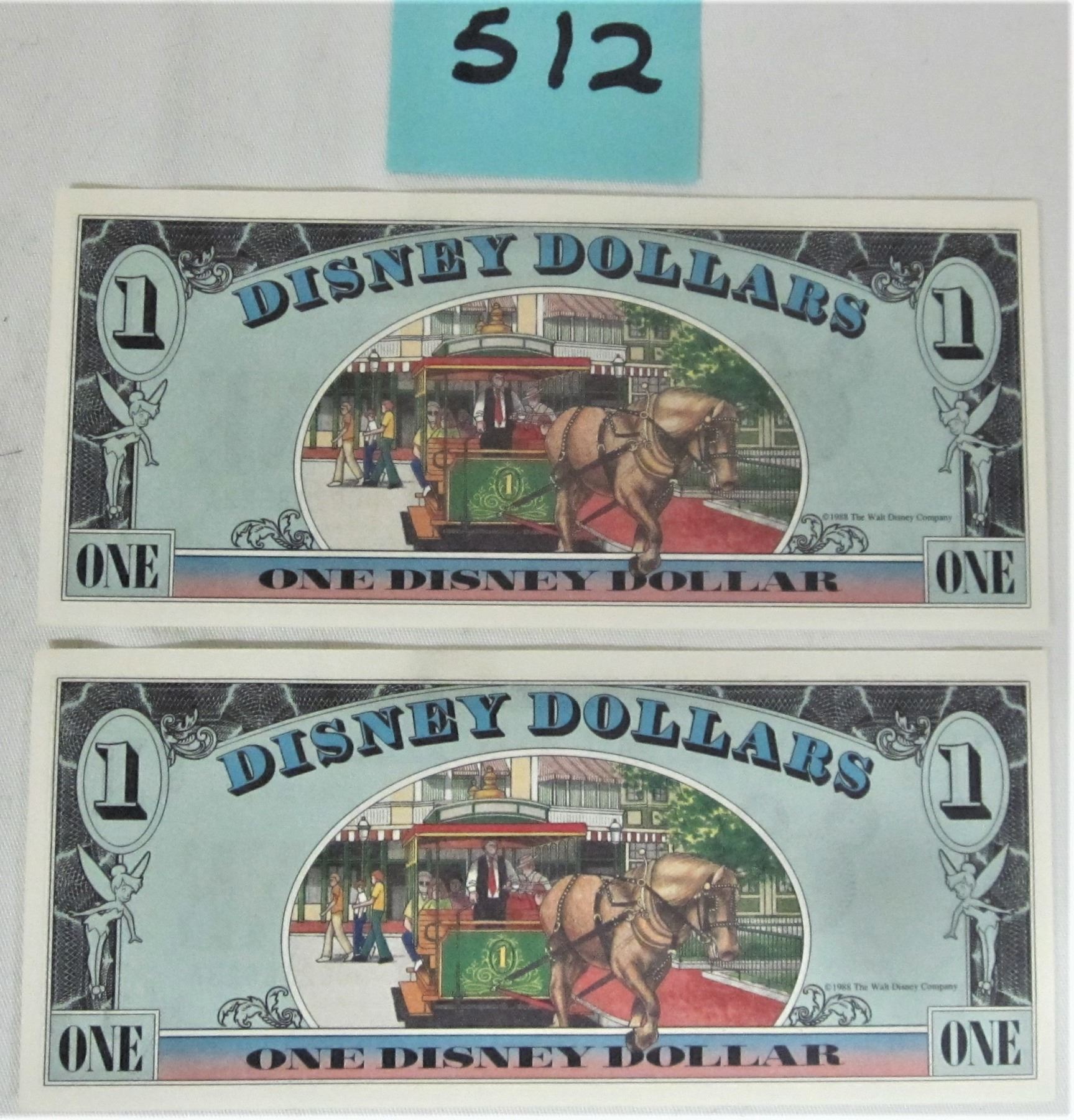 Two (2) 1988 uncirculated consecutive low numered Disney Micket Mouse $1 One dollar bills, D-series #'s D00218622A-D000218623A