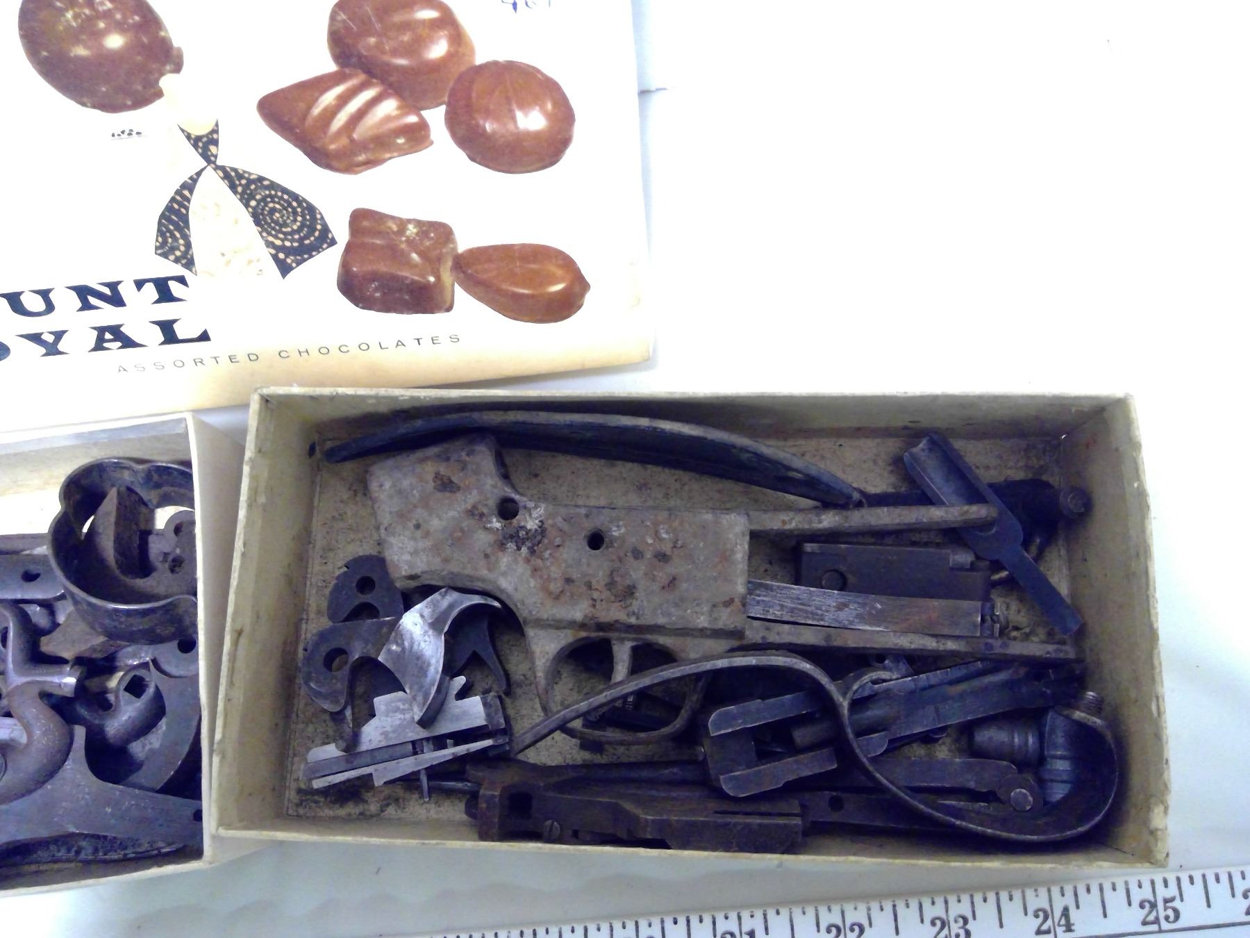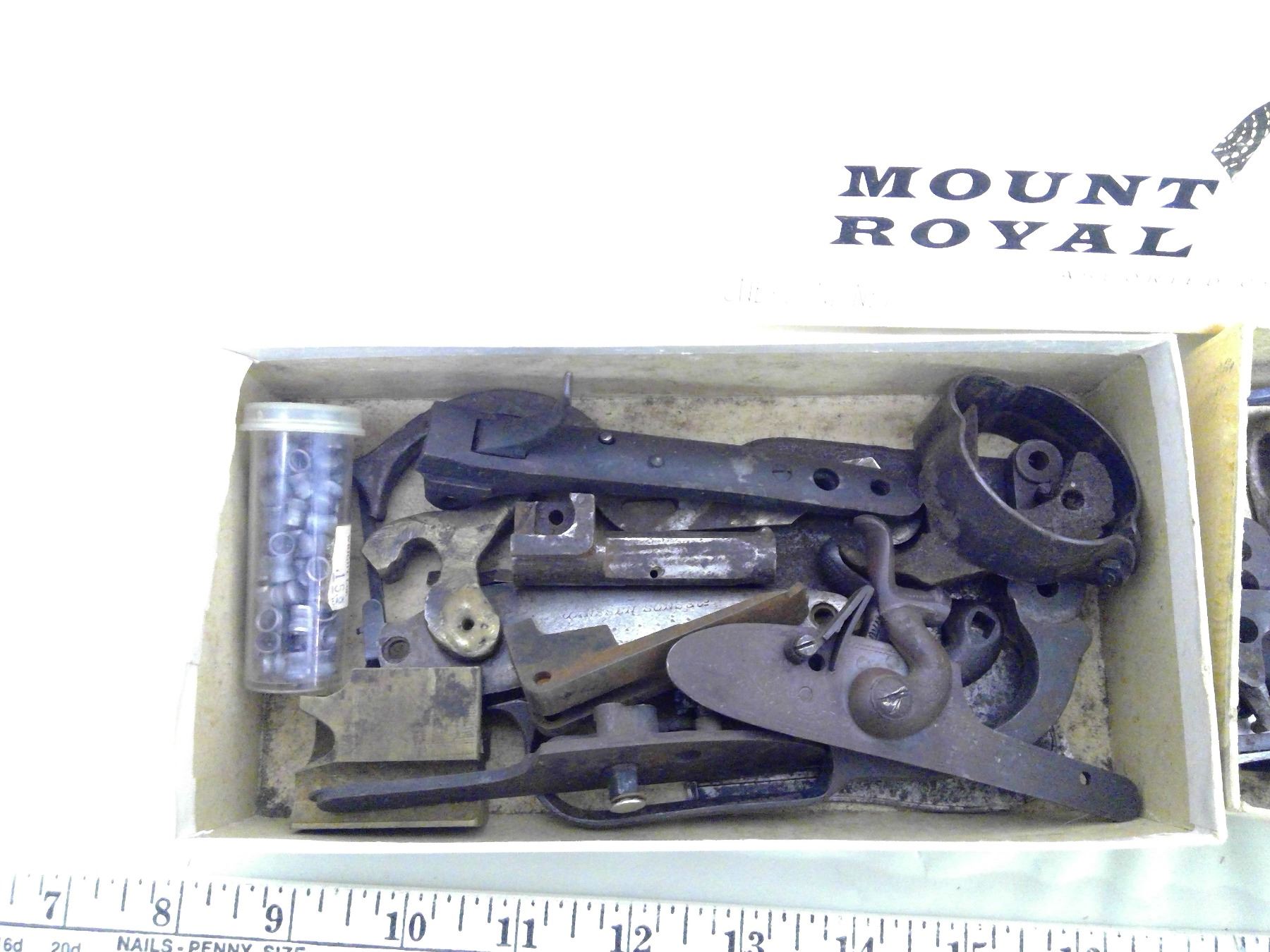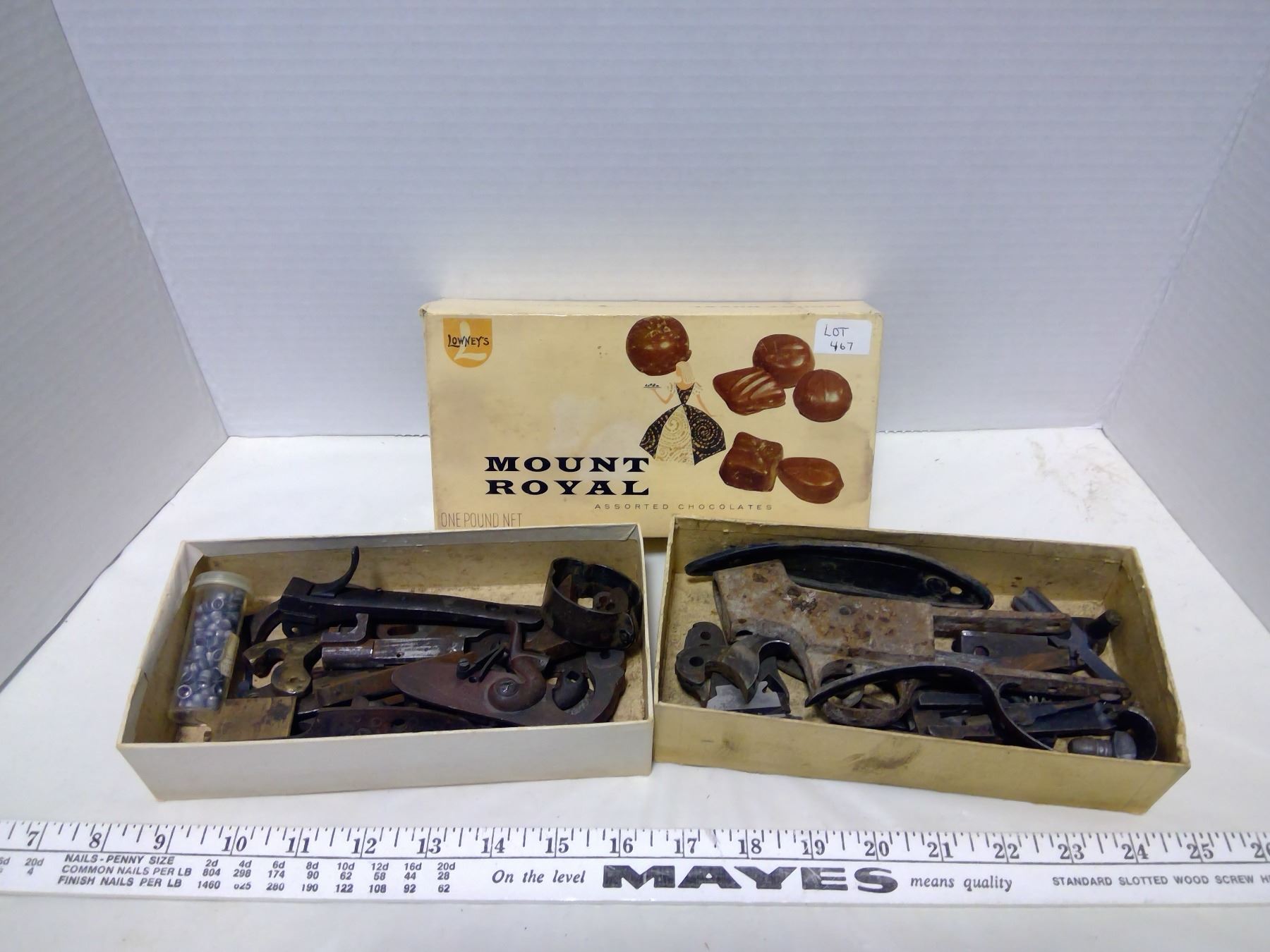Two Boxes Antique Gun Parts, Trigger Guards, Hammers, etc.