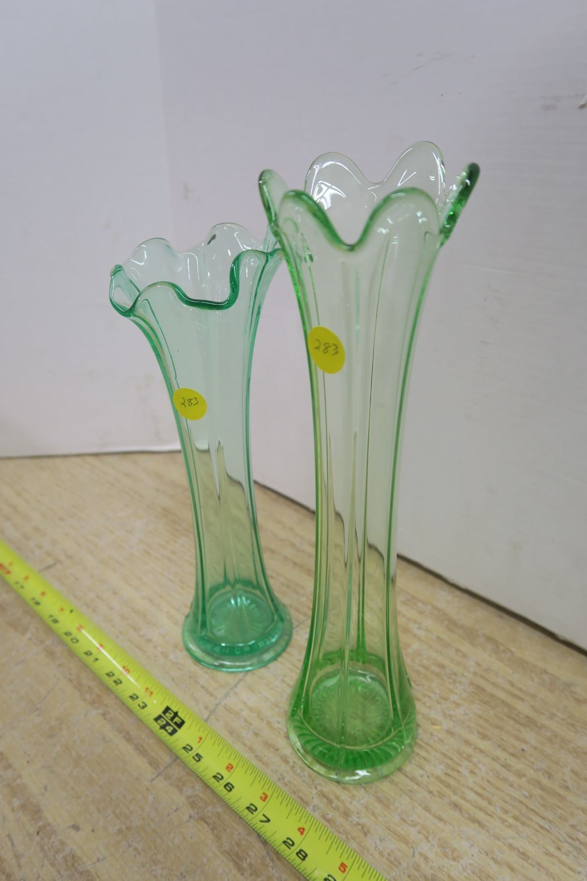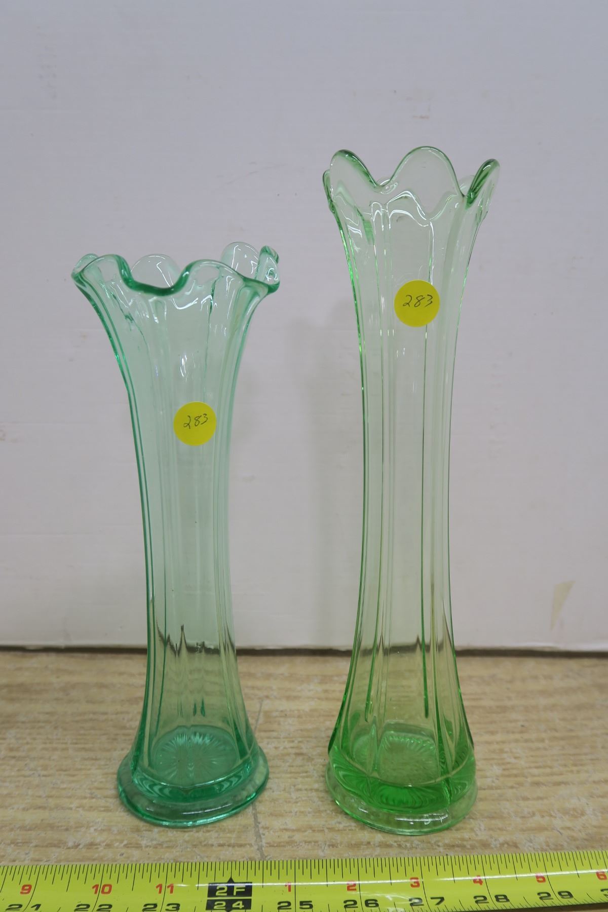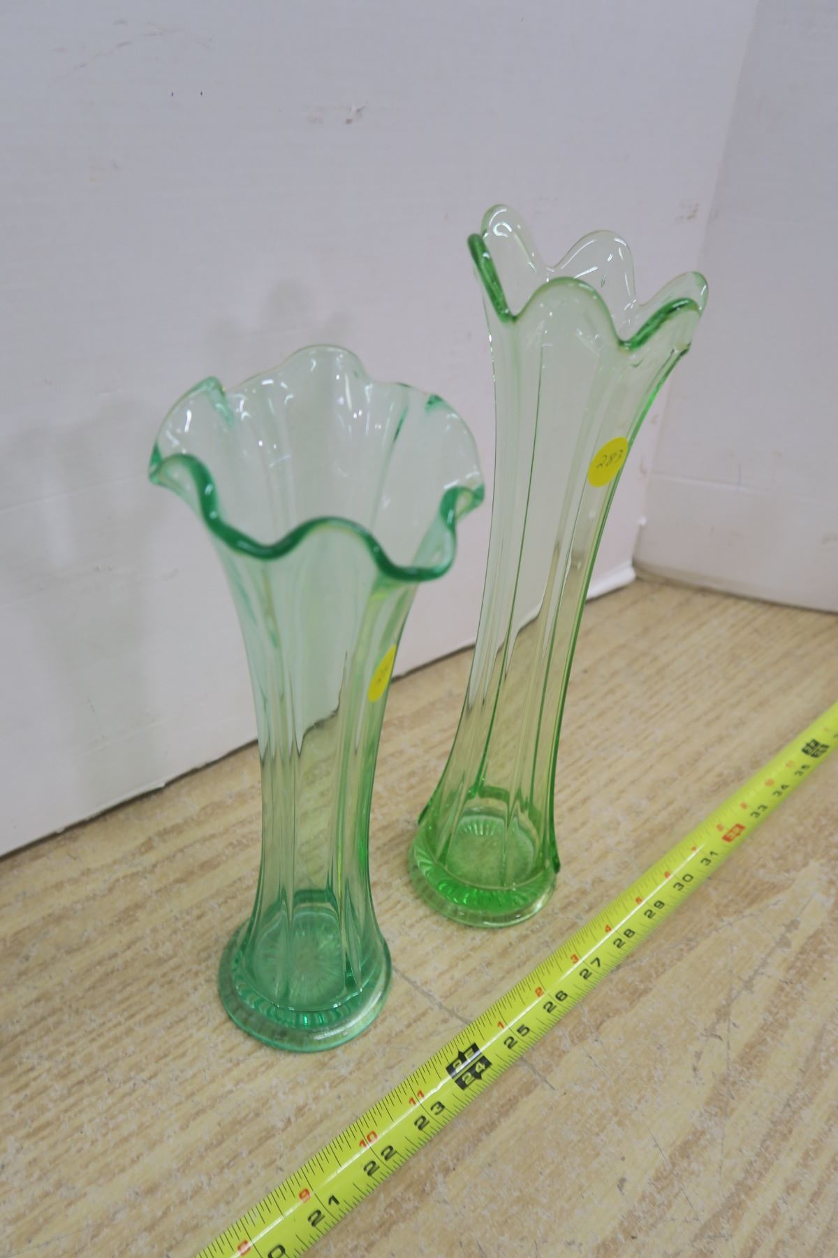 Two Green Depression Glass Vases, One 12 Inches One 11 Inches