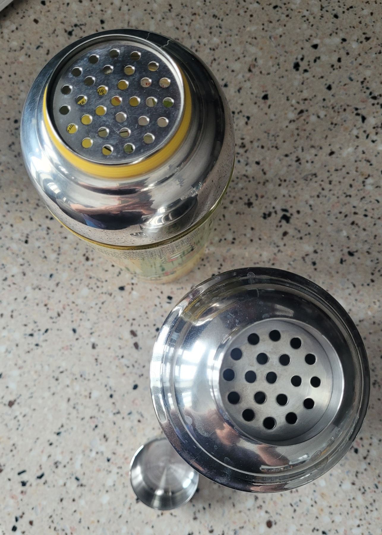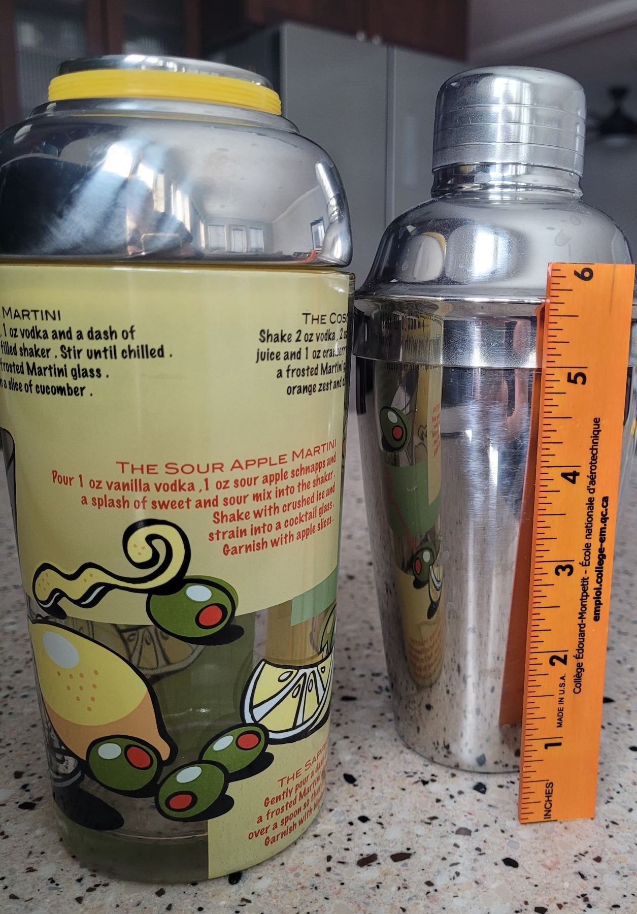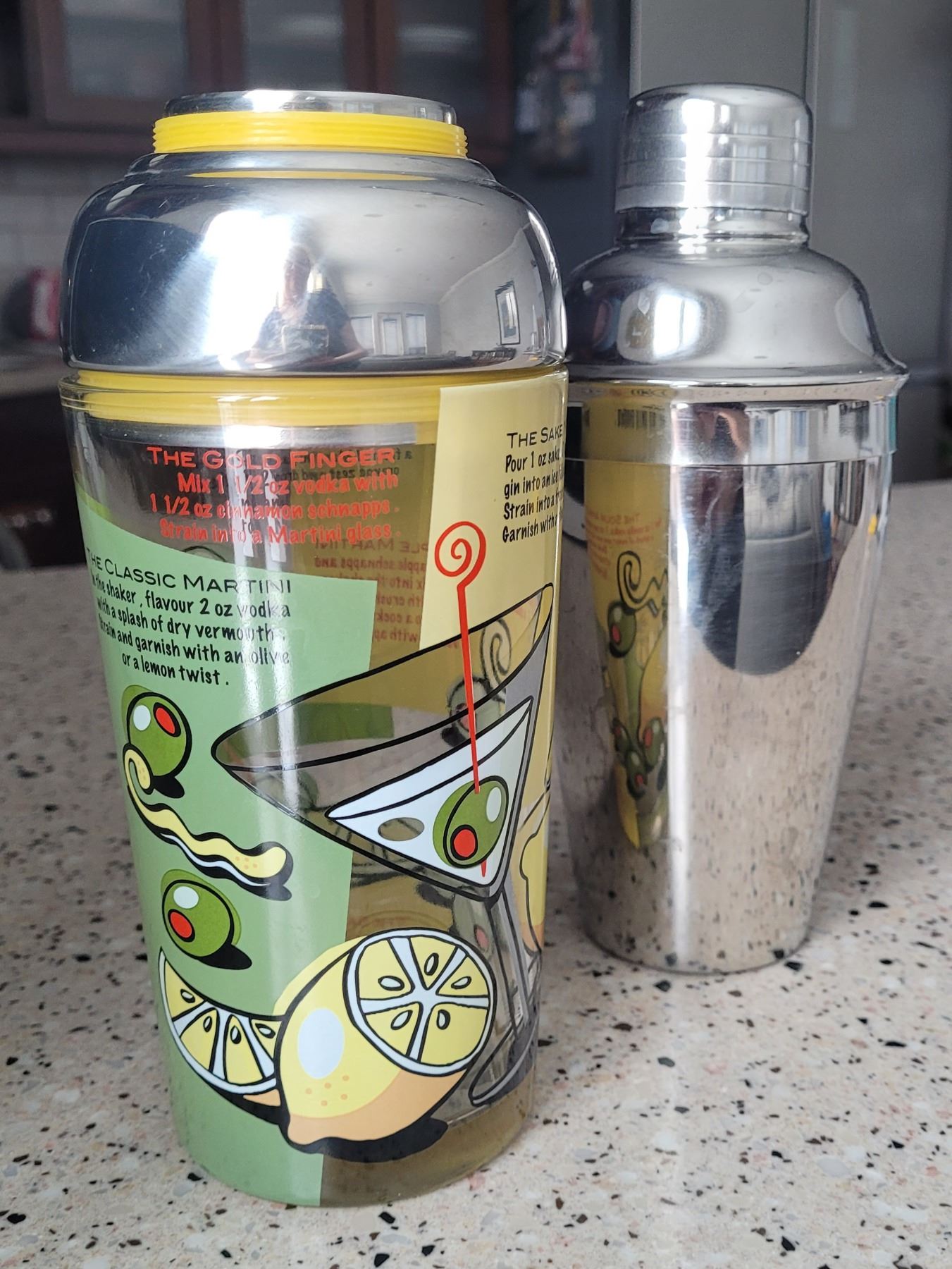 Two cocktail shakers - one glass with cocktail recipes - one stainless steel