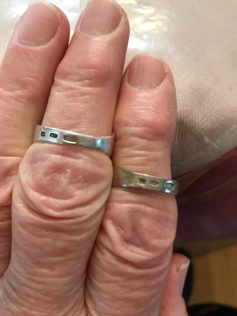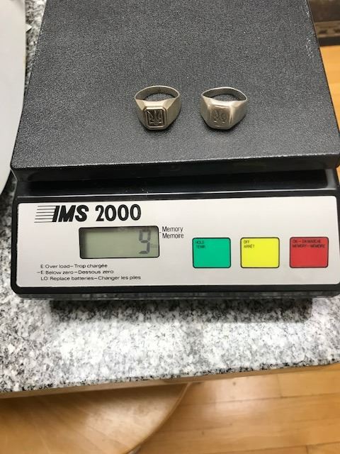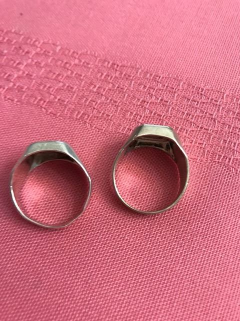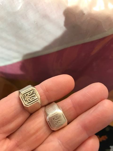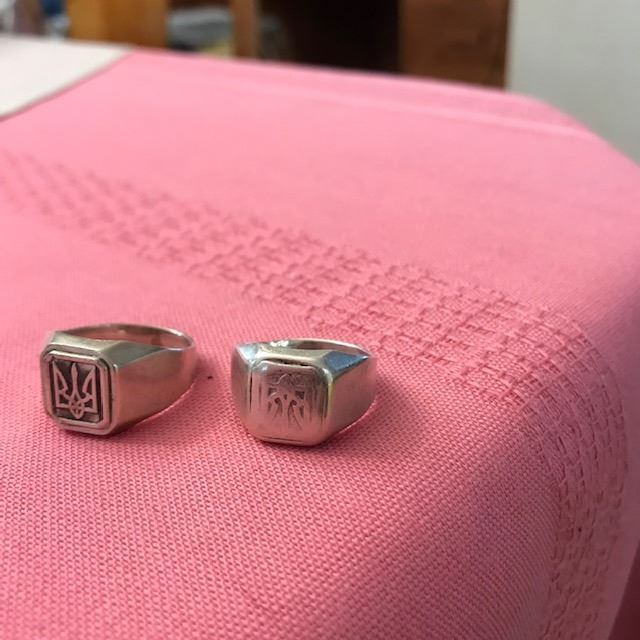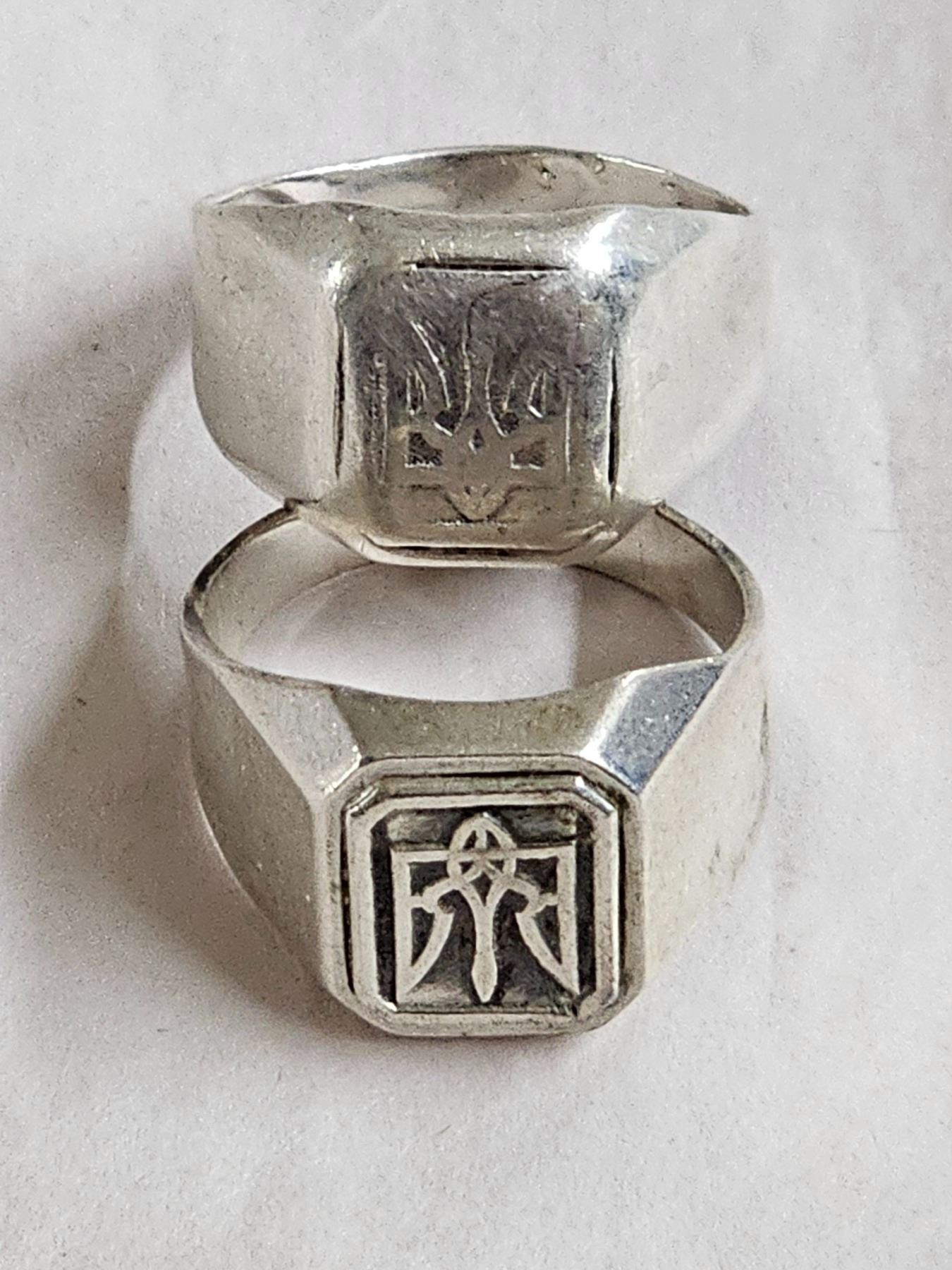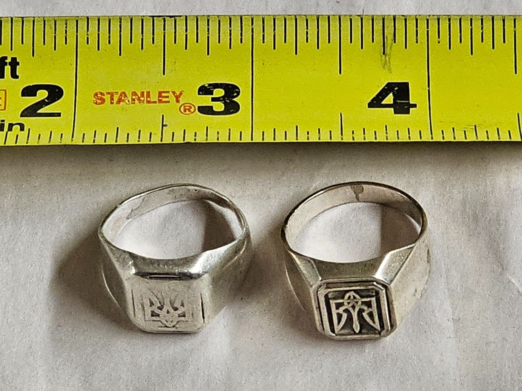 Two hallmarked sterling silver rings with Ukrainian Tryzub Coat of Arms. Combined weight: 9 grams