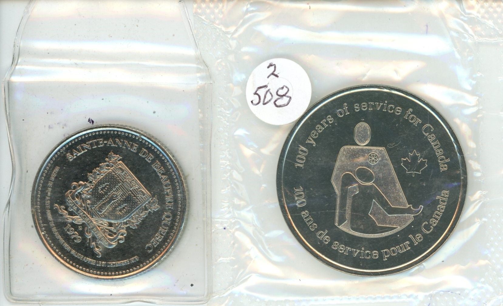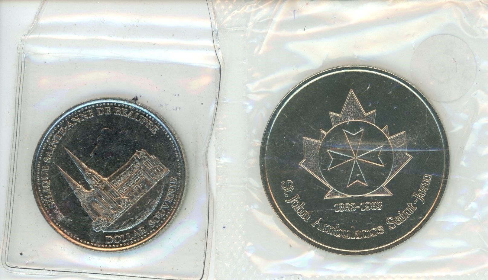 Two tokens - 1983 100 years St John Ambulance service in Canada / 1979 Saint Anne De Beaupre Quebec souvenir dollar