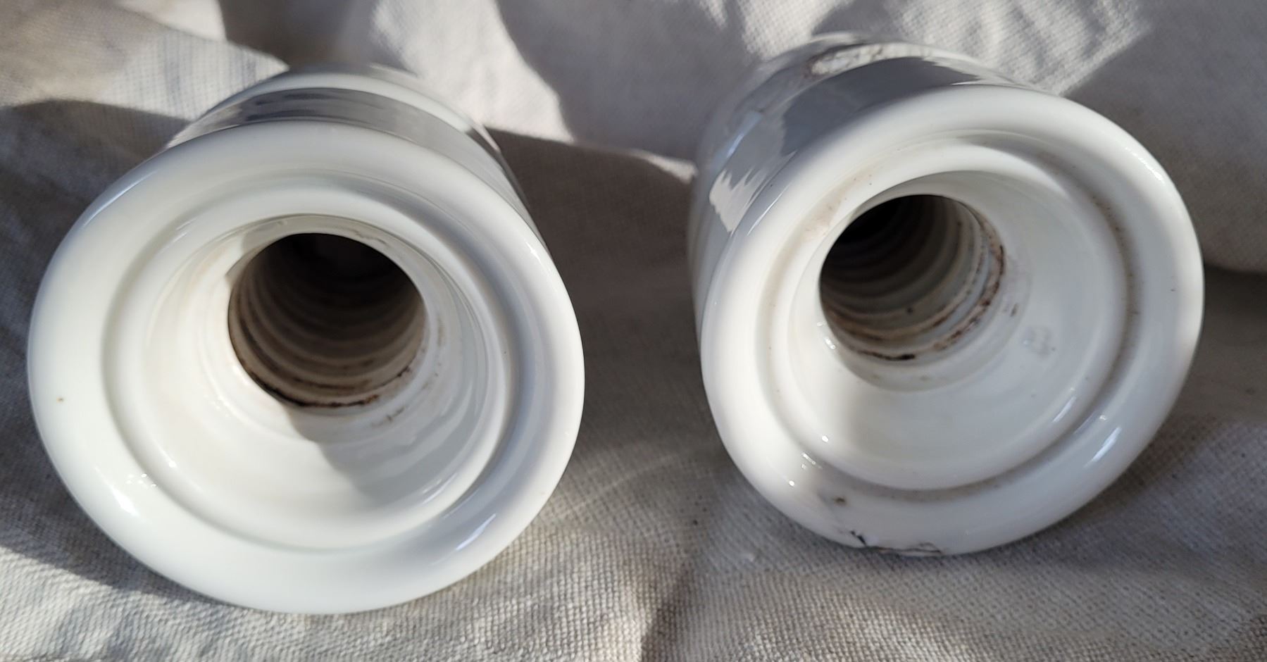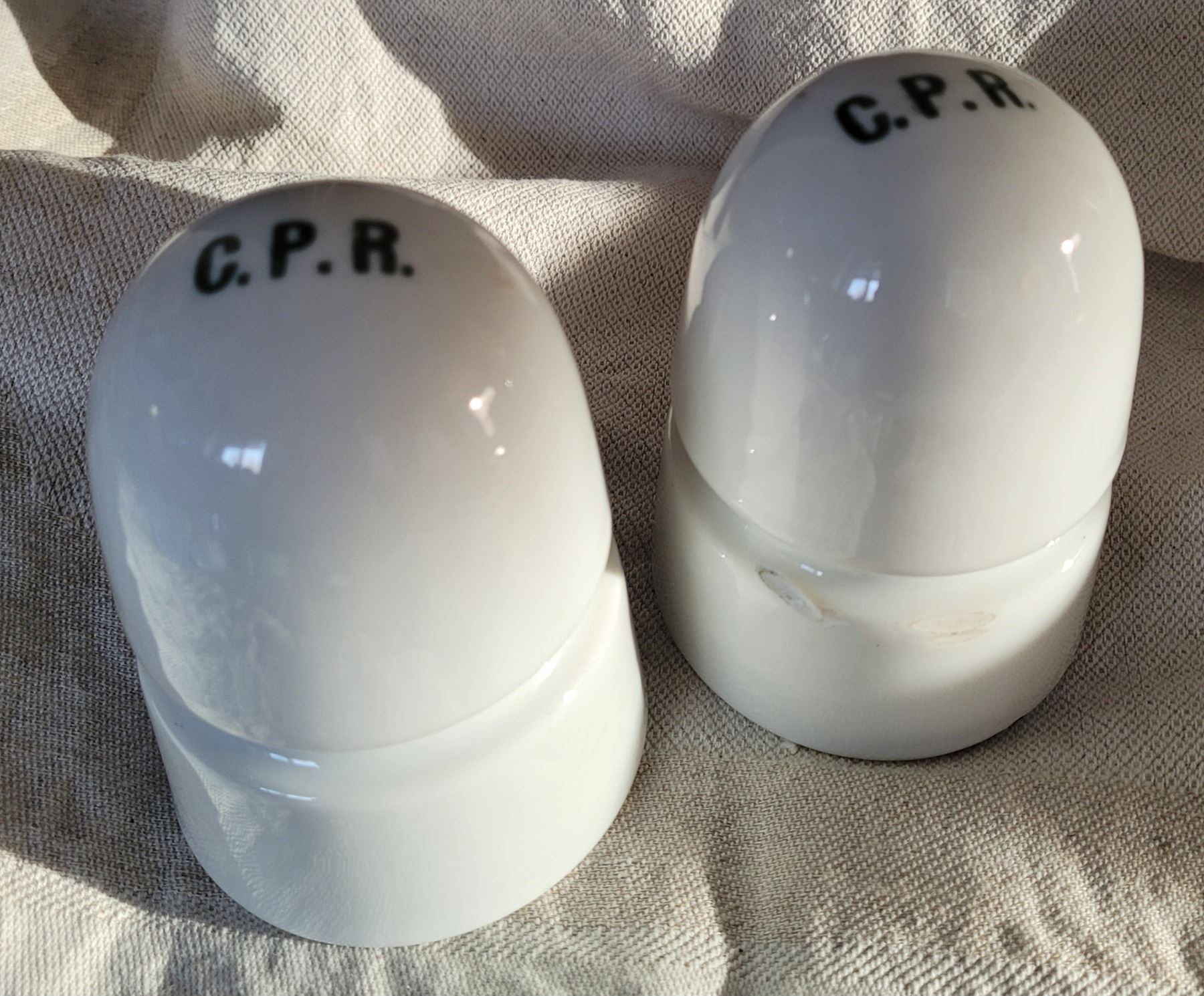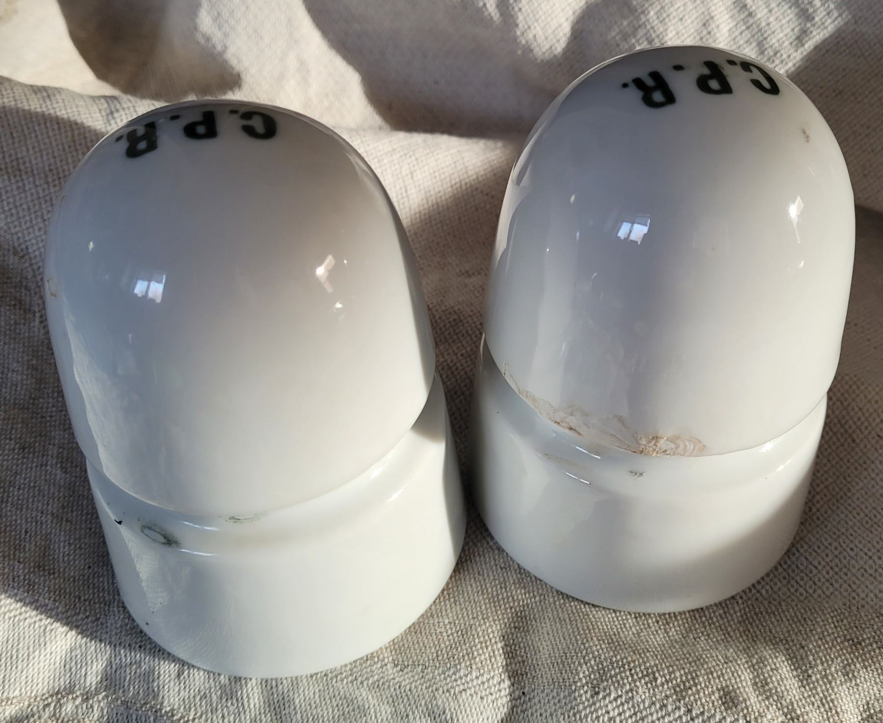 Two white CPR insulators with grey green C.P.R. lettering