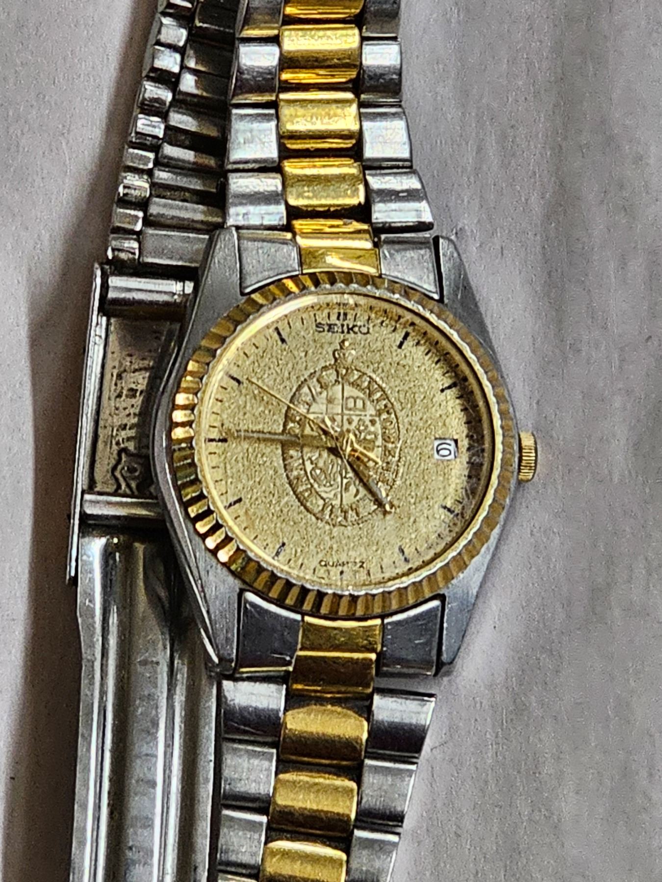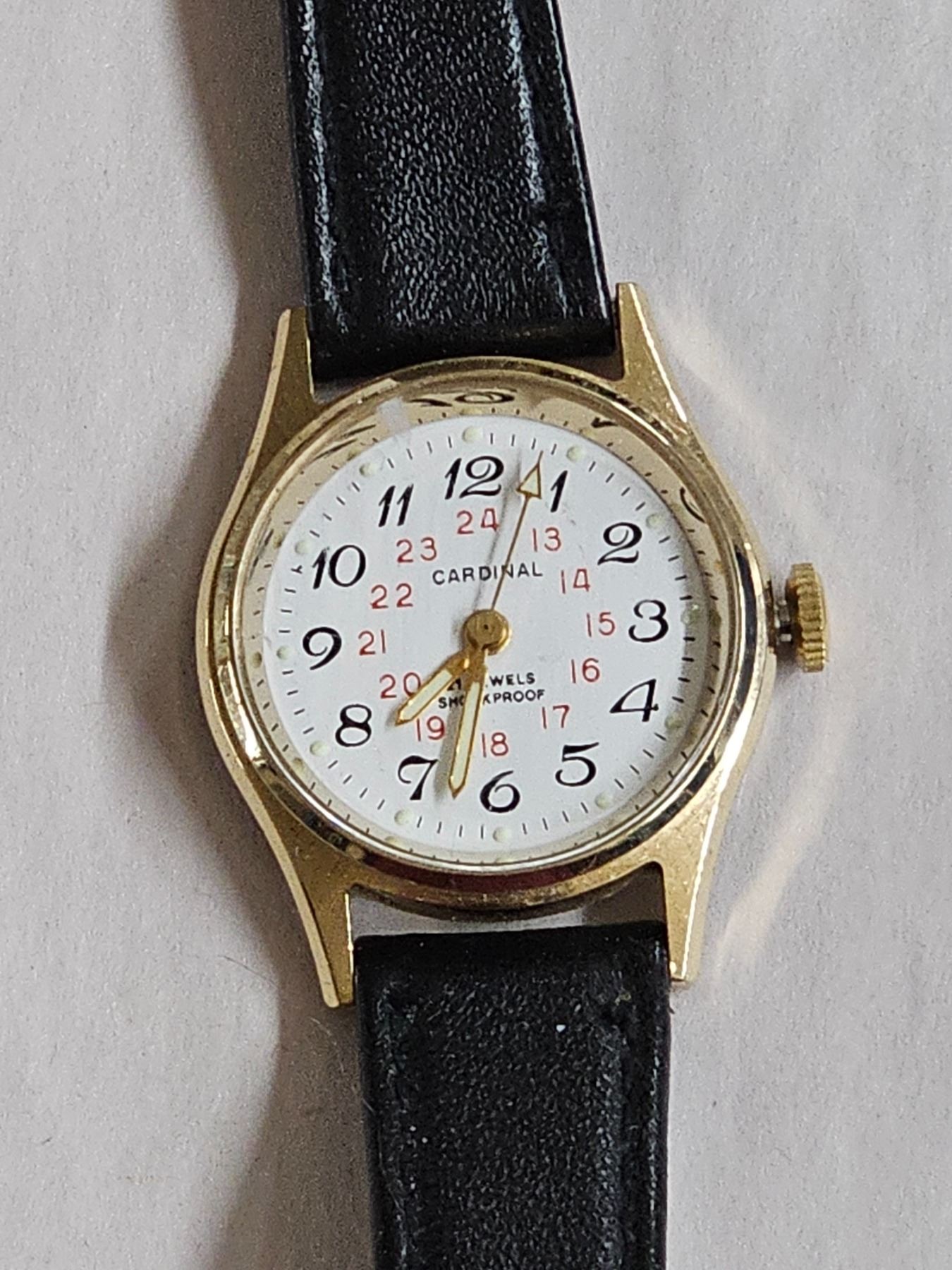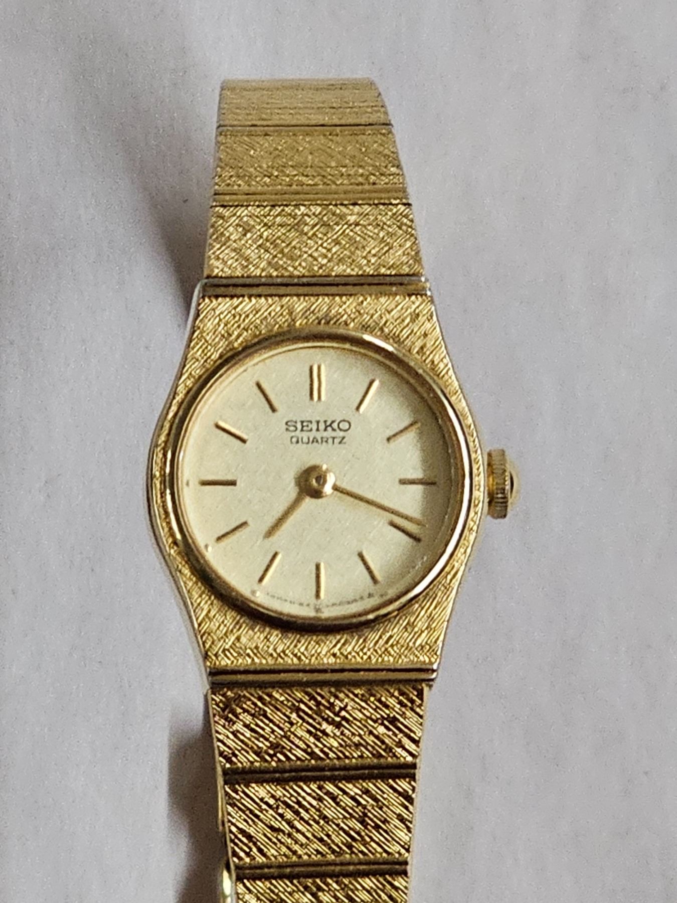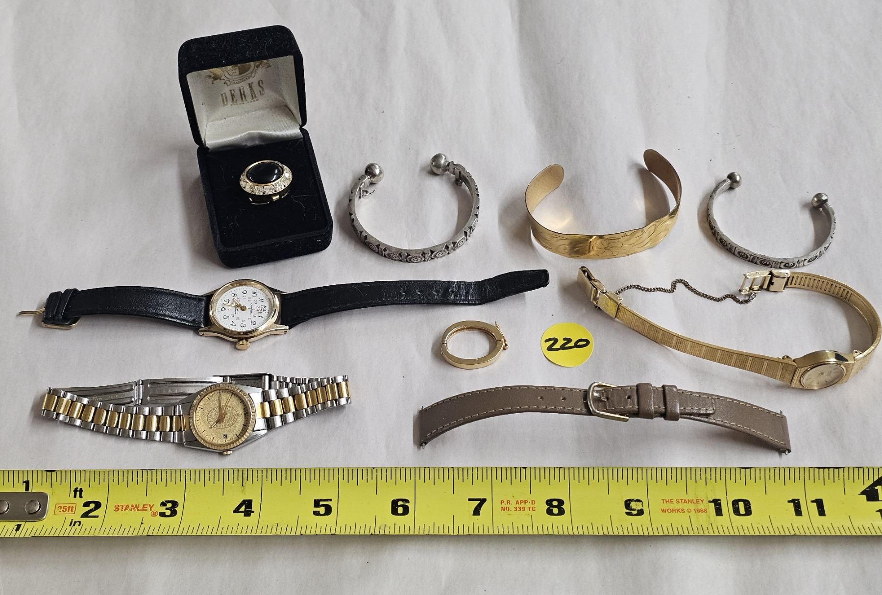 Two women’s Seiko Quartz watches (need new batteries)+ 1 Cardinal 21 Jewel Shock Proof windup watch. Plus taupe wrist strap for watch. Plus one decorative button cover in a jewellry box. Plus one gold coloured ring for holding medallions or rings. Plus gold coloured child’s bracelet + 2 silver coloured baby and toddler bracelets