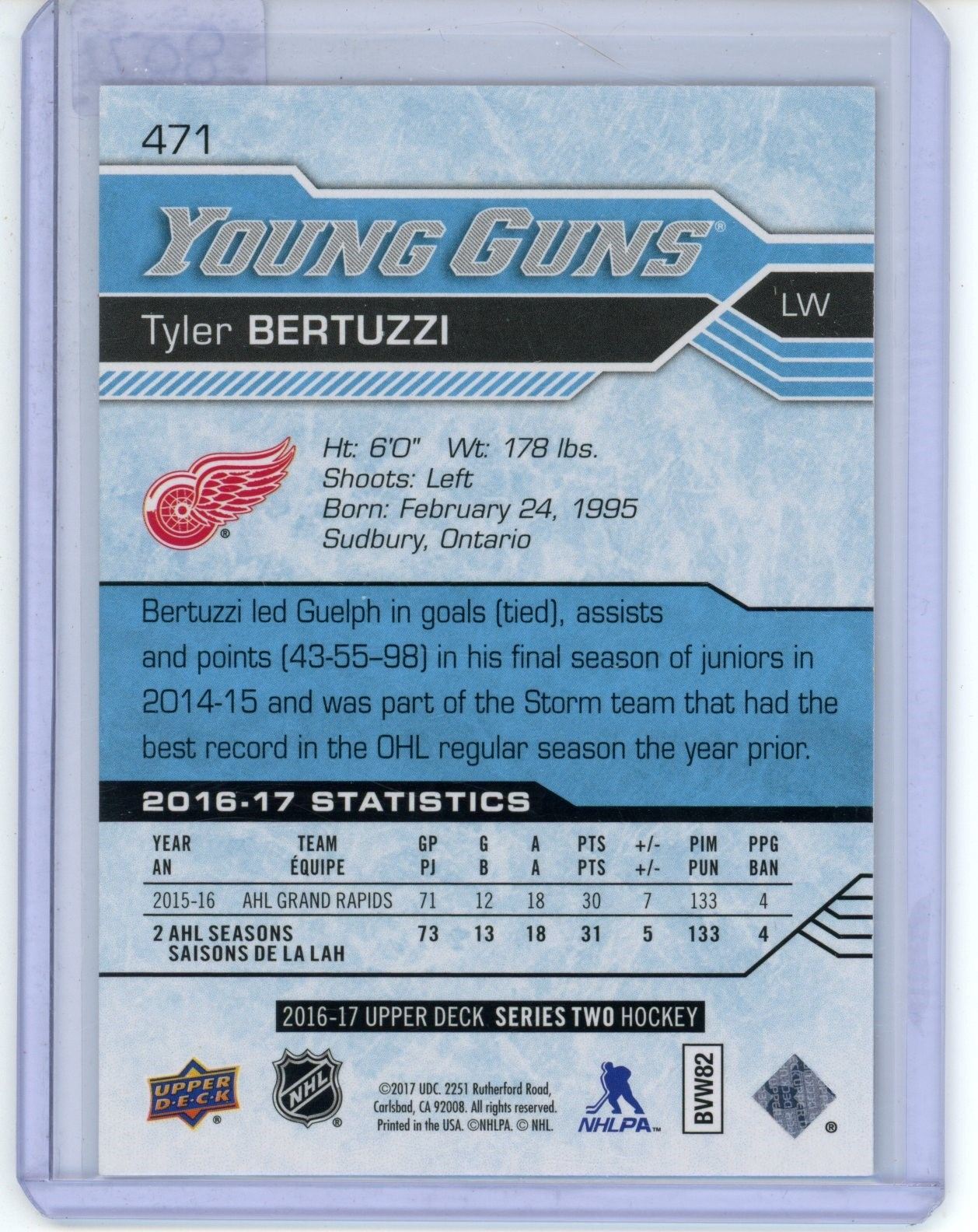 Tyler Bertuzzi Young Guns Hockey Card 2016-17 Upper Deck #471