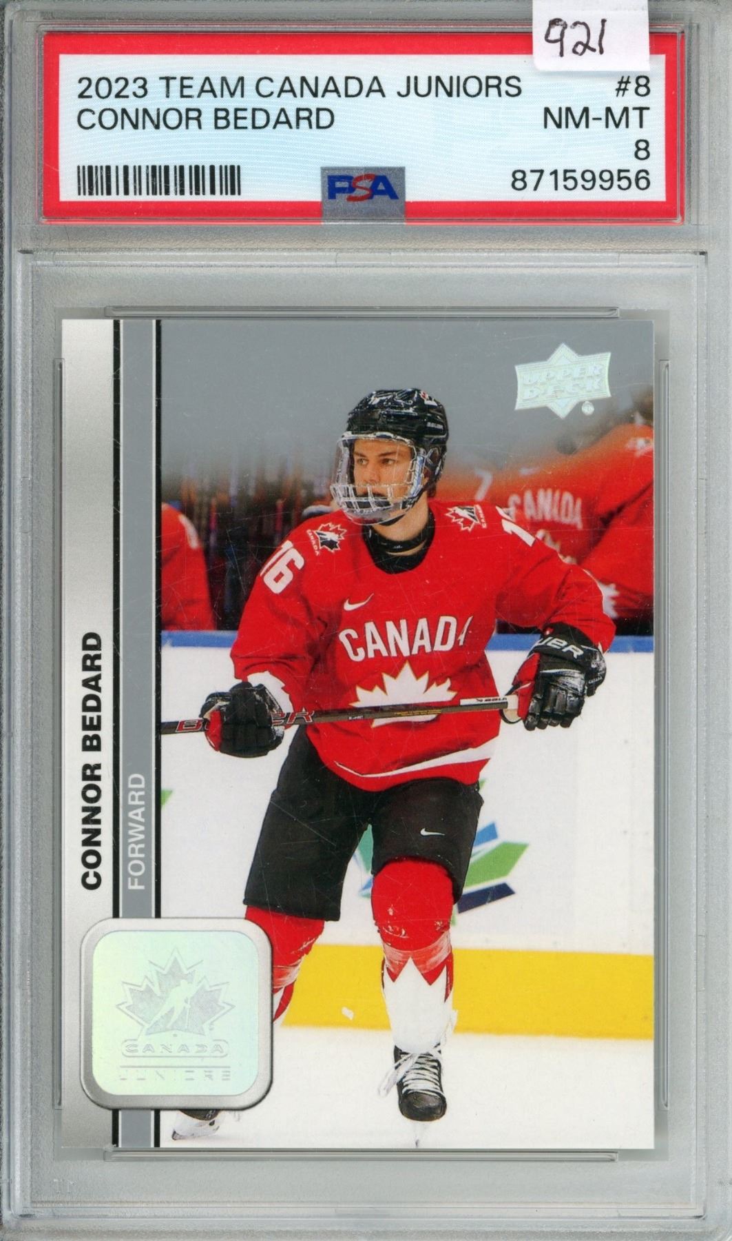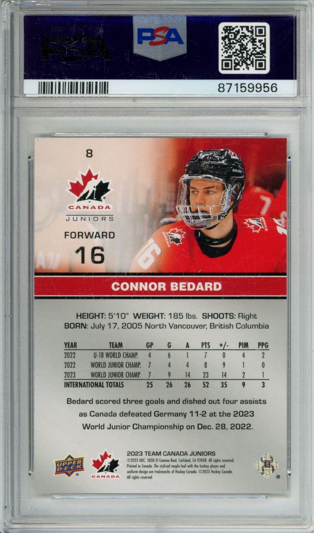 U.D. 2023 Connor Bedard Team Canada Juniors P.S.A. Graded 8.