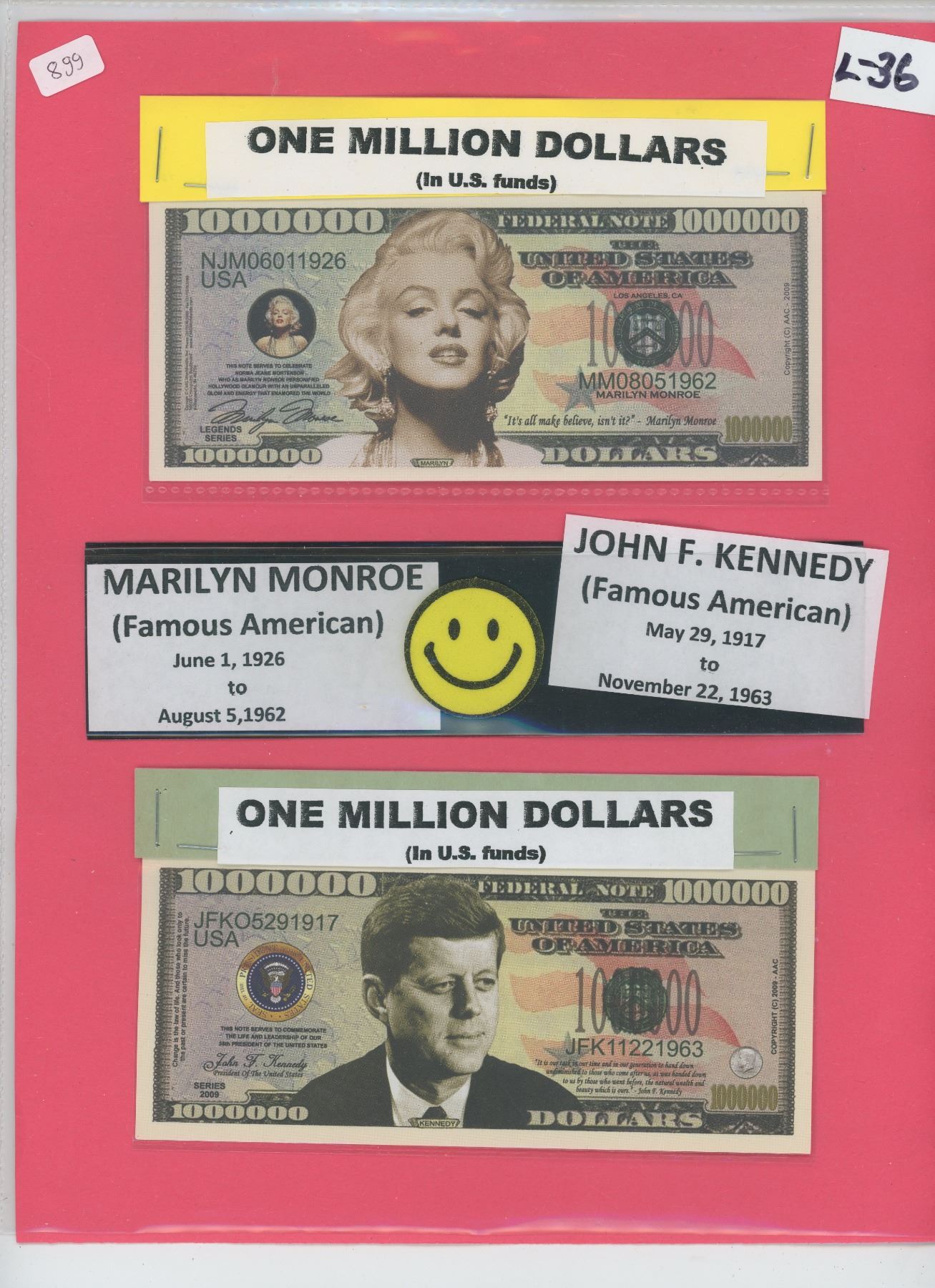 U.S. $1 Million Bills - Marilyn Monroe and John F. Kennedy - Have fun showing off as a millionaire!