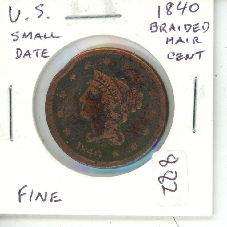 U.S. 1840 Braided Hair Large Cent. Small Date. F-12.