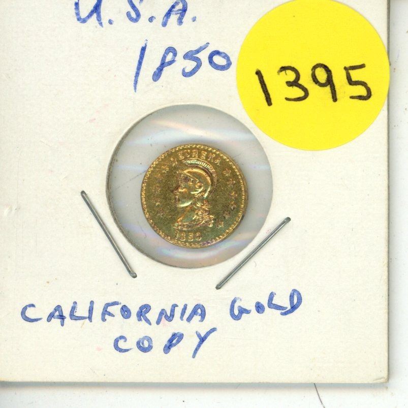 U.S. 1850 fake California gold $1. Eureka above helmeted soldier. This is not real gold. AU.