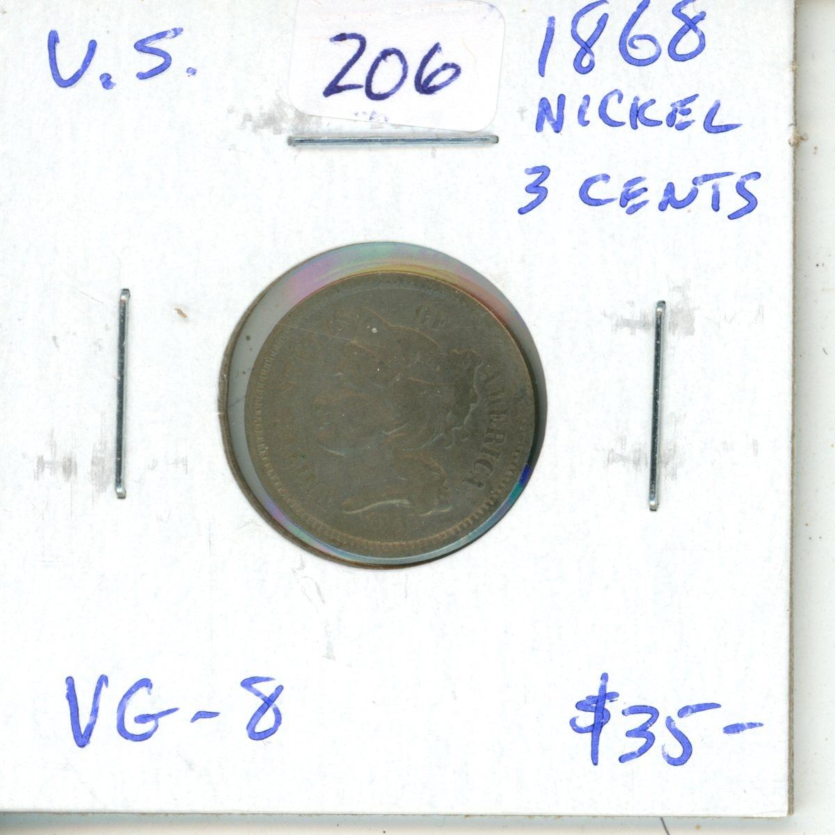 U.S. 1868 Nickel 3 Cents. Odd denomination. VG-8.