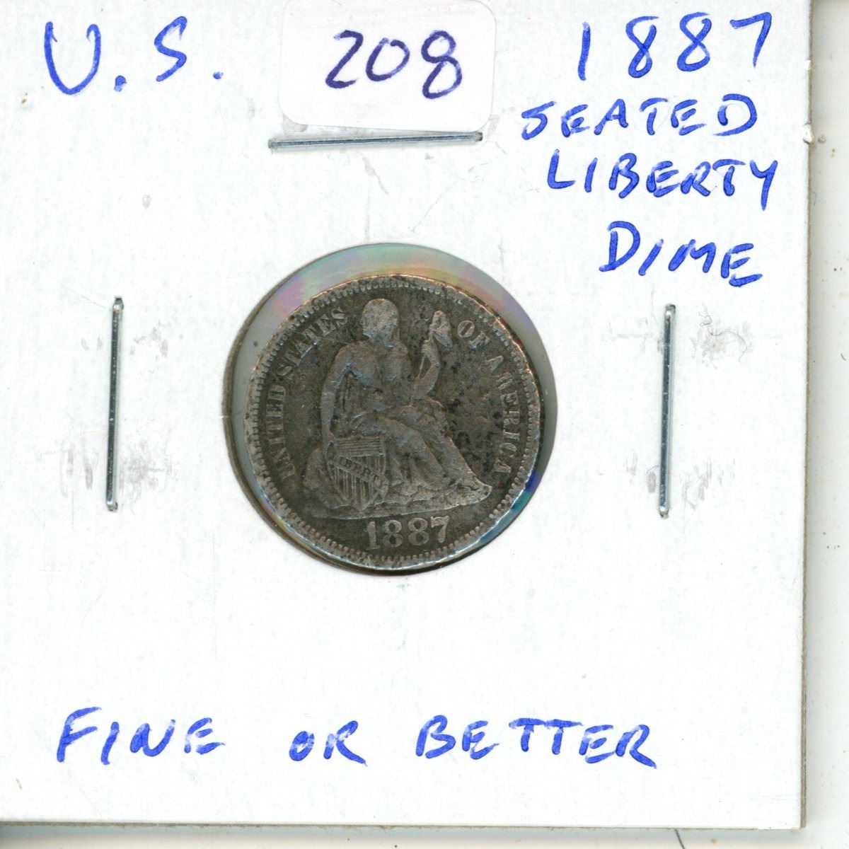 U.S. 1887 Seated Liberty Silver Dime. Fine or better.