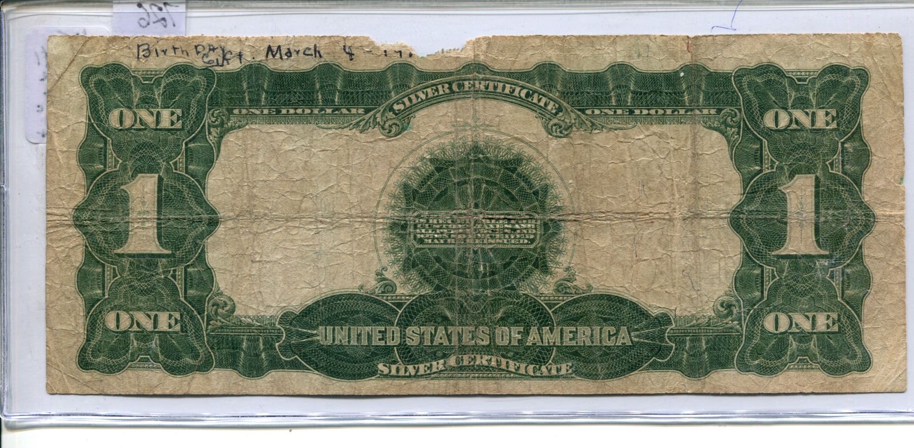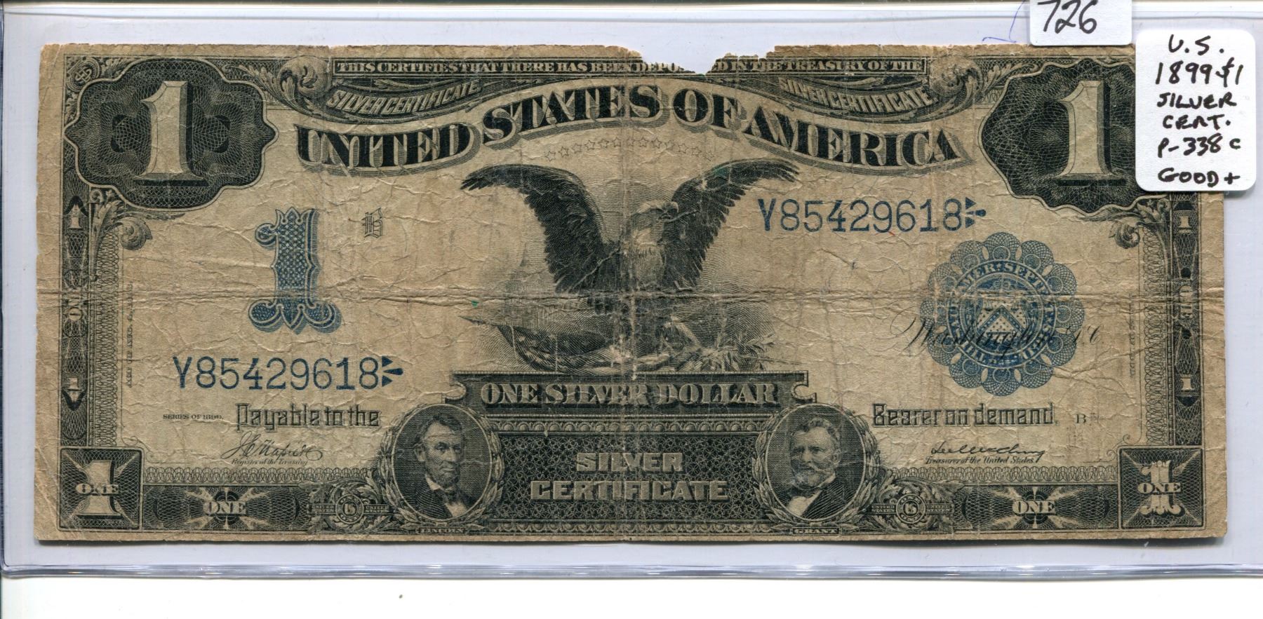 U.S. 1899 $1 Silver Certificate. Good for One Silver Dollar. Eagle, Lincoln & Grant. Blue Seal. Good+. Small Piece Missing. Scarce.