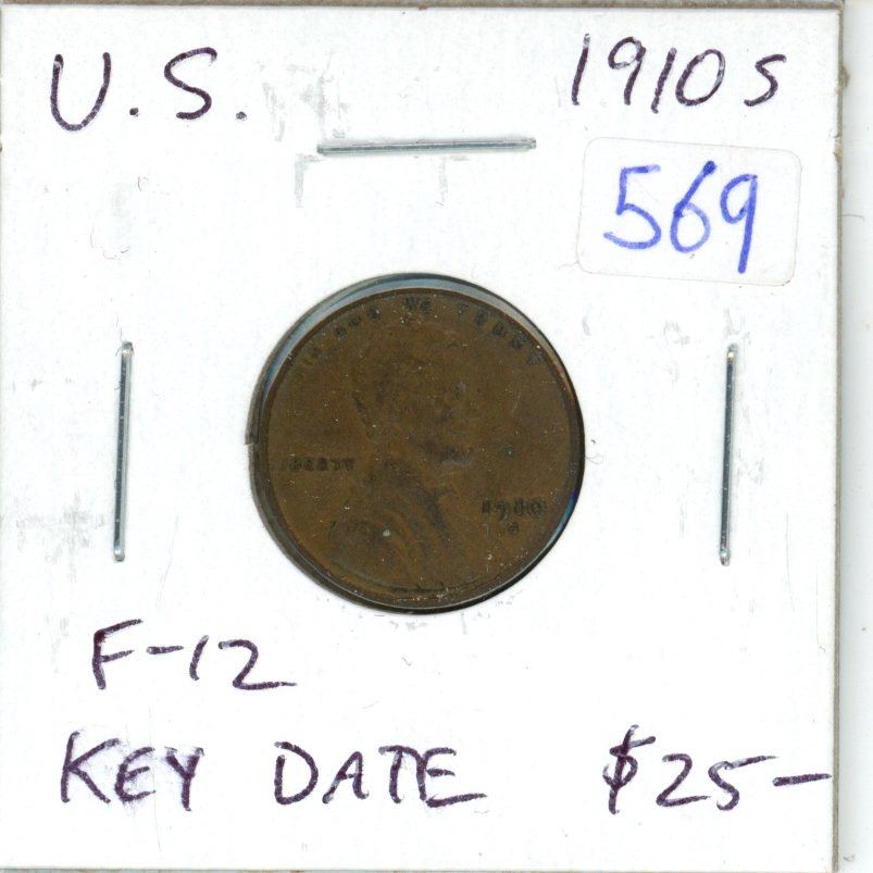 U.S. 1910S Lincoln Wheat Cent. San Francisco Mint. Key Date. F-12.