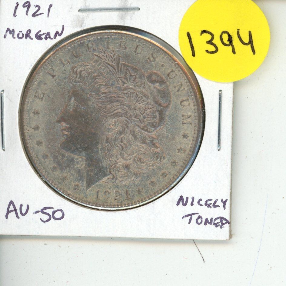 U.S. 1921 Morgan Silver Dollar. Philadelphia Mint. AU-50. Nicely Toned.