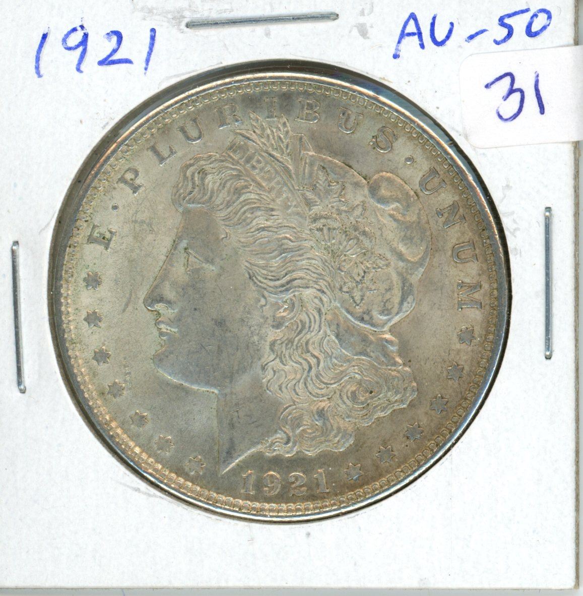U.S. 1921 Morgan Silver Dollar. Philadelphia Mint. AU-50.