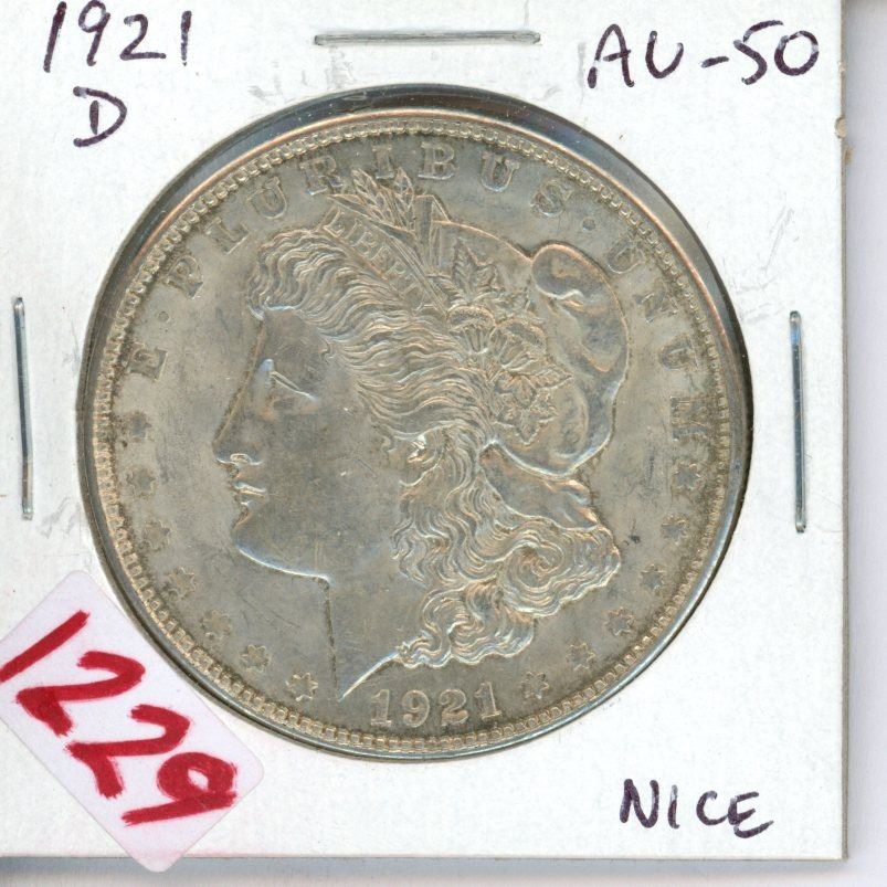 U.S. 1921D Morgan Silver Dollar. Denver Mint. AU-50.