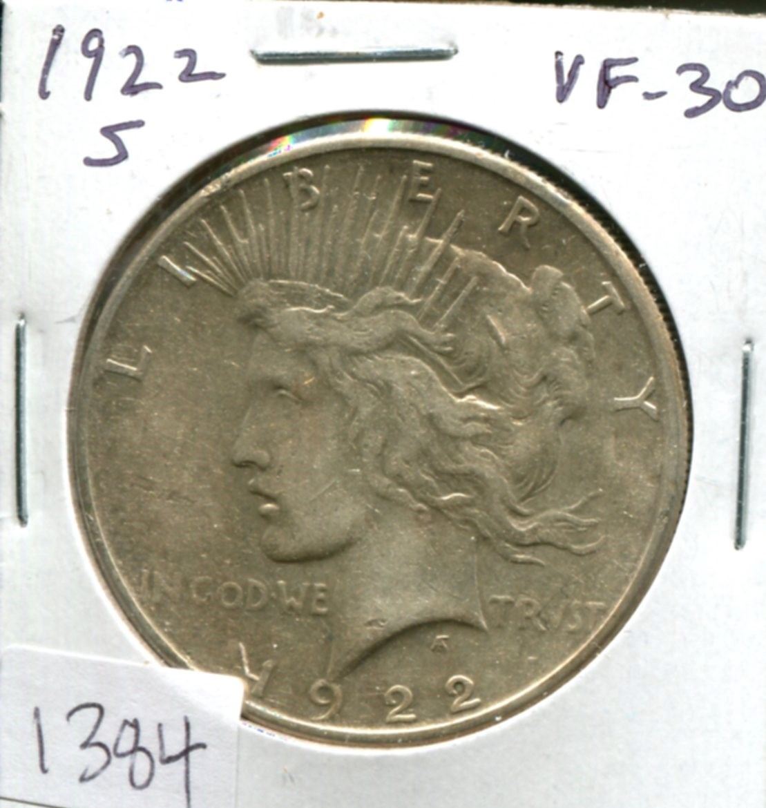 U.S. 1922 S Peace Silver Dollar. San Francisco Mint. 100 years old. VF-30.
