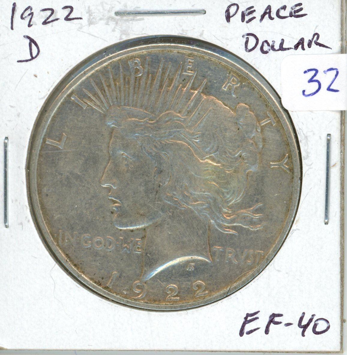 U.S. 1922D Peace Silver Dollar. Denver Mint. EF-40.