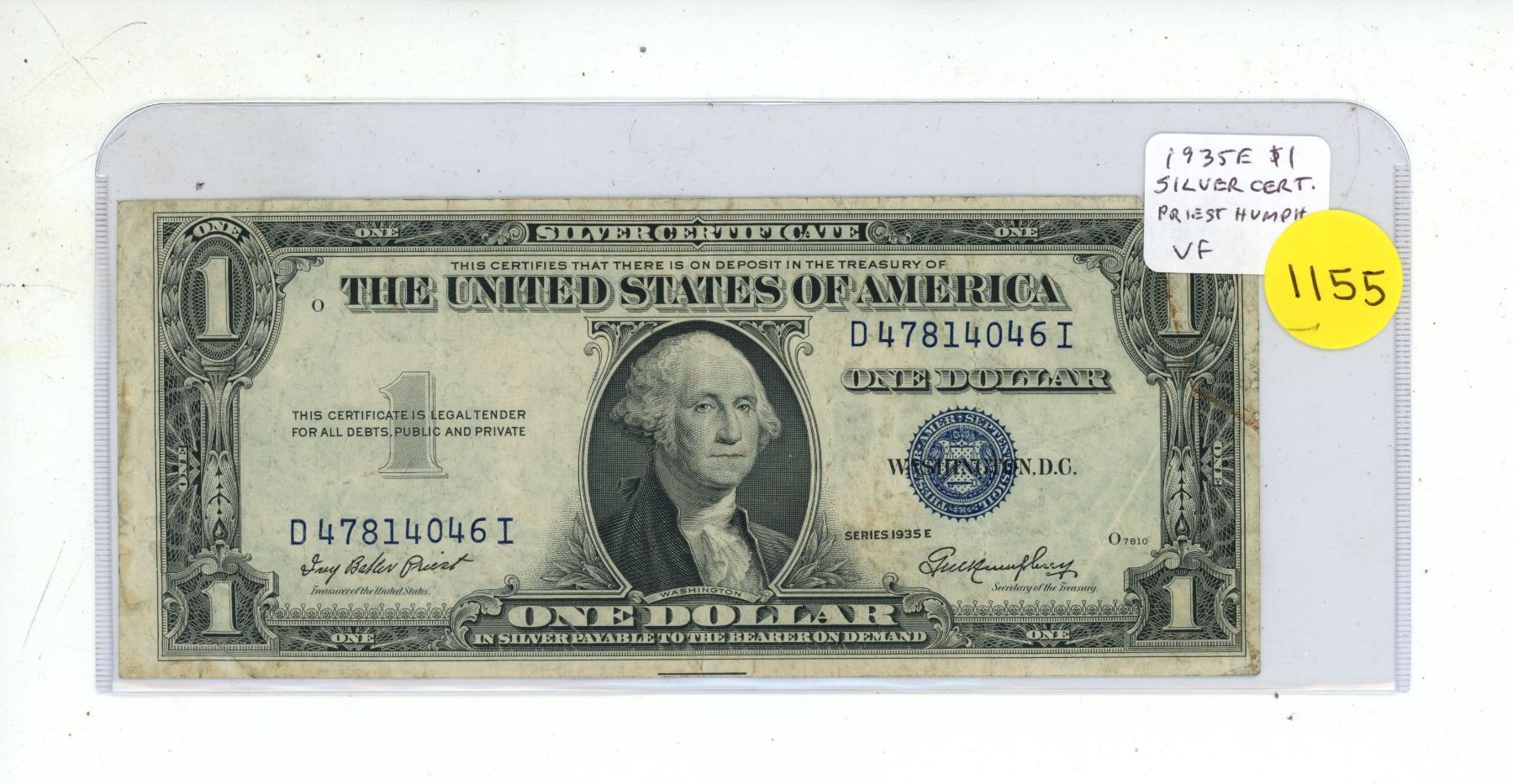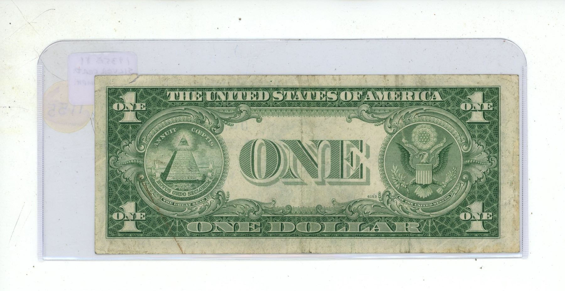 U.S. 1935E $1 Silver Certificate. Blue Seal. At one time you could go to a U.S. bank and demand a silver dollar in exchange. VF.