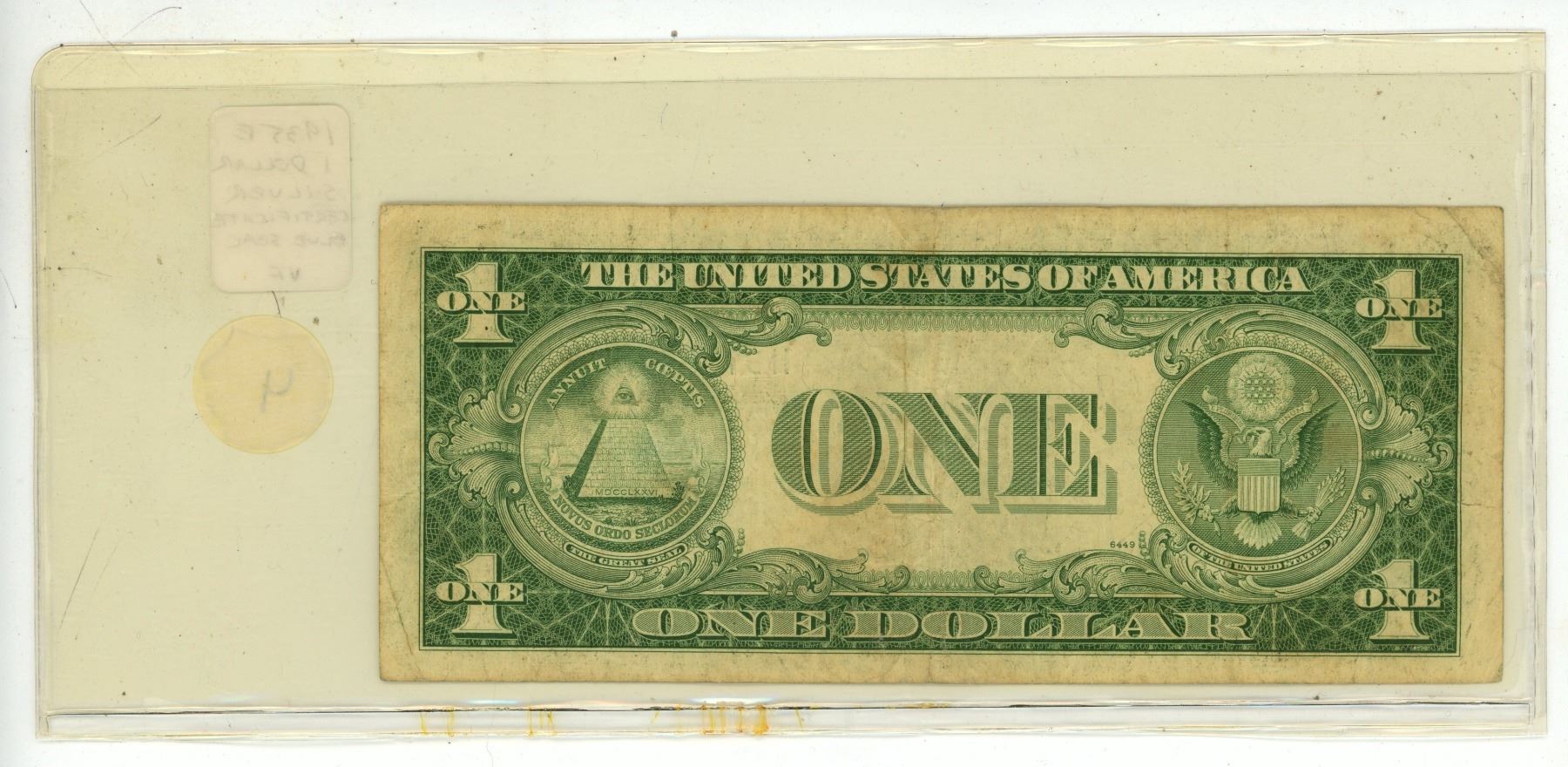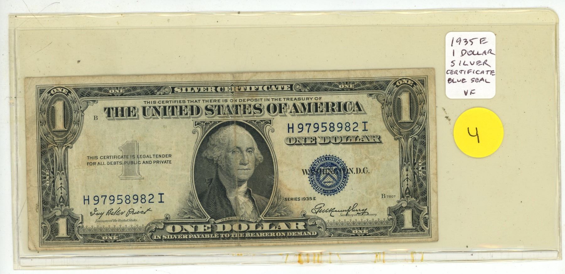 U.S. 1935E $1 Silver Certificate. George Washington. Blue Seal. At one time, you could take this to a U.S. bank and demand a Silver Dollar in exchange. VF.