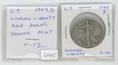U.S. 1943D Silver Walking Liberty Half Dollar. Denver Mint. F-12.