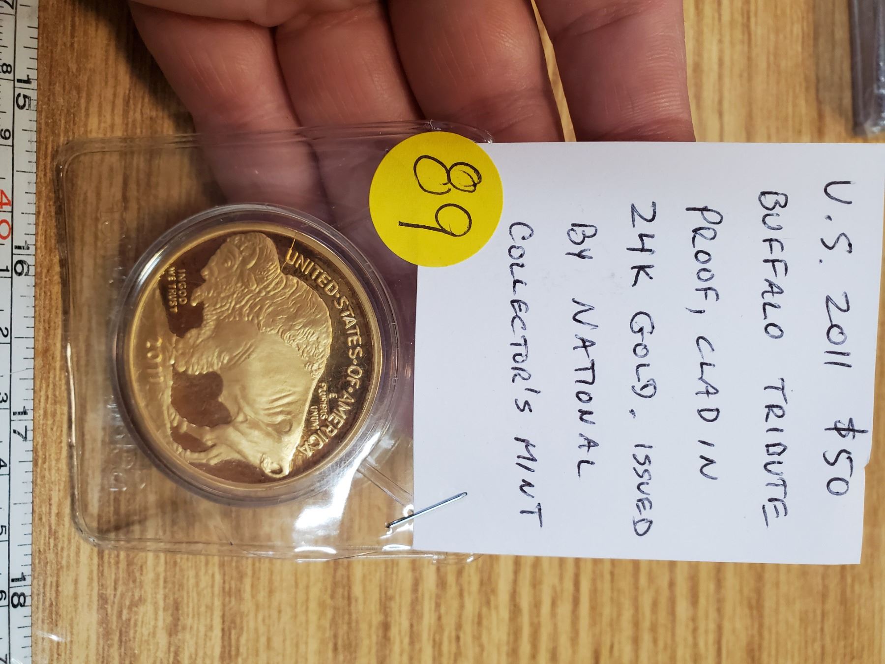 U.S. 2011 $50 Buffalo Tribute Proof, clad in 24 karat gold. Issued by the National Collector’s Mint.