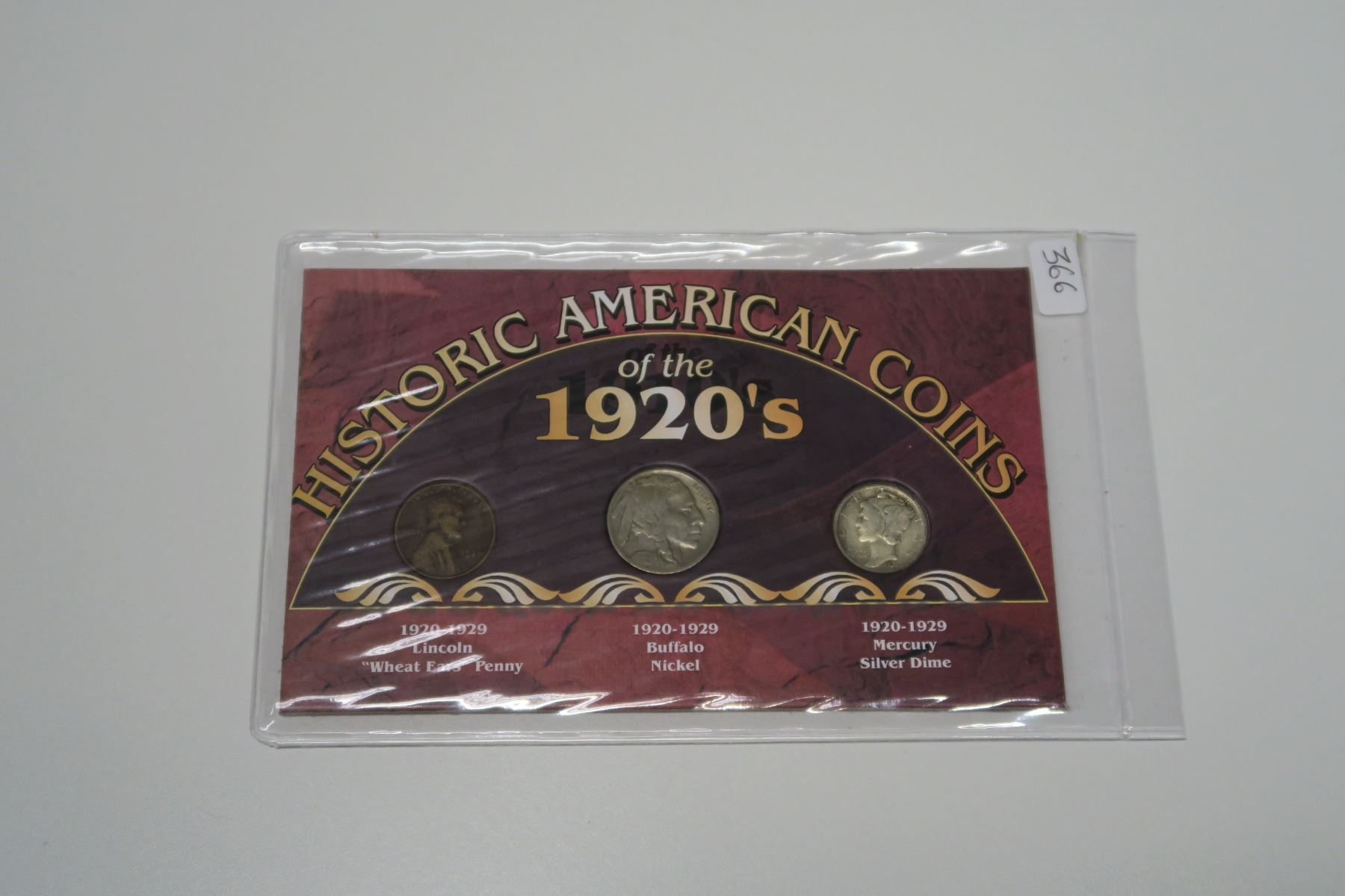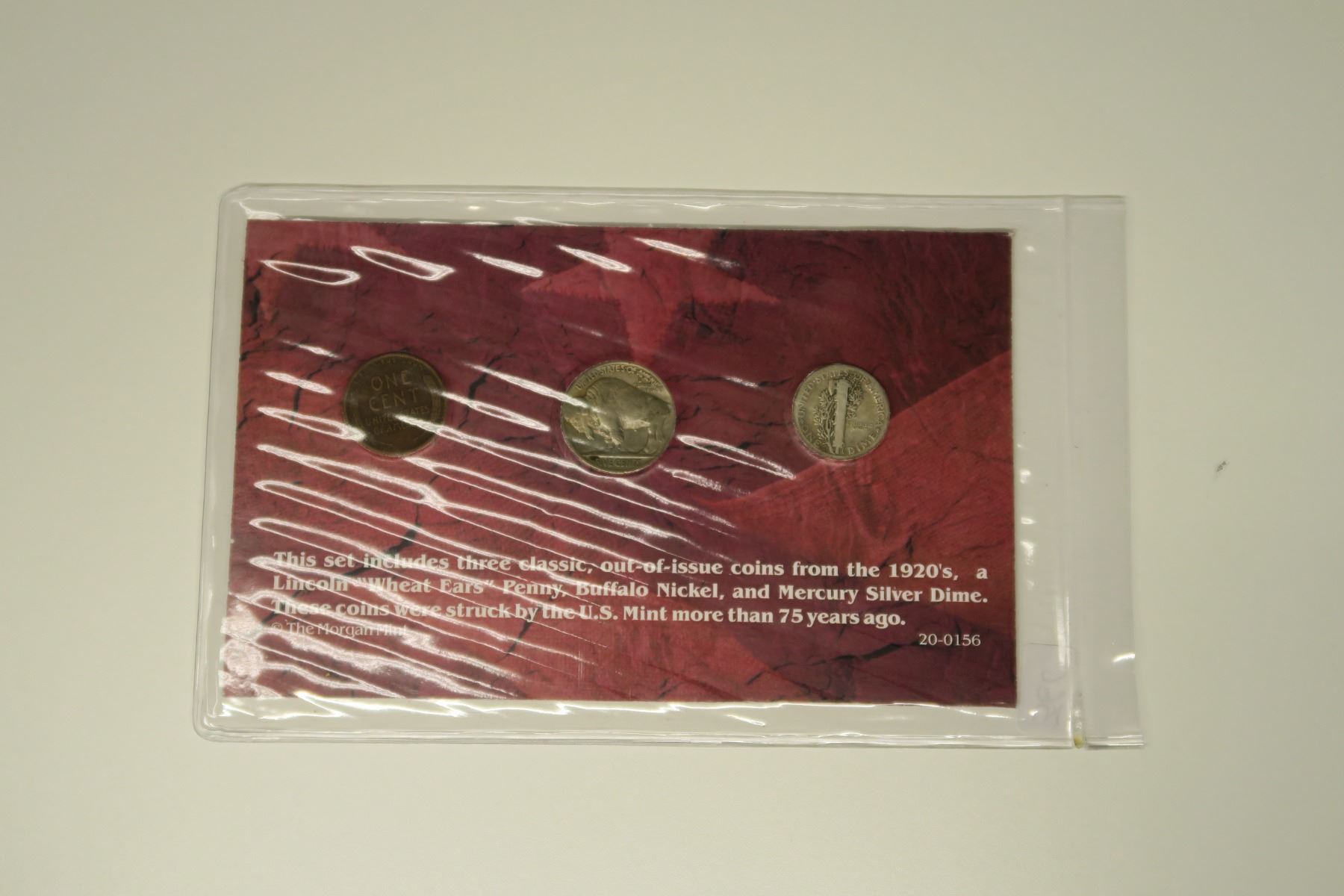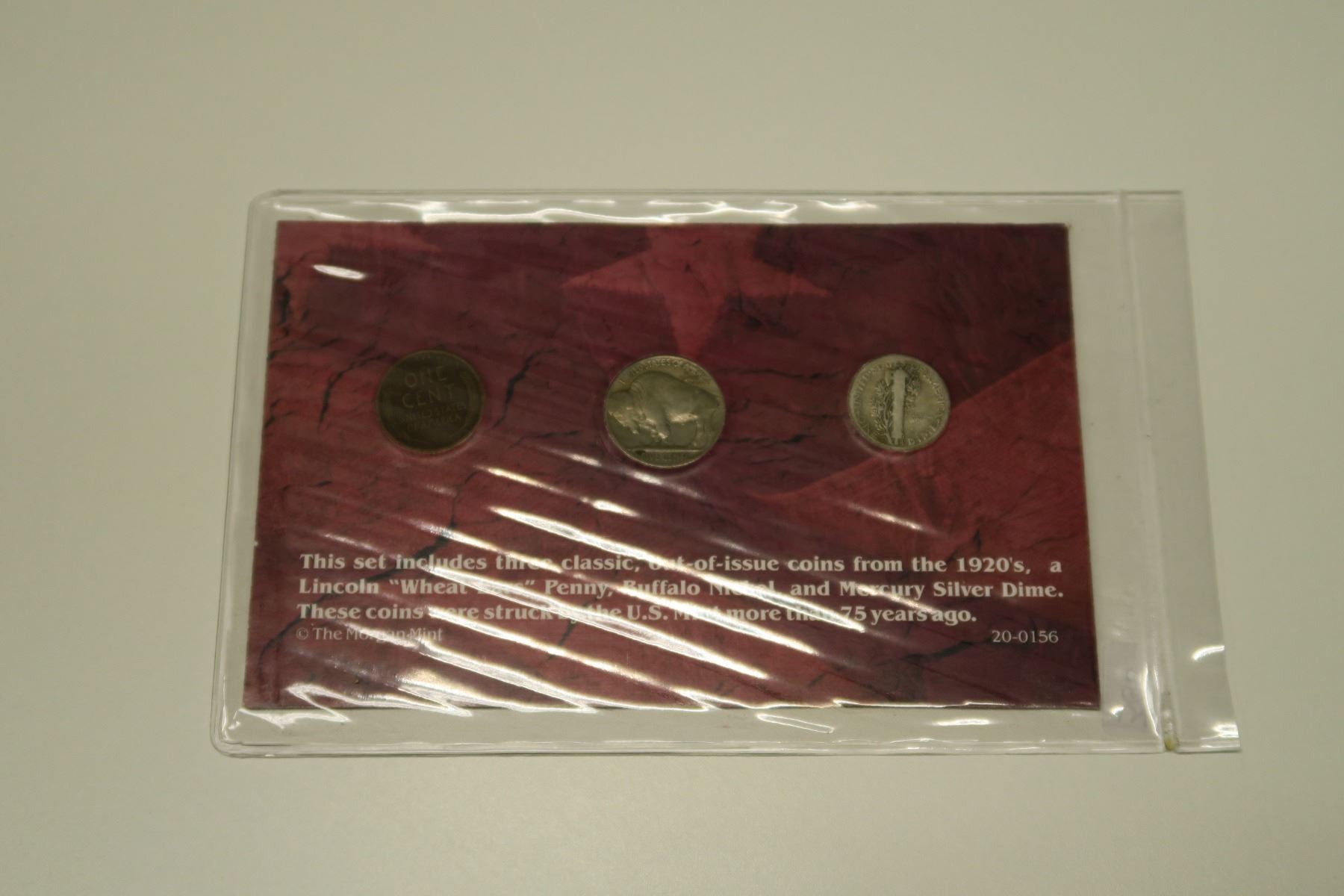 U.S. Historic American Coins of the 1920s. 1927 Lincoln Wheat Ears Cent, 1925 Buffalo Nickel & 1923 Mercury Silver Dime. Housed in a Morgan Mint folder.