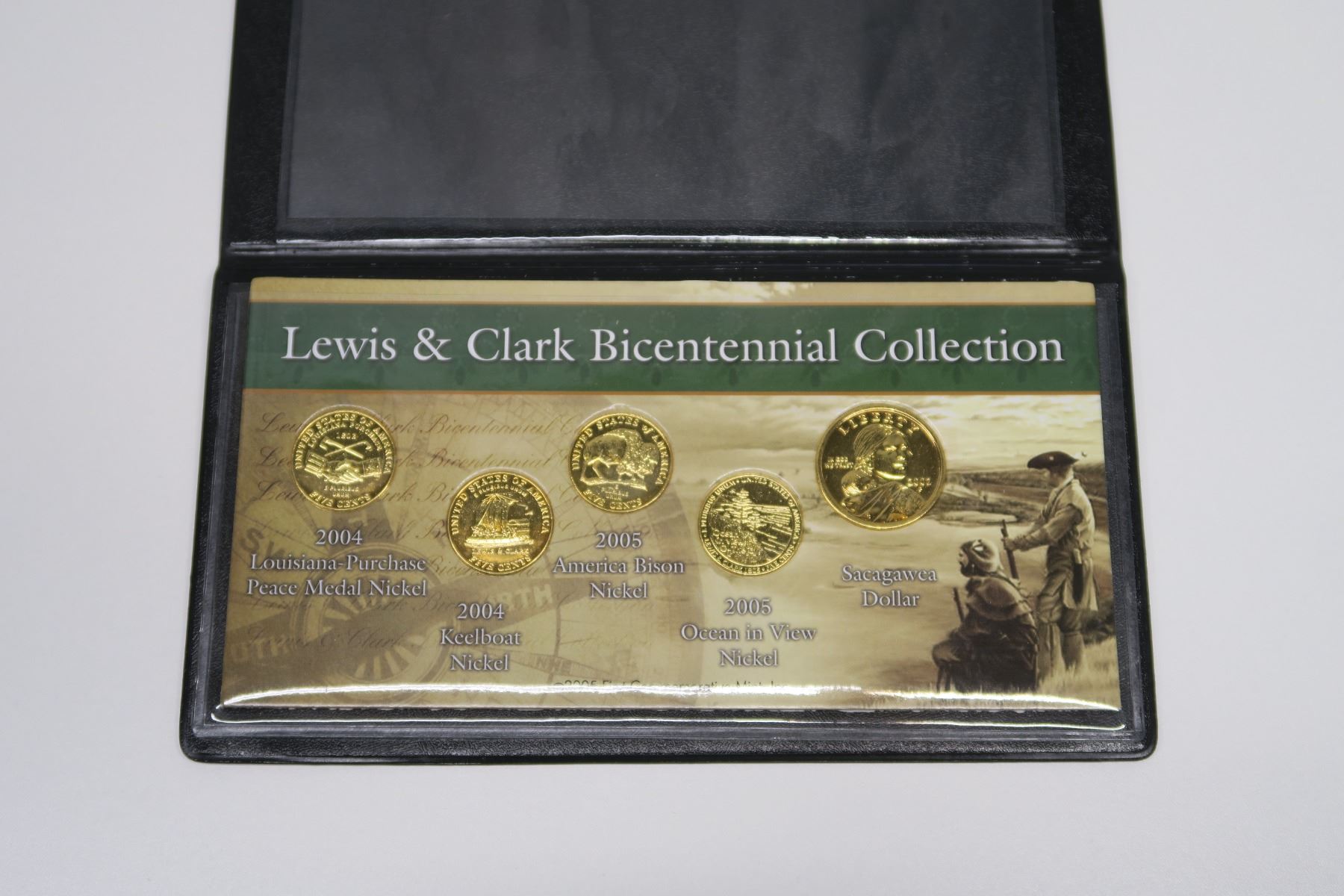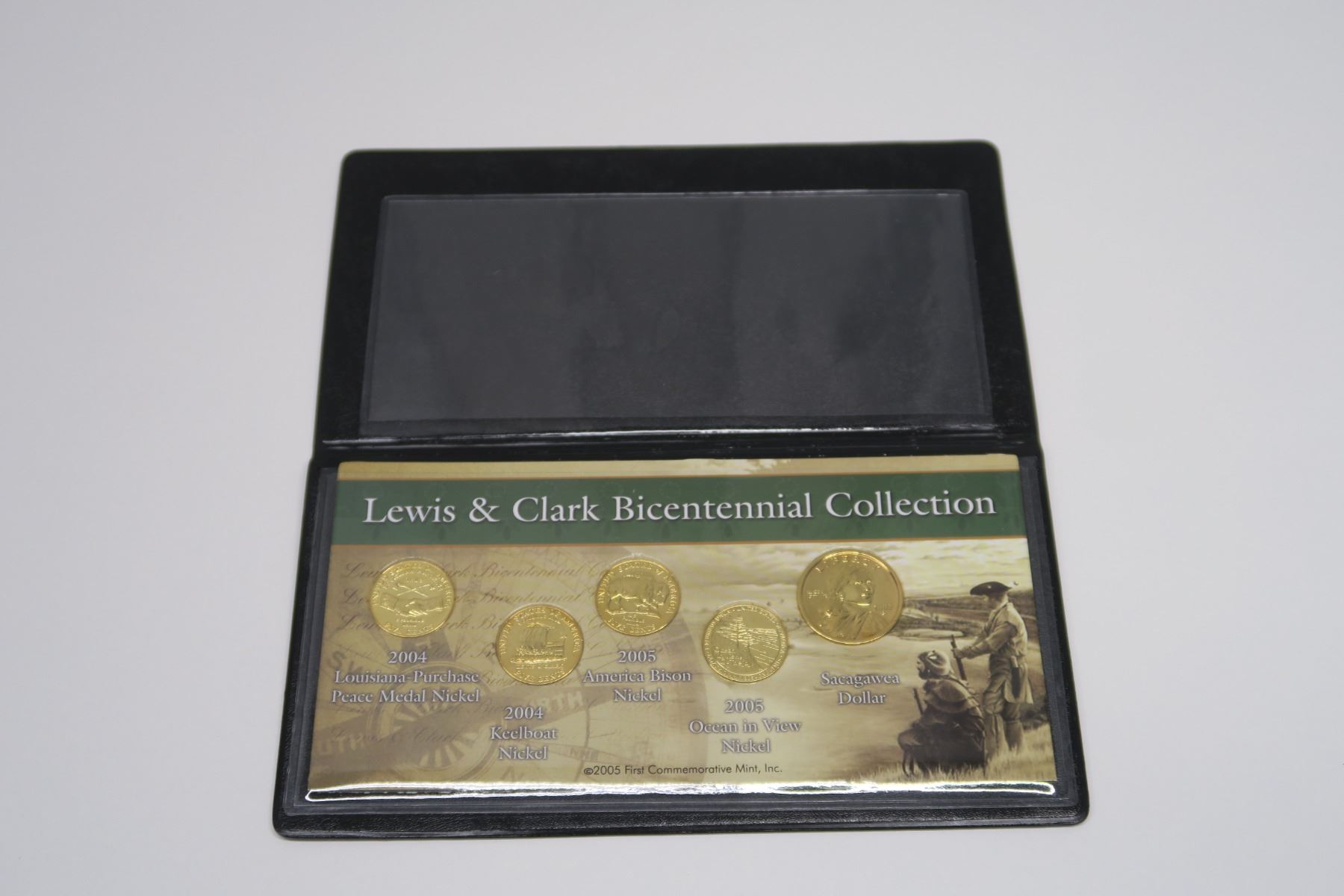 U.S. Lewis & Clark Bicentennial Collection. Gold-Plated Set of 5 coins including Louisiana Purchase Peace Medal Nickel, Keelboat Nickel, Bison Nickel, Ocean View Nickel & Sacagawea Dollar. Housed in a First Commemorative Mint folder.