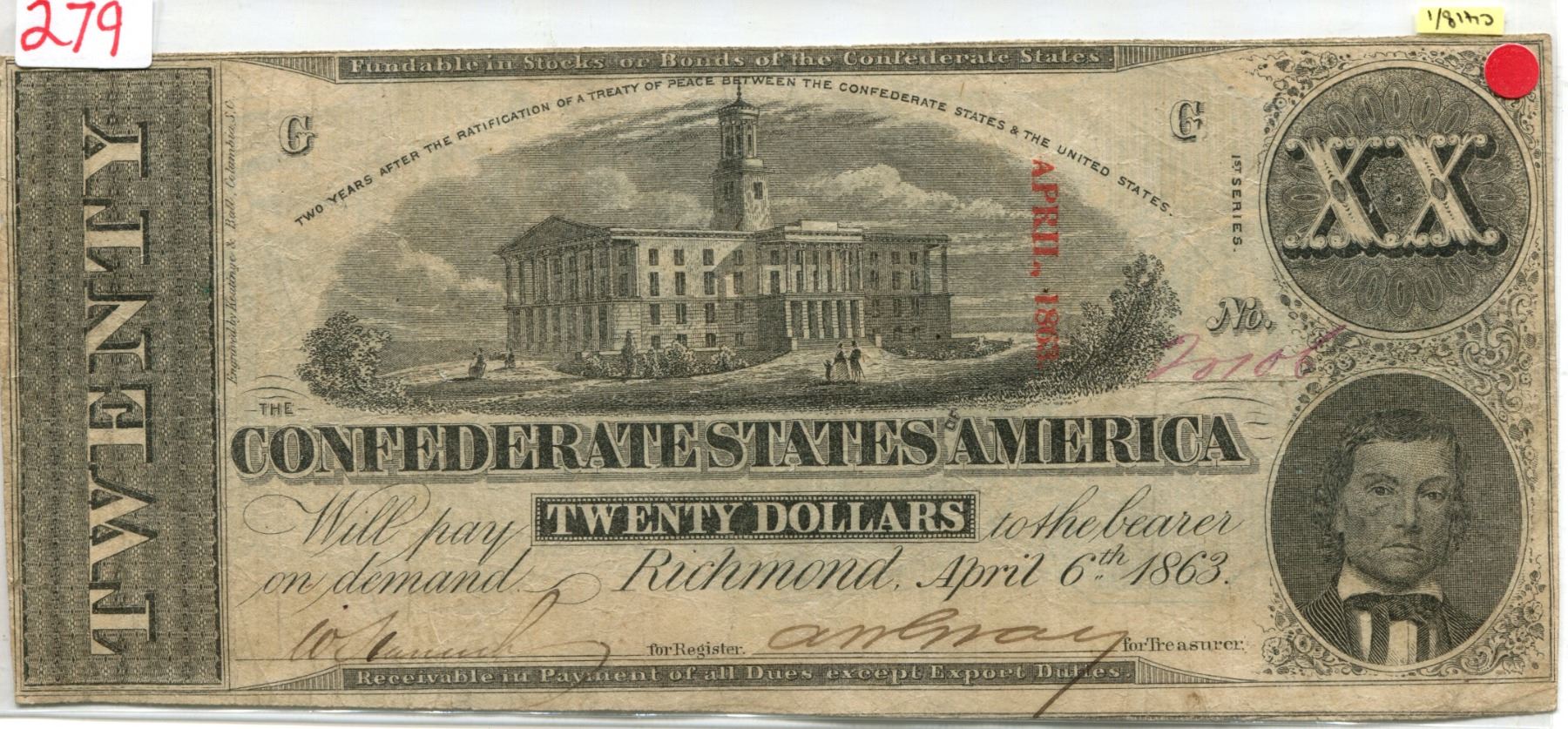 U.S. confederate Richmond APR 1863 $20.00 note V.F cond.